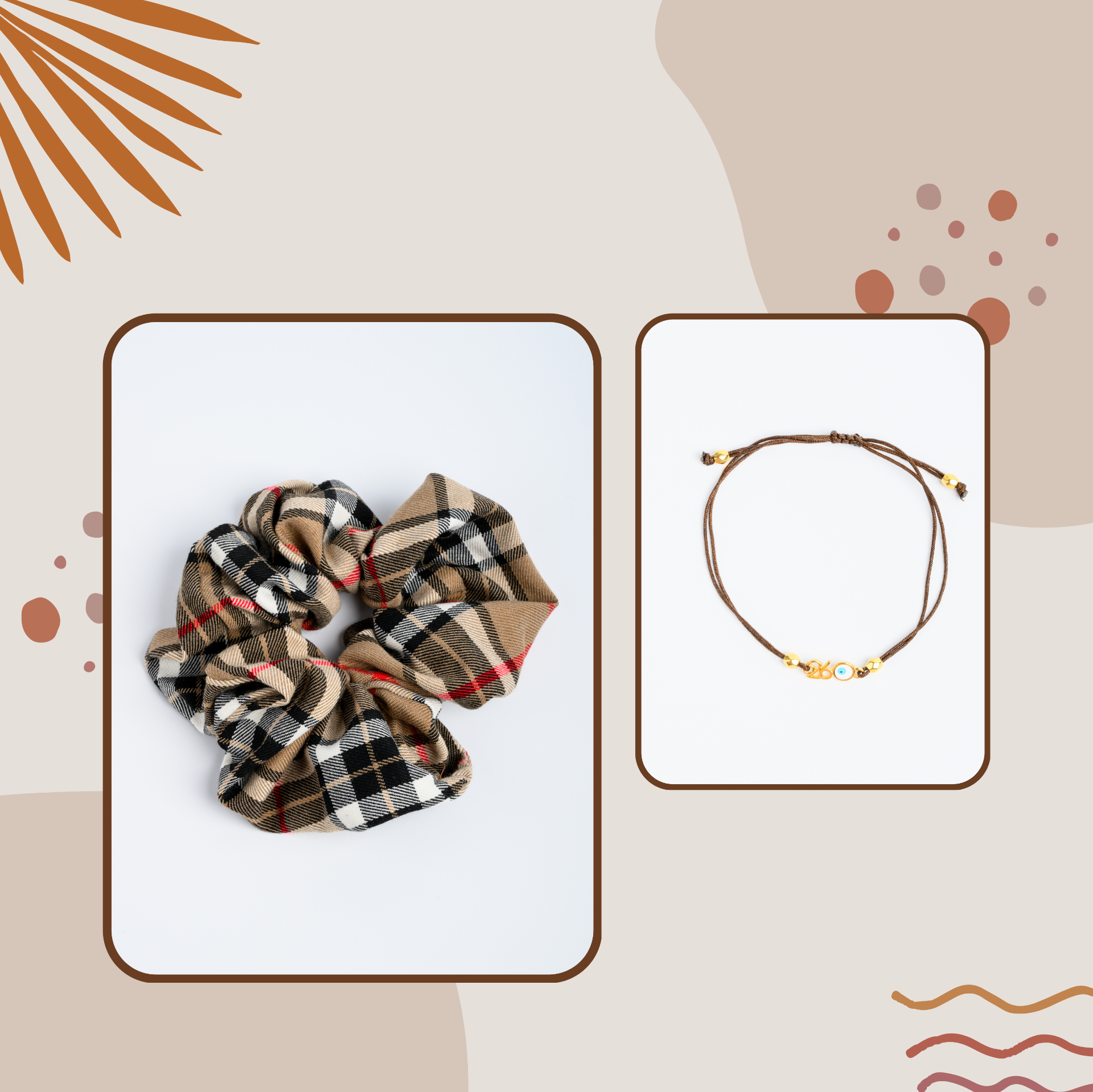 Σετ βραχιόλι και λαστιχάκι μπεζ καρό
