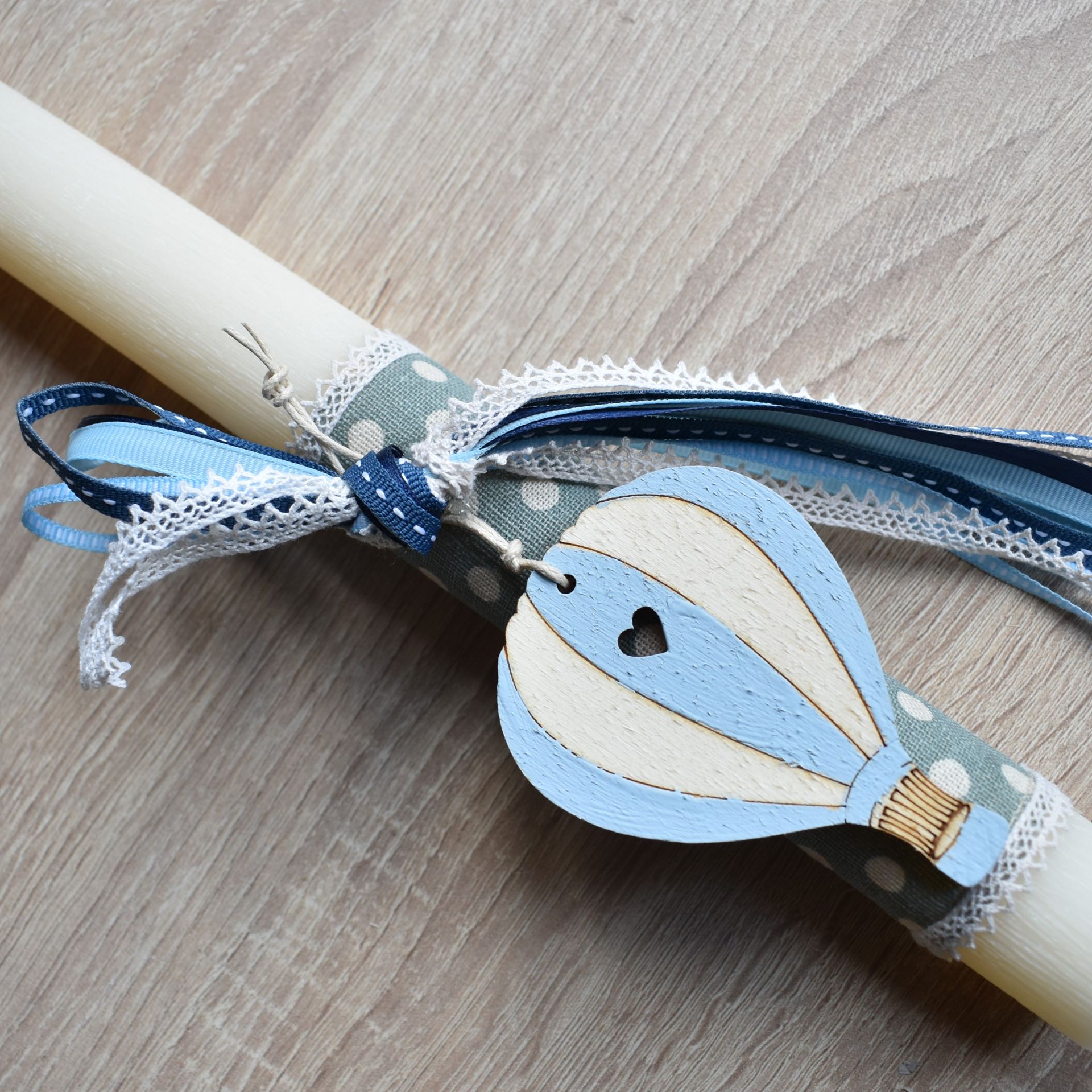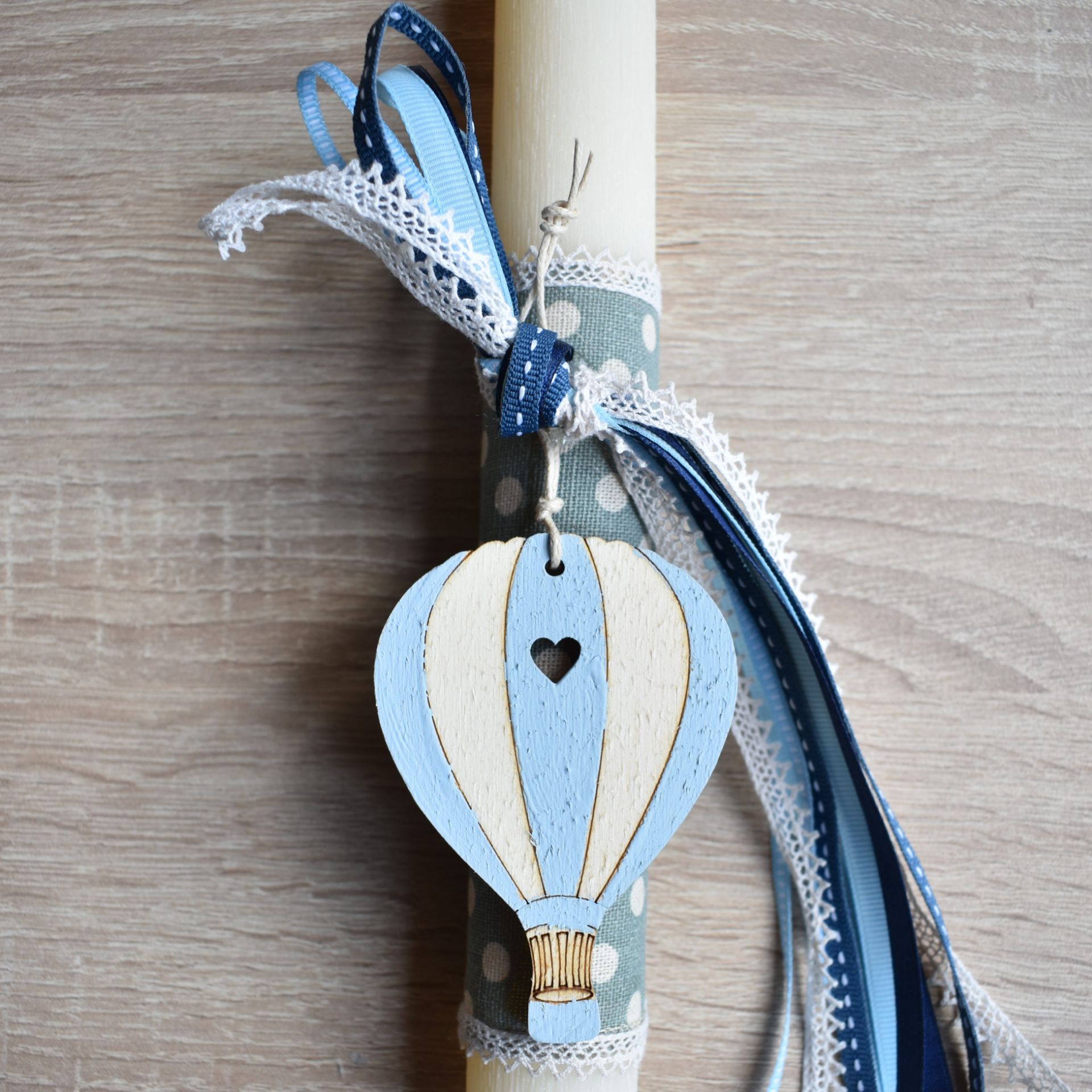Πασχαλινή λαμπάδα διακοσμημένη με ξύλινο αερόστατο