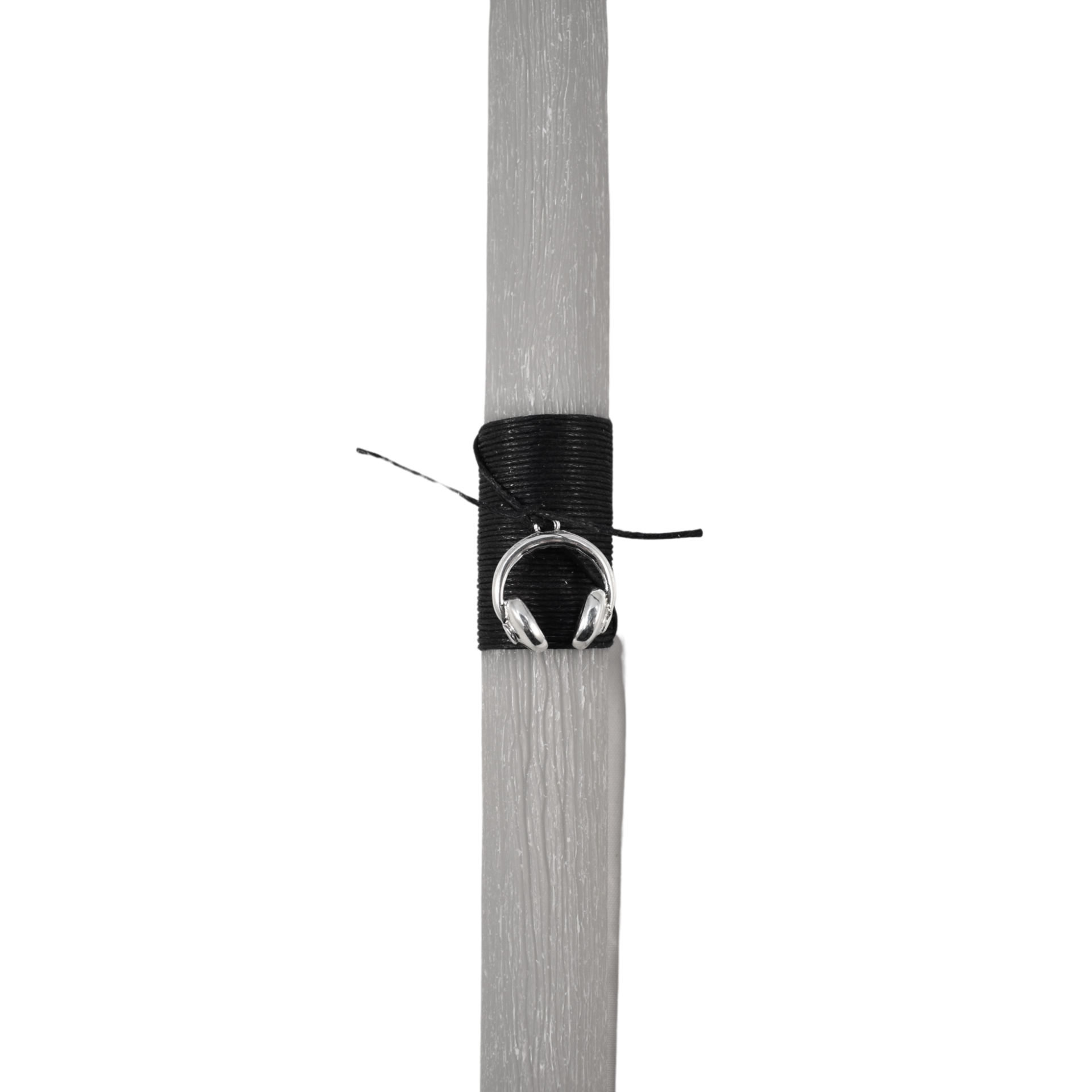 Χειροποίητη γκρι πασχαλινή λαμπάδα με μεταλλικά ακουστικά, εμπνευσμένη από τη μουσική, την προσωπική έκφραση και τον σύγχρονο τρόπο ζωής. Τα ακουστικά αποδίδονται ως καθαρό μεταλλικό στοιχείο που προσθέτει μοντέρνο χαρακτήρα στη λαμπάδα, χωρίς να αλλοιώνει τη λιτή και ισορροπημένη αισθητική της.