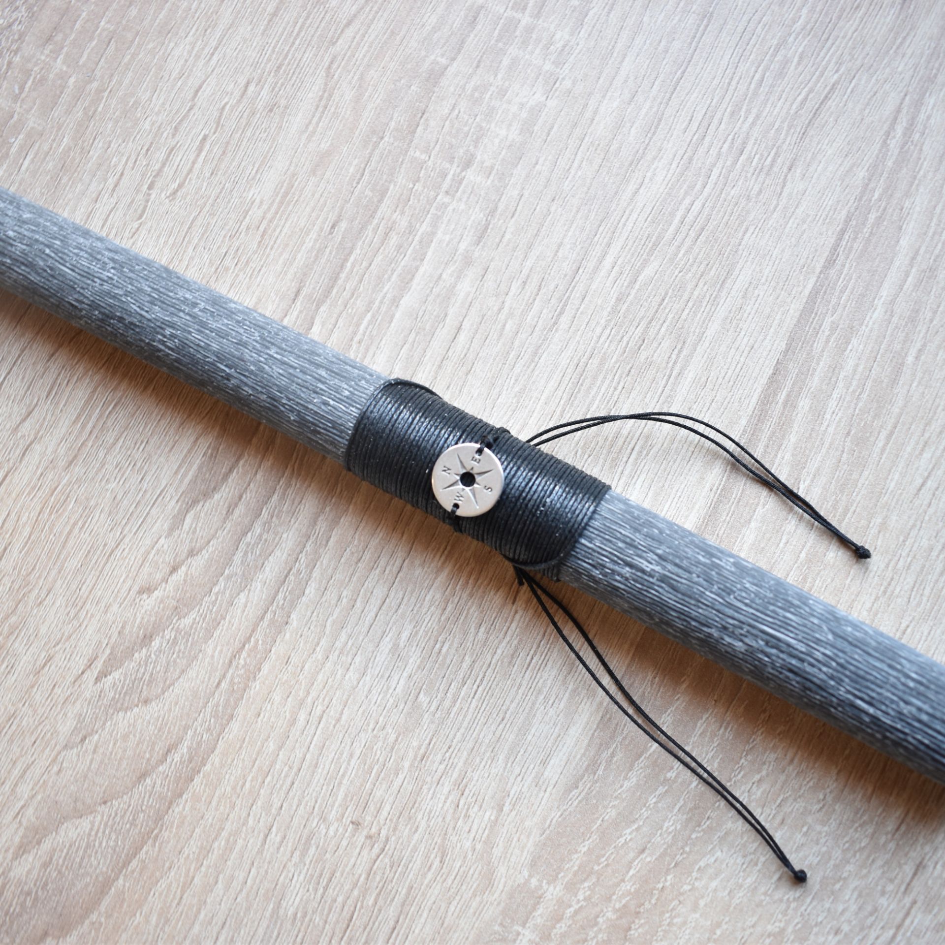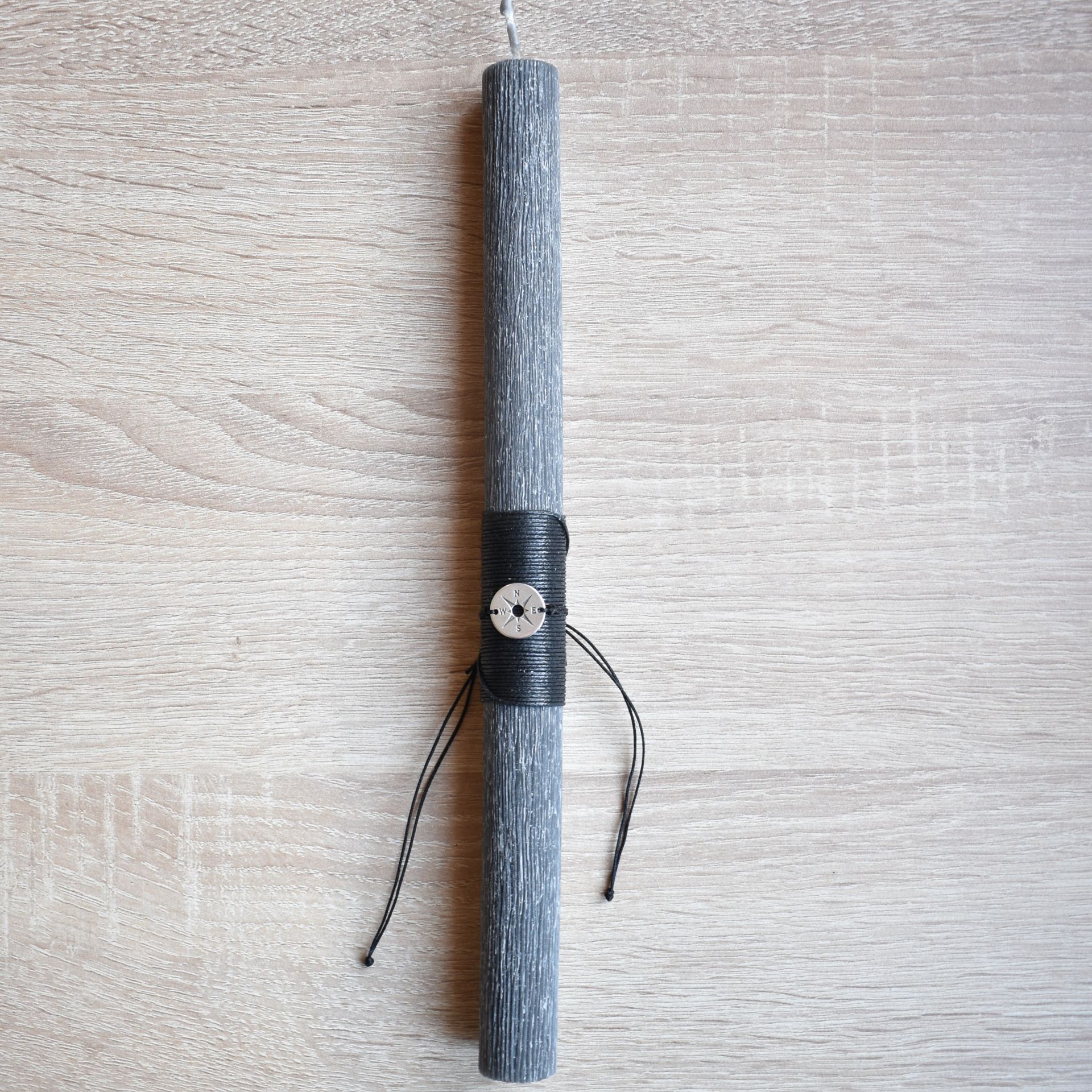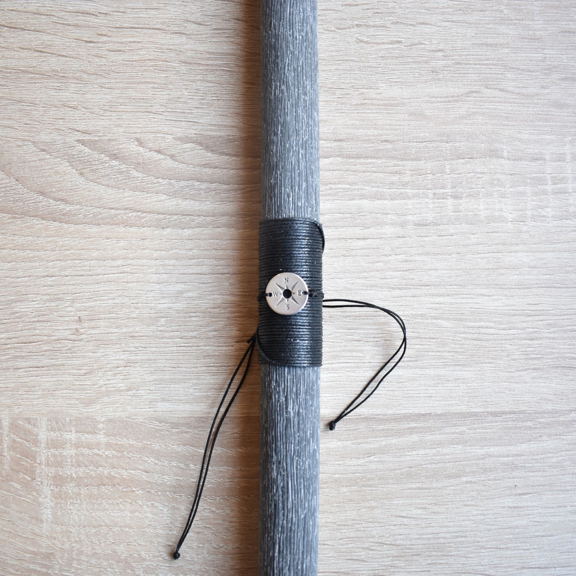 Χειροποίητη μαύρη πασχαλινή λαμπάδα με βραχιόλι πυξίδα, εμπνευσμένη από την έννοια της κατεύθυνσης, της ισορροπίας και της προσωπικής πορείας. Η πυξίδα λειτουργεί ως διακριτικό σύμβολο προσανατολισμού, αποδίδεται μέσα από ένα βραχιόλι που προσθέτει χαρακτήρα στη λαμπάδα χωρίς να αλλοιώνει τον αυστηρό σχεδιασμό της.