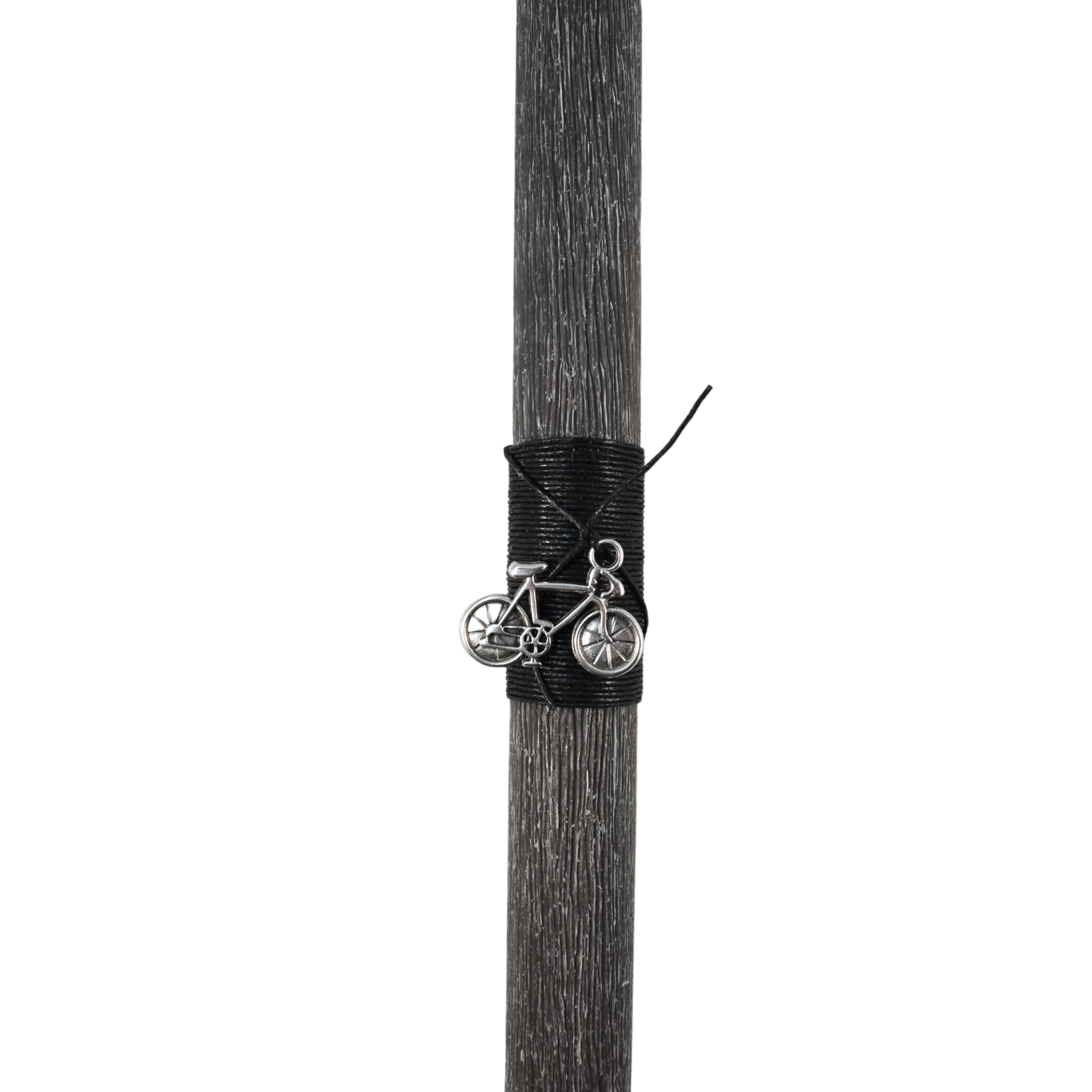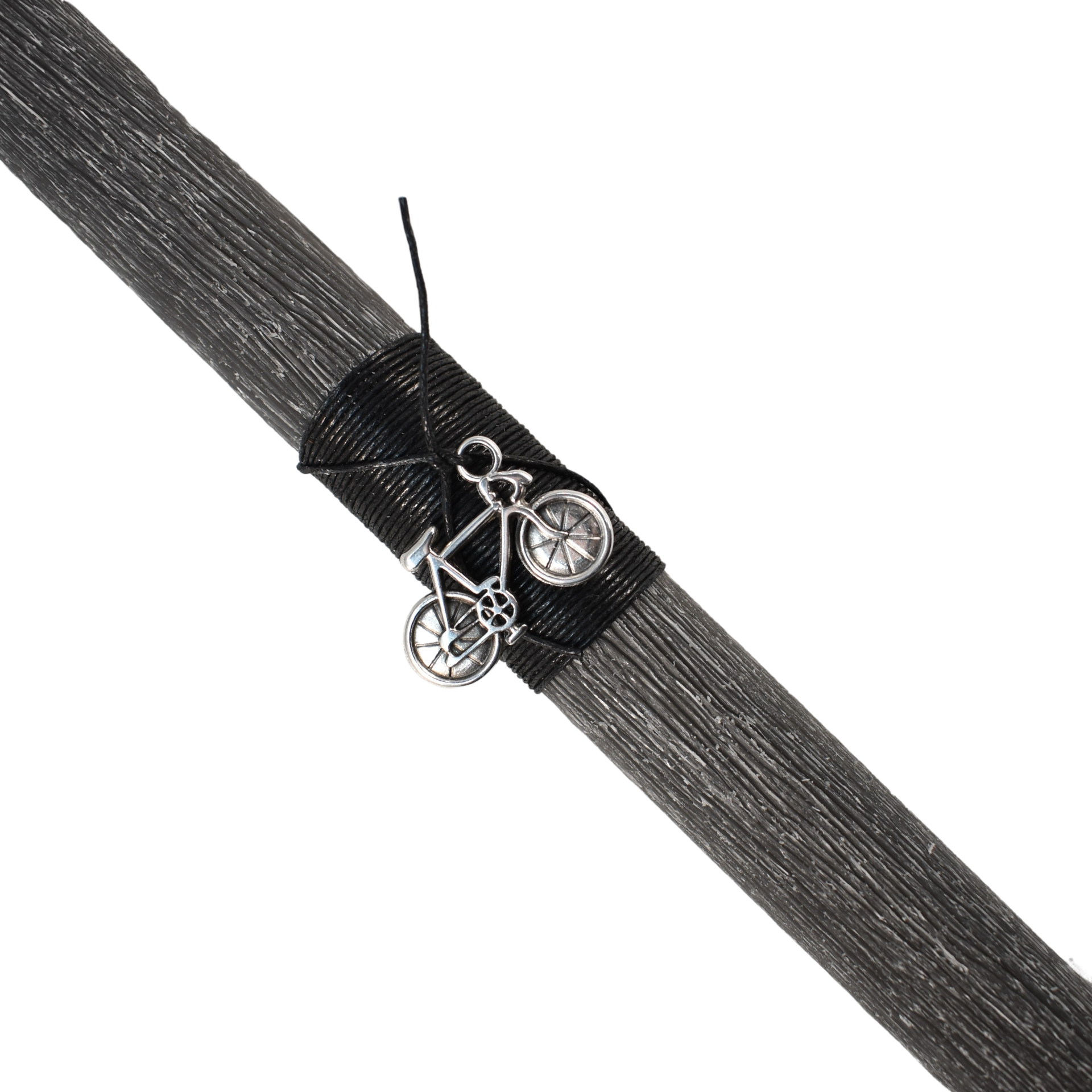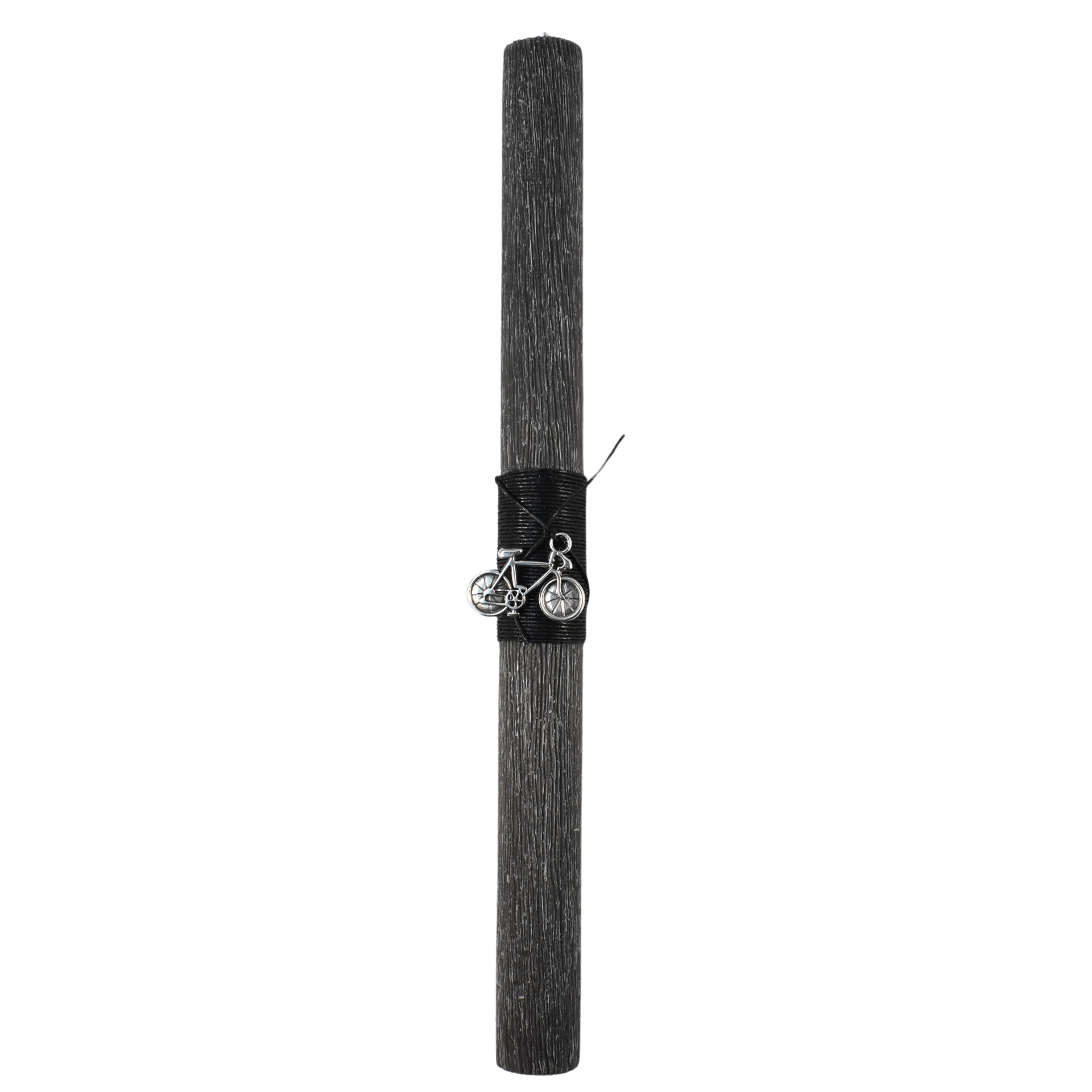 Χειροποίητη μαύρη πασχαλινή λαμπάδα με μεταλλικό ποδήλατο, εμπνευσμένη από την έννοια της διαδρομής, της ανεξαρτησίας και της καθημερινής κίνησης. Το ποδήλατο αποδίδεται ως καθαρό μεταλλικό στοιχείο που προσθέτει σύγχρονο και δυναμικό χαρακτήρα στη λαμπάδα, χωρίς να αλλοιώνει τον αυστηρό και ισορροπημένο σχεδιασμό της.