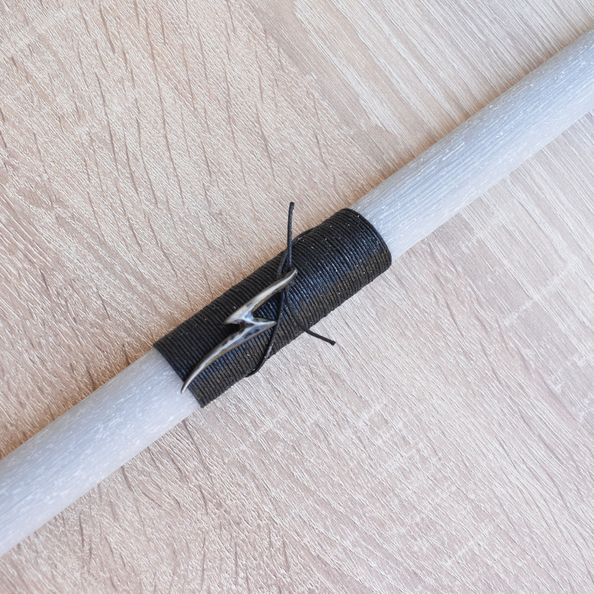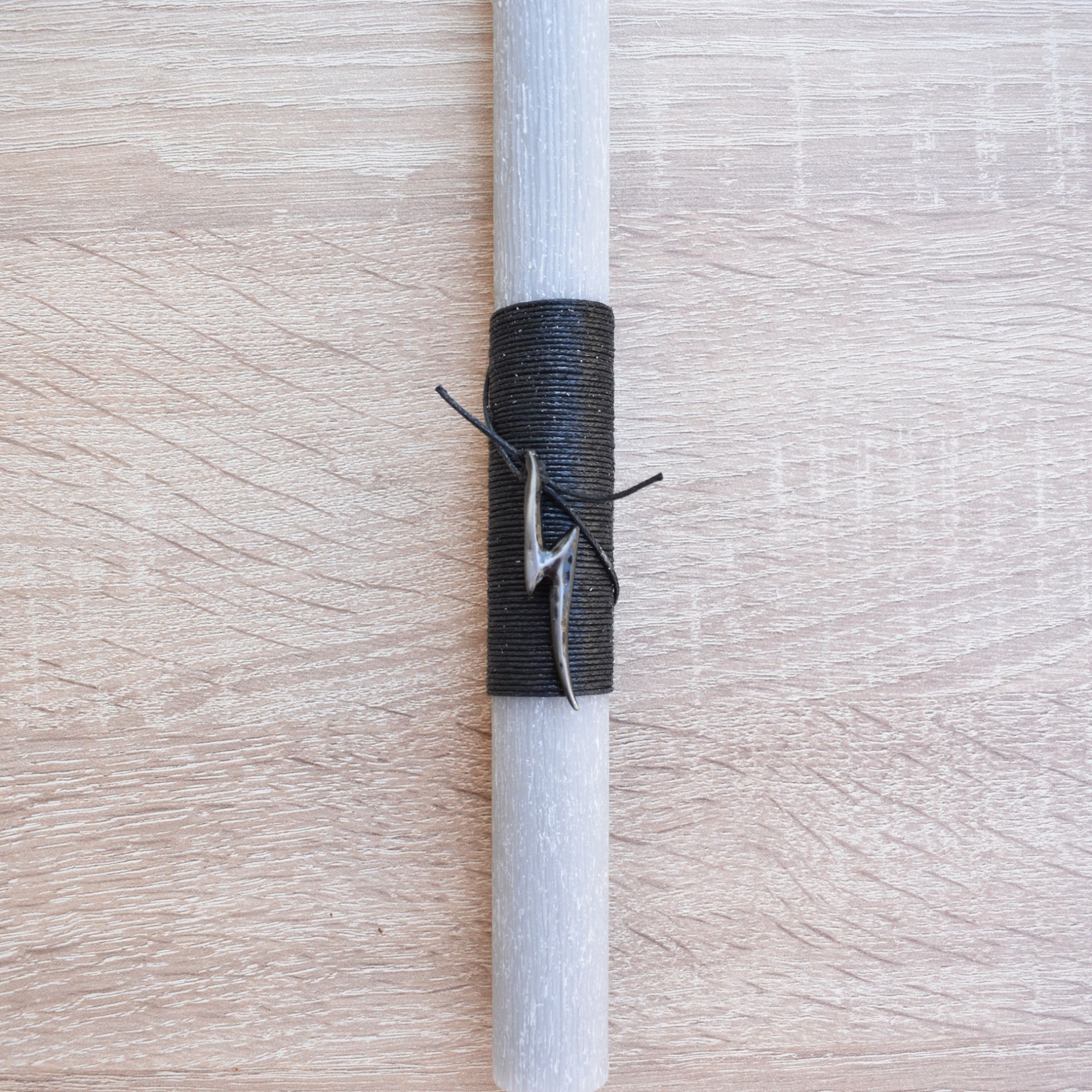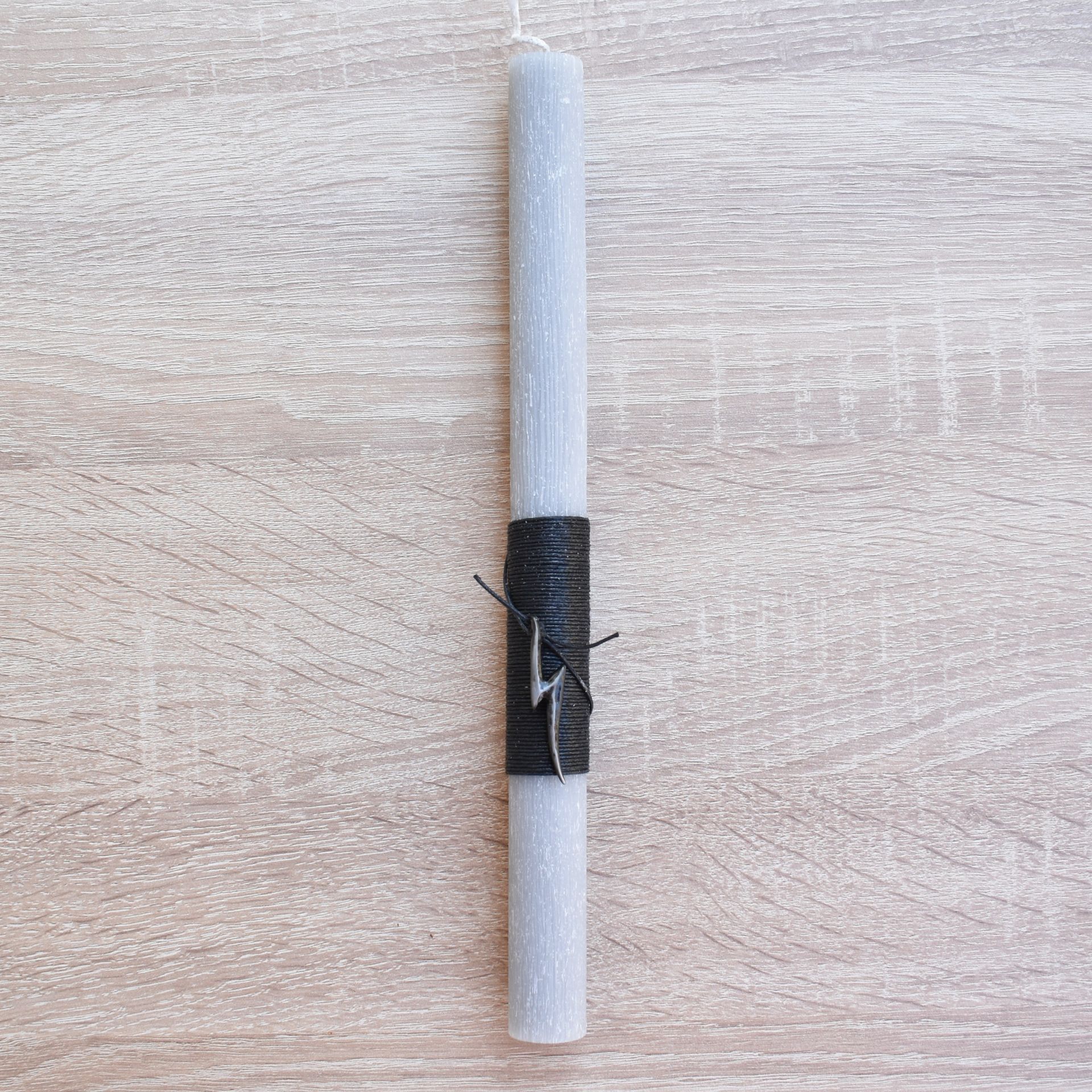 Πασχαλινή λαμπάδα με μεταλλική αστραπή, σχεδιασμένη για όσους αναζητούν έντονο συμβολισμό μέσα από καθαρές γραμμές. Η μεταλλική αστραπή λειτουργεί ως διακριτική αλλά δυναμική λεπτομέρεια, προσθέτοντας χαρακτήρα χωρίς να αλλοιώνει τον λιτό σχεδιασμό της λαμπάδας.