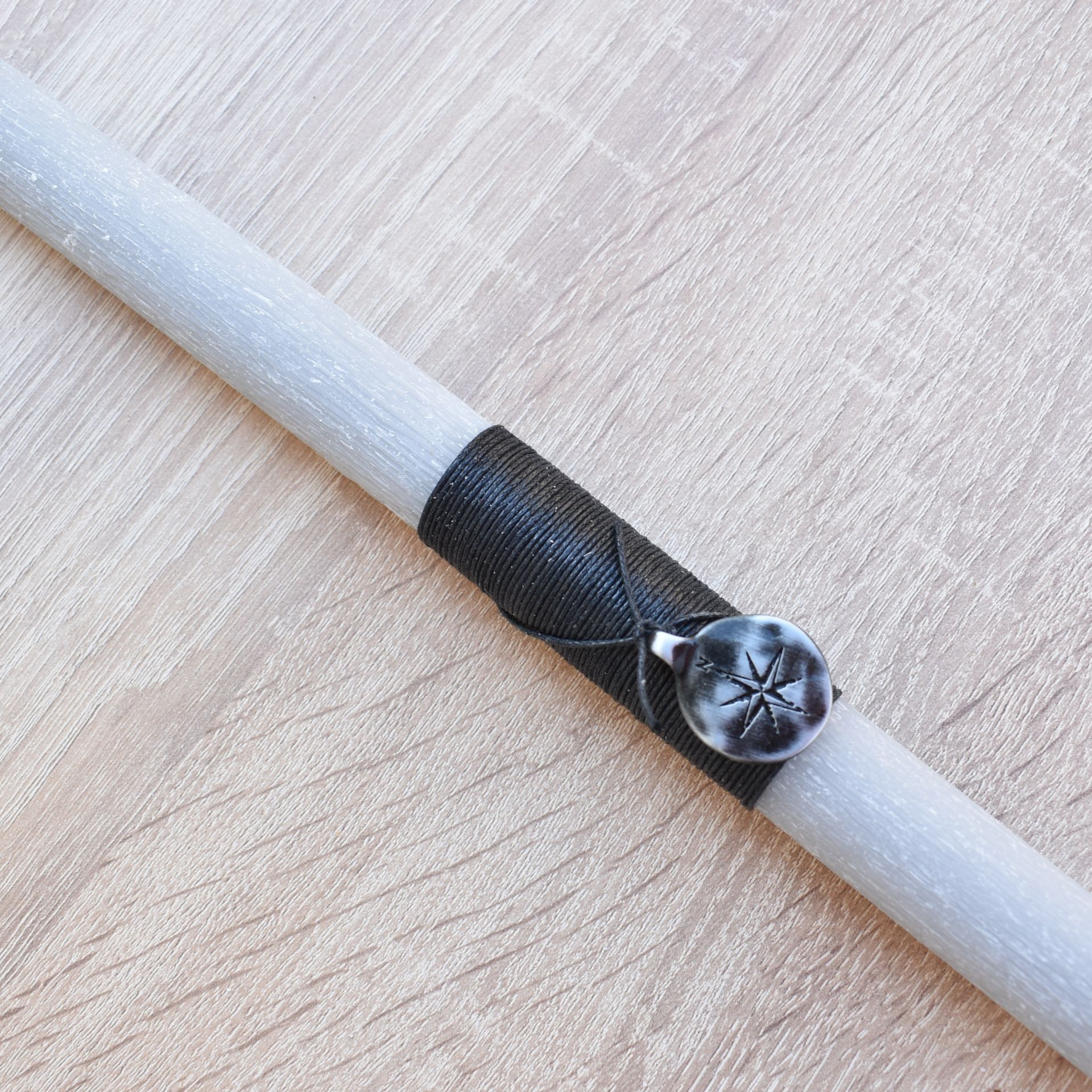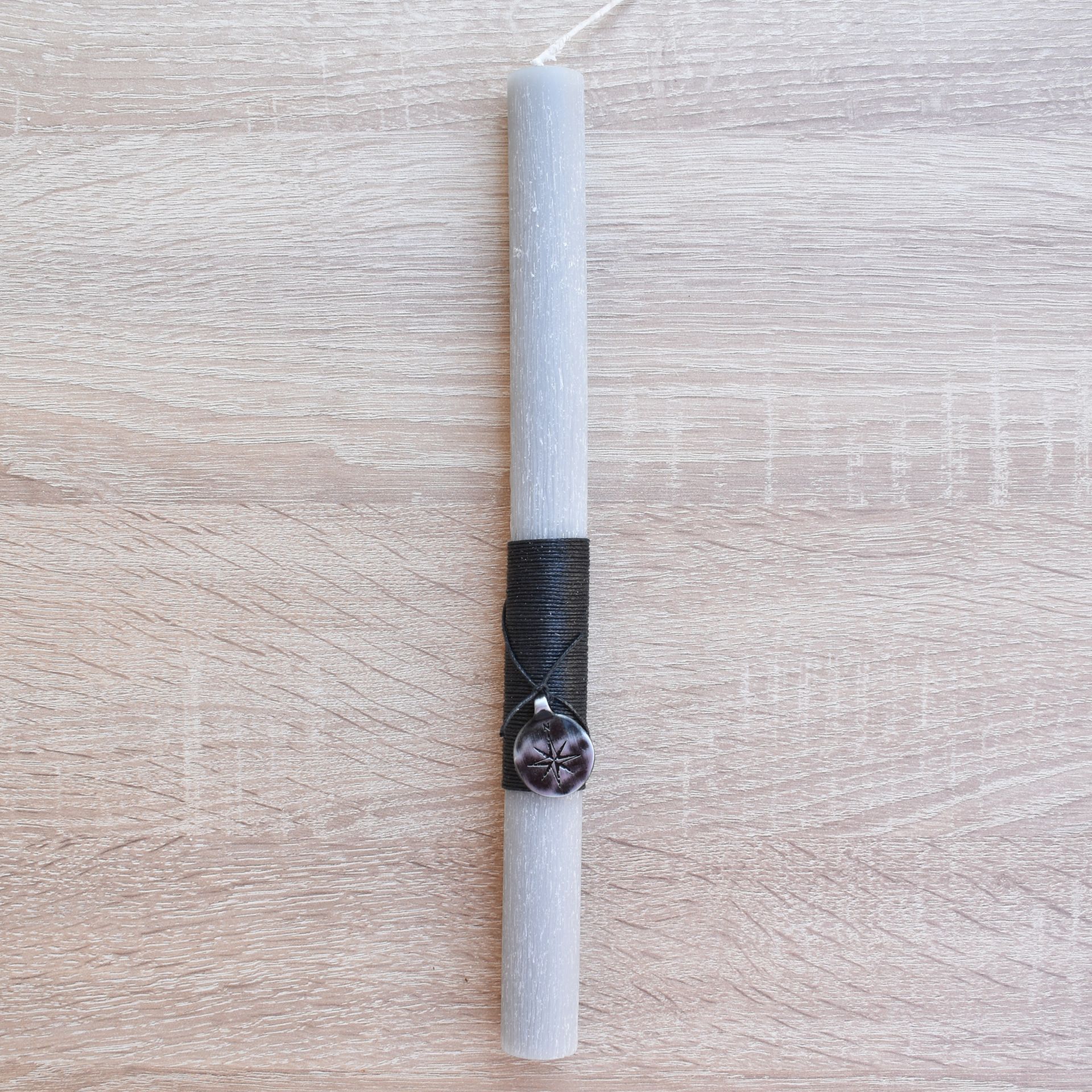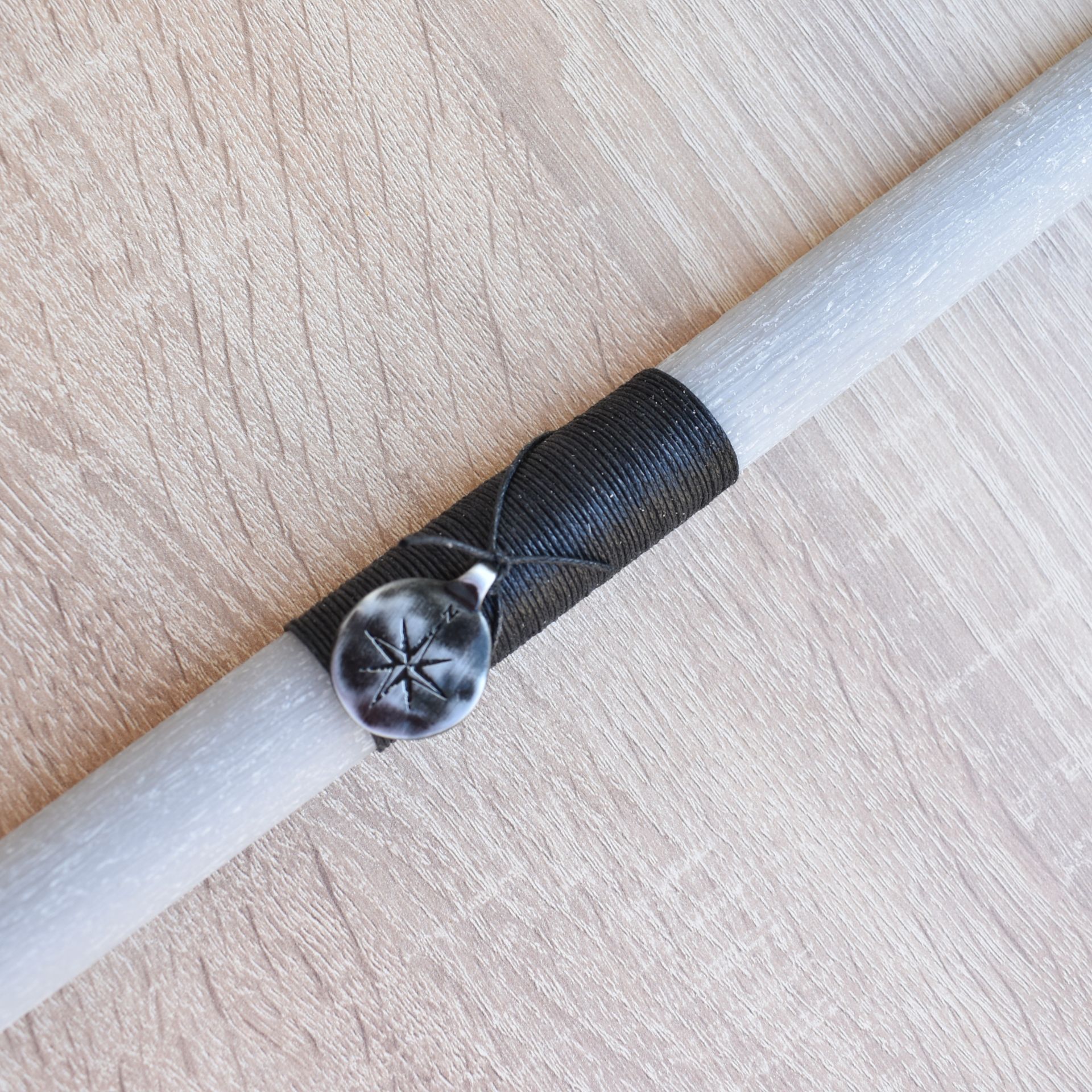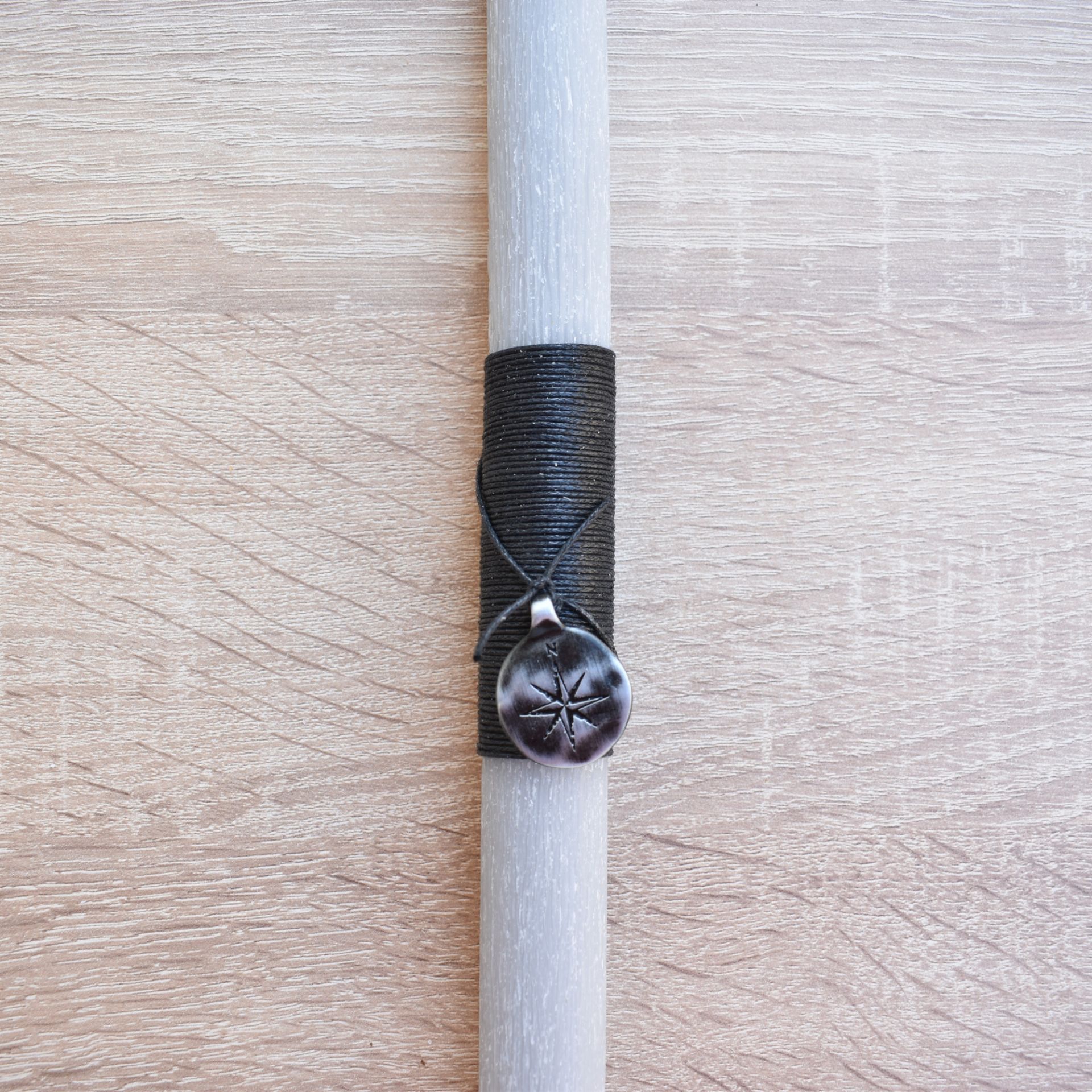 Πασχαλινή λαμπάδα με μεταλλική πυξίδα, εμπνευσμένη από την έννοια της πορείας, της κατεύθυνσης και της προσωπικής αναζήτησης. Η πυξίδα λειτουργεί ως διακριτική μεταλλική λεπτομέρεια που προσθέτει συμβολισμό, χωρίς να αλλοιώνει τον λιτό χαρακτήρα της λαμπάδας.