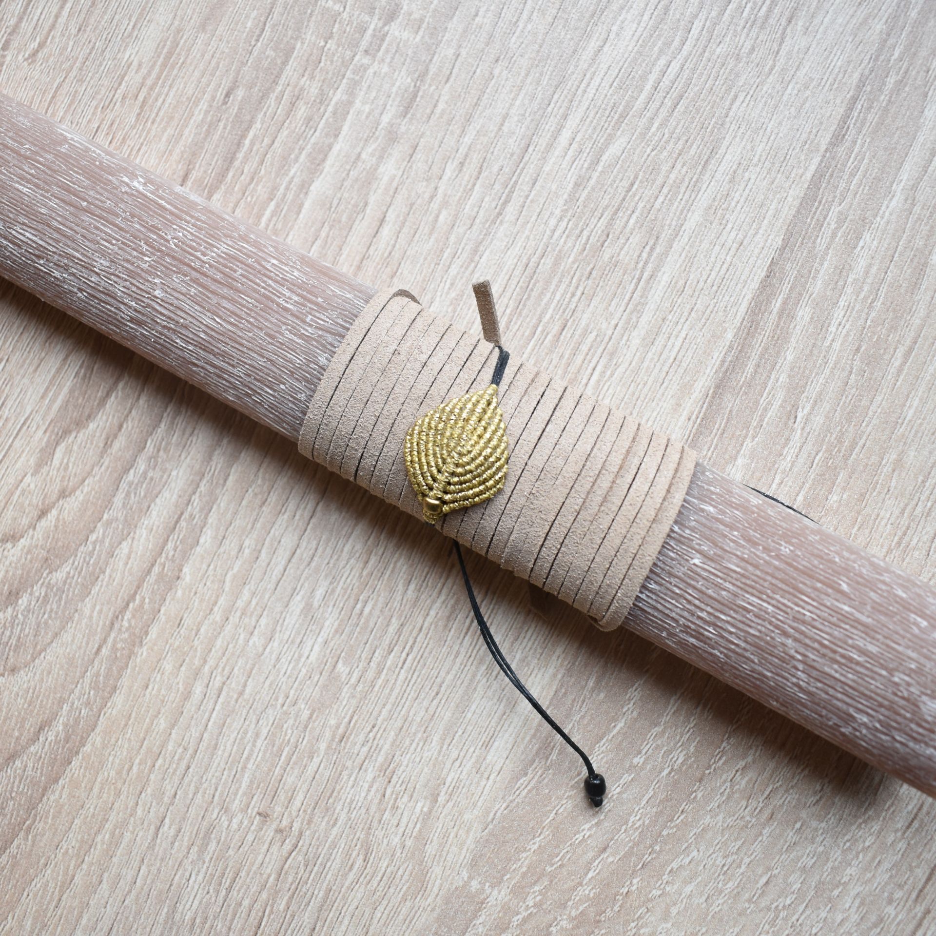 Το βραχιόλι είναι δεμένο με τεχνική μακραμέ και διαθέτει ρυθμιζόμενο μέγεθος, ώστε να προσαρμόζεται εύκολα στον καρπό. Το χρυσό φύλλο προσθέτει μια διακριτική λάμψη χωρίς υπερβολή, ενώ μπορεί να φορεθεί καθημερινά και μετά τις γιορτές.