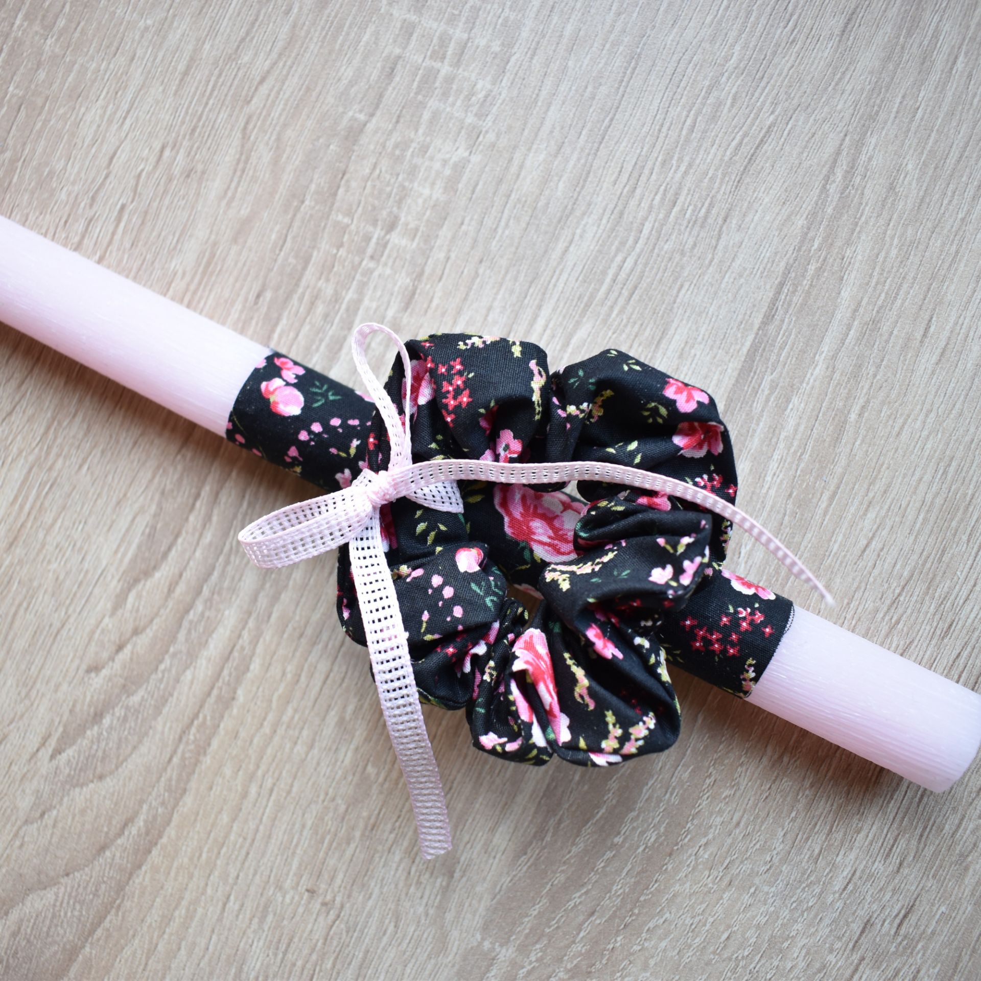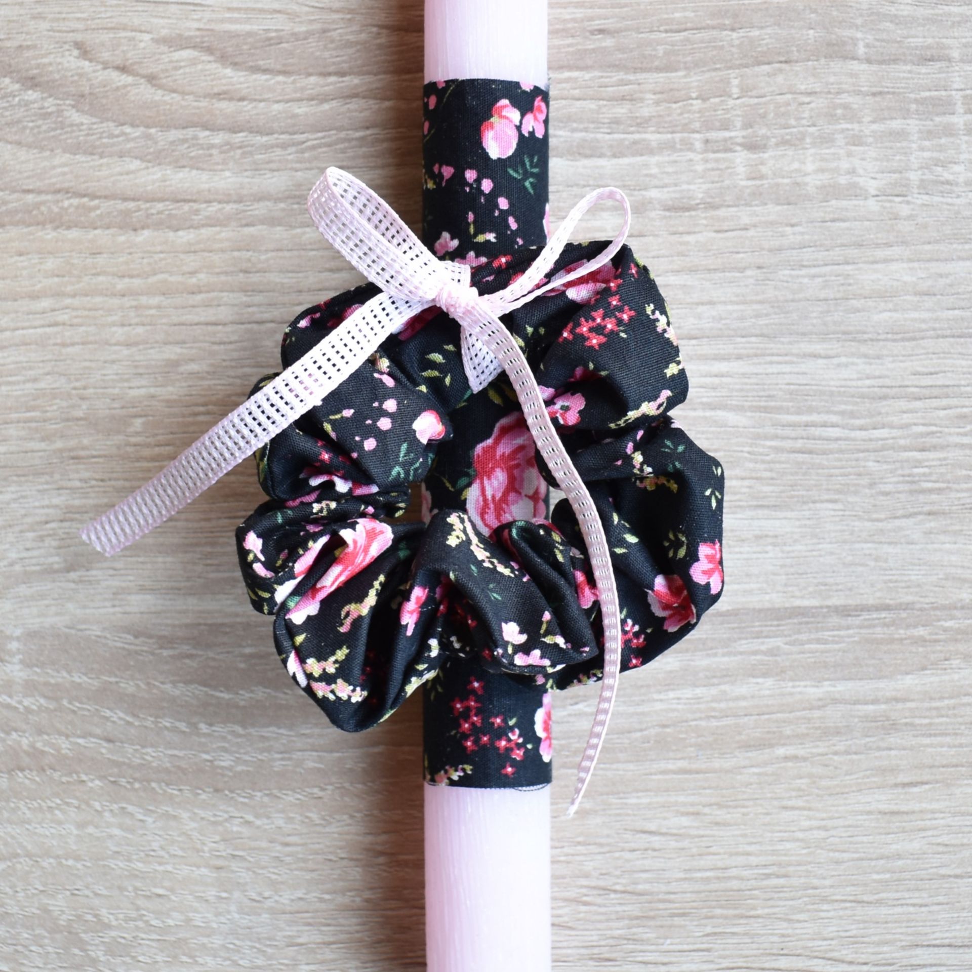 Οι γυναικείες πασχαλινές λαμπάδες με αξεσουάρ μαλλιών προσφέρουν έναν σύγχρονο τρόπο να συνδυαστεί το πασχαλινό έθιμο με κάτι χρηστικό. Το μαύρο λαστιχάκι μπορεί να φορεθεί μόνο του ή να συνδυαστεί με άλλα scrunchies, δημιουργώντας διαφορετικά looks.