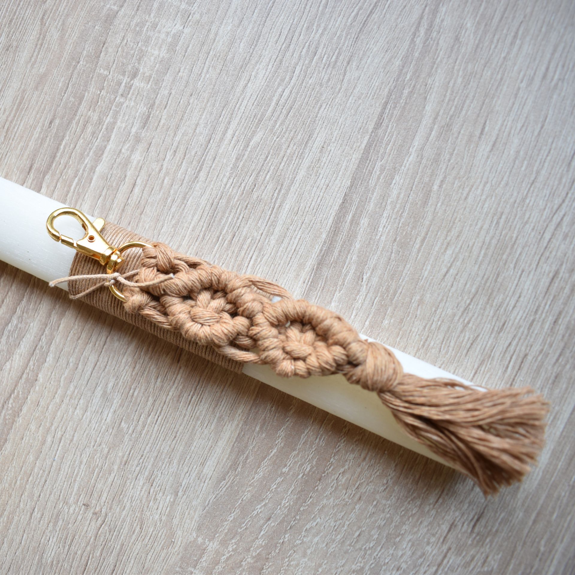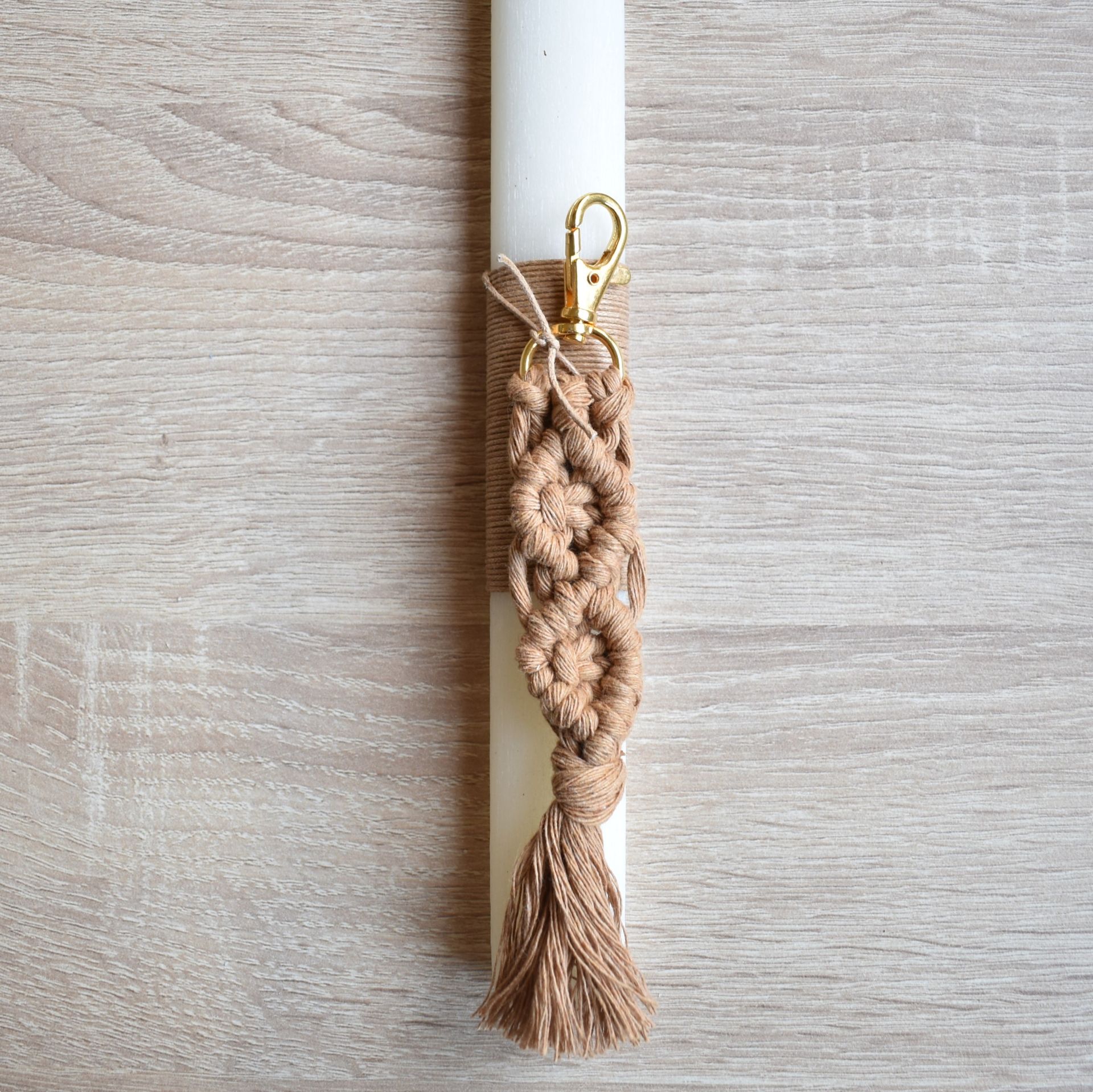 Λαμπάδα γυναικεία με μπρελόκ μακραμέ πούρο, πασχαλινή λαμπάδα με χειροποίητο αξεσουάρ.