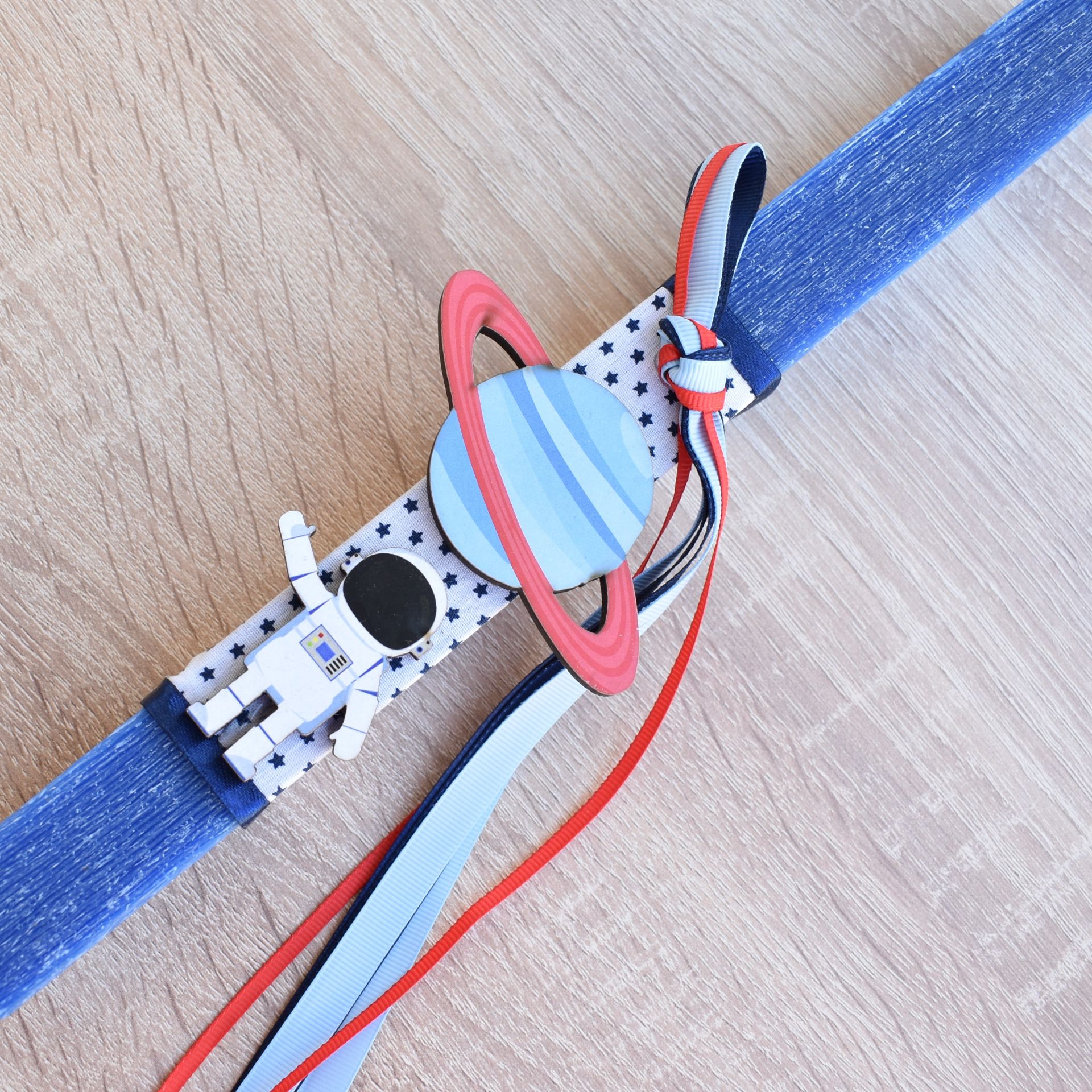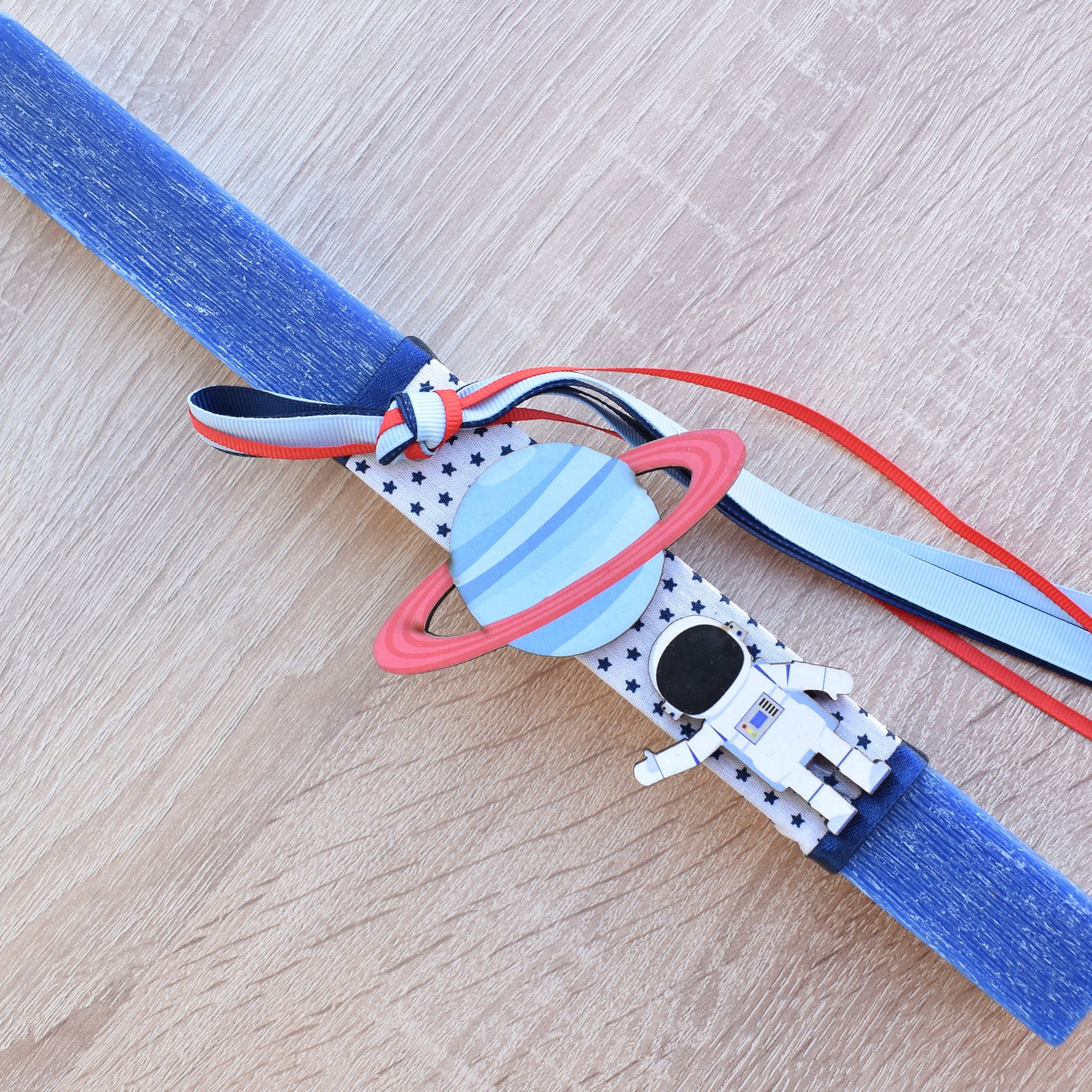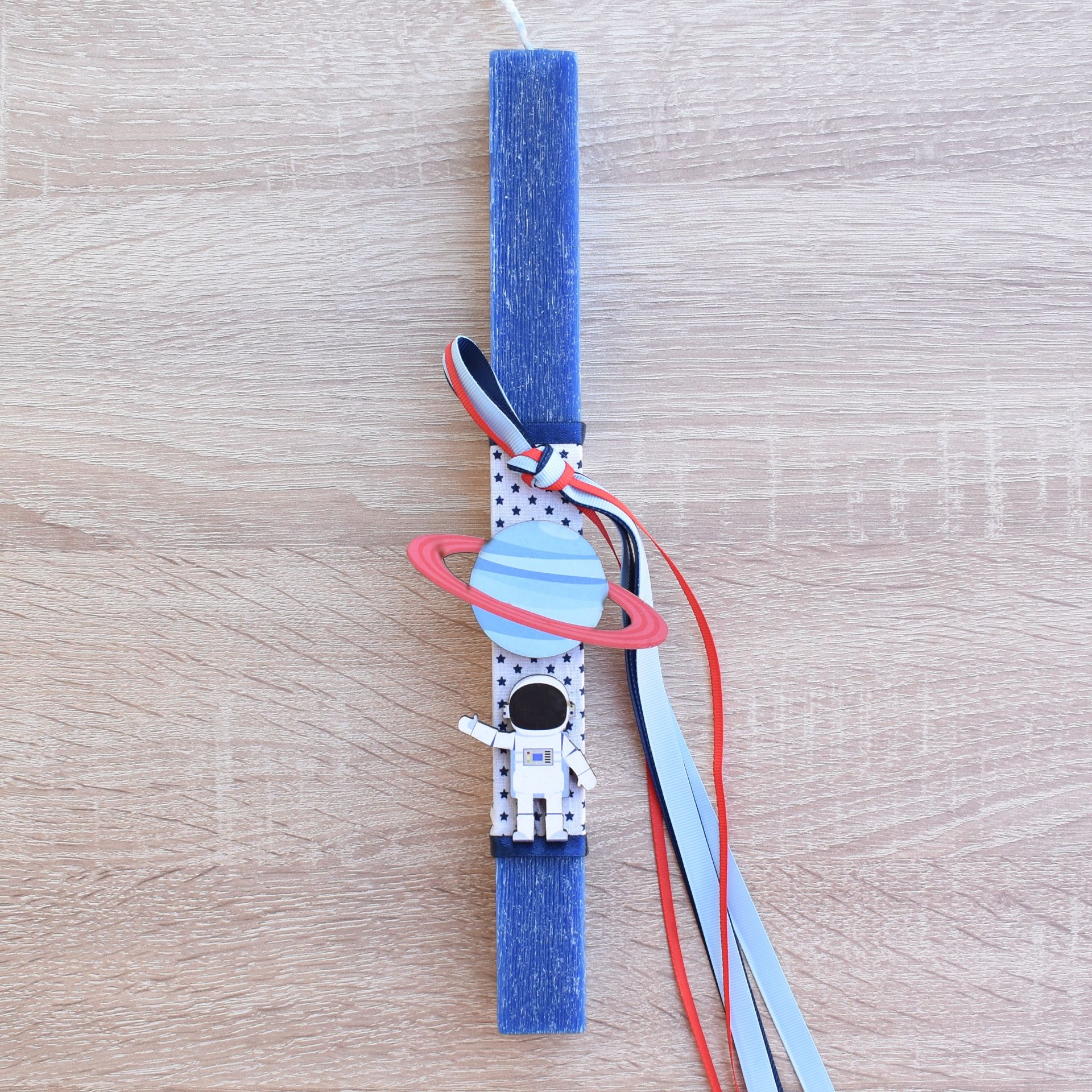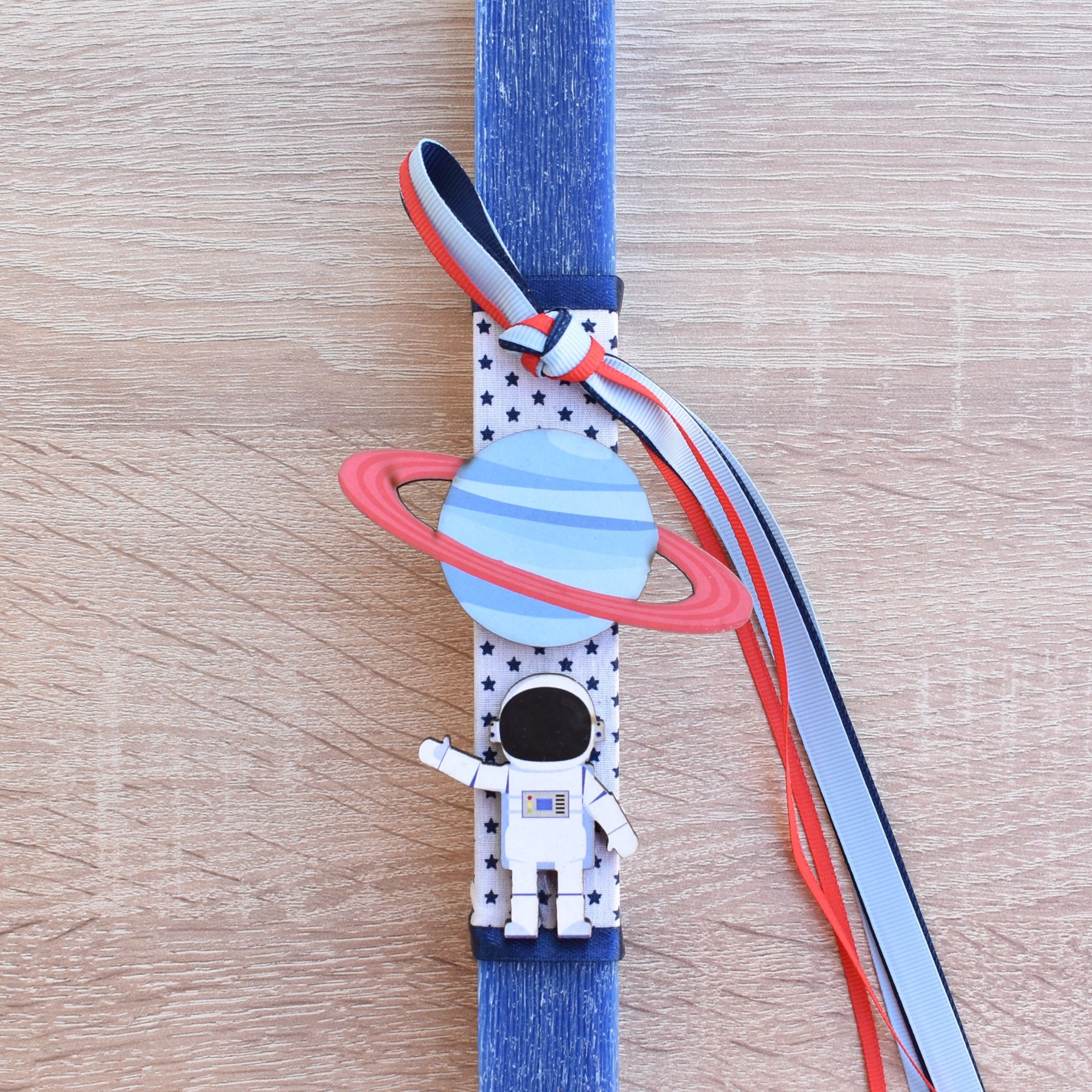 Η πασχαλινή λαμπάδα με ξύλινο αστροναύτη και πύραυλο αποτελεί μια πρωτότυπη και γεμάτη φαντασία πρόταση για το Πάσχα. Σχεδιασμένη ως λαμπάδα για αγόρι, συνδυάζει την πασχαλινή παράδοση με ένα θεματικό διακοσμητικό εμπνευσμένο από το διάστημα και την εξερεύνηση.