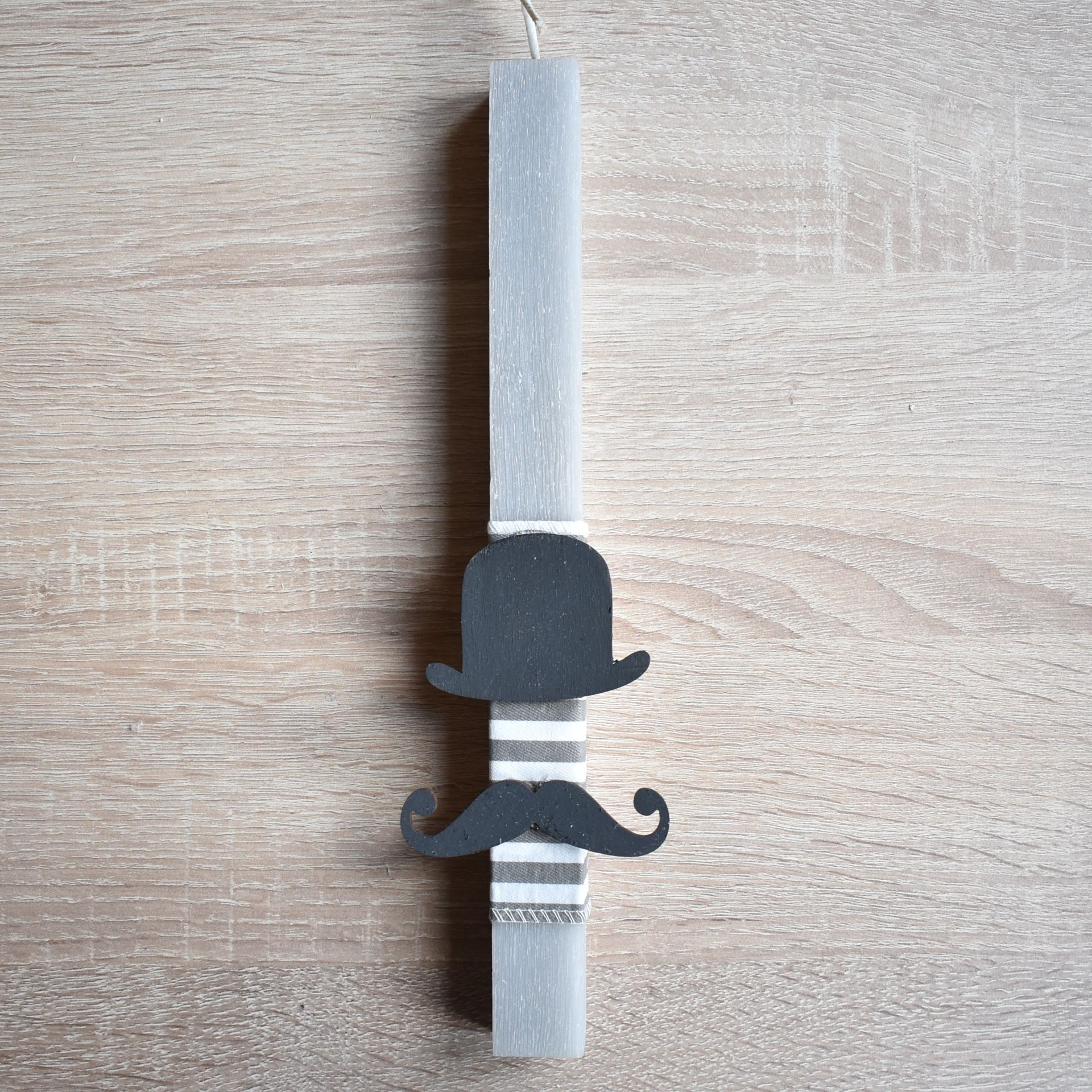 Πασχαλινή λαμπάδα μικρός κύριος διακοσμημένη με ξύλινο καπέλο και ξύλινο μουστάκι