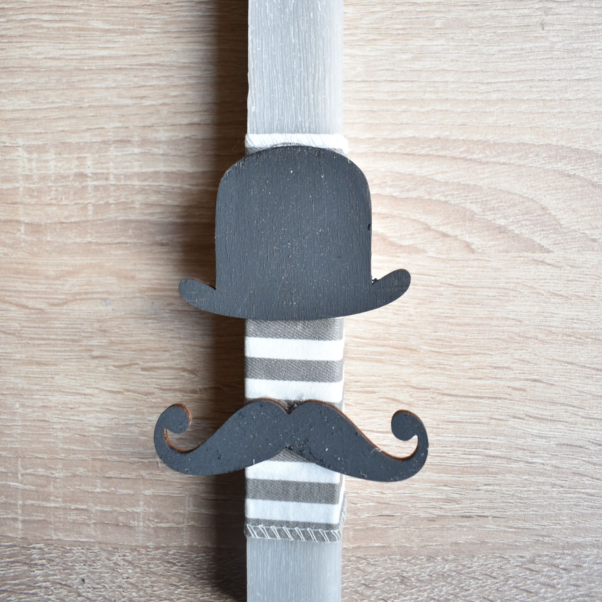 Το ξύλινο καπέλο και το ξύλινο μουστάκι δημιουργούν μια παιχνιδιάρικη φιγούρα “μικρού κυρίου”, δίνοντας στη λαμπάδα μια ξεχωριστή ταυτότητα. Ανάμεσα στις λαμπάδες πασχαλινές, αυτό το σχέδιο ξεφεύγει από τα συνηθισμένα ζωάκια ή οχήματα και απευθύνεται σε αγόρια που αγαπούν τις διαφορετικές και πιο κομψές επιλογές.