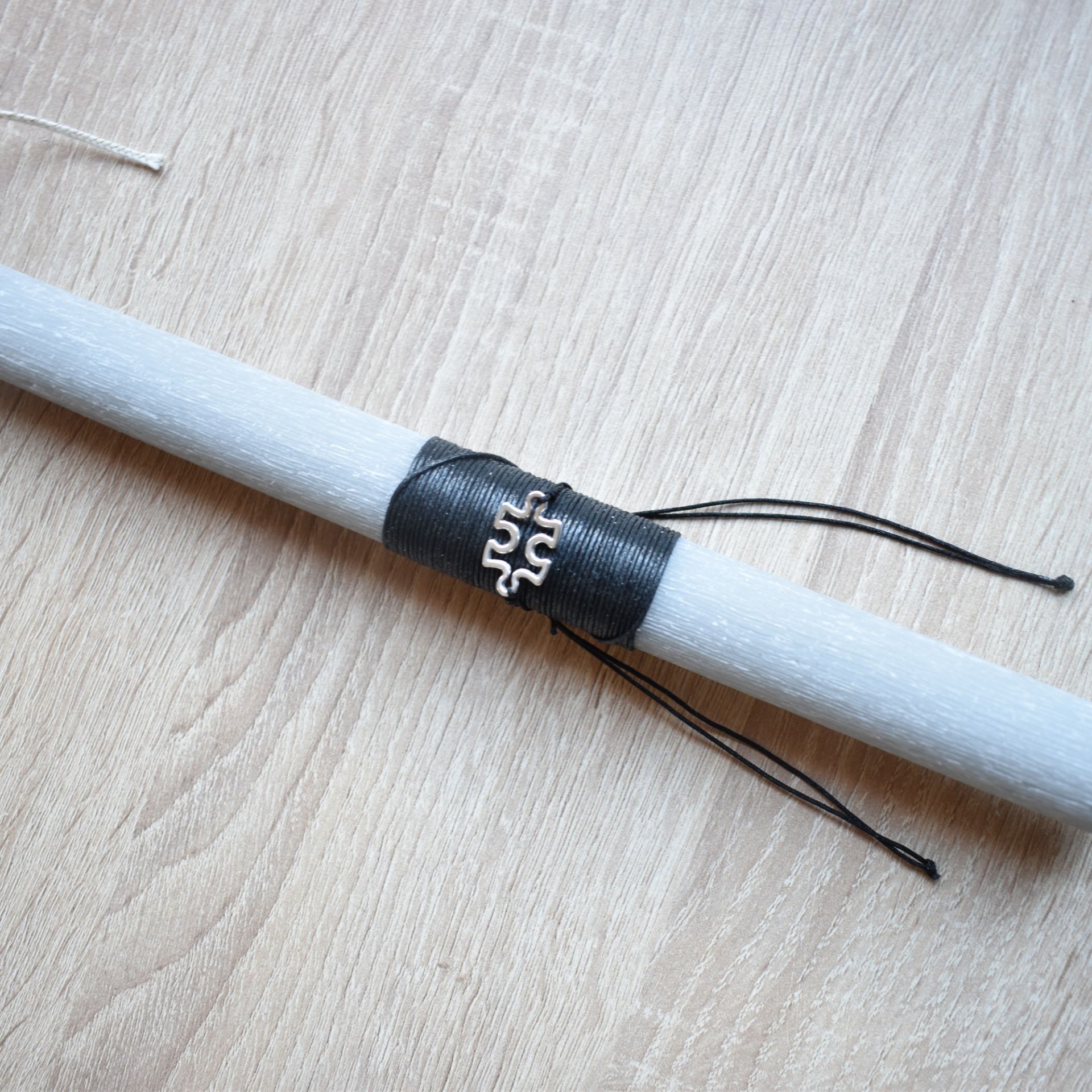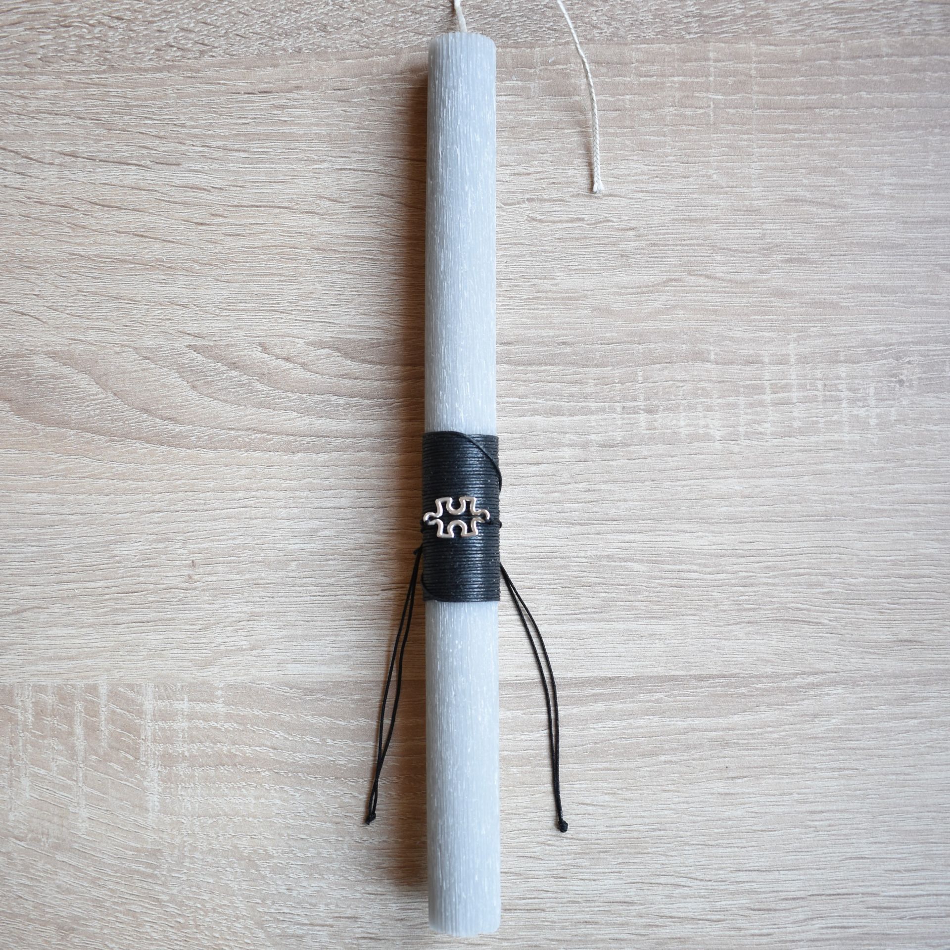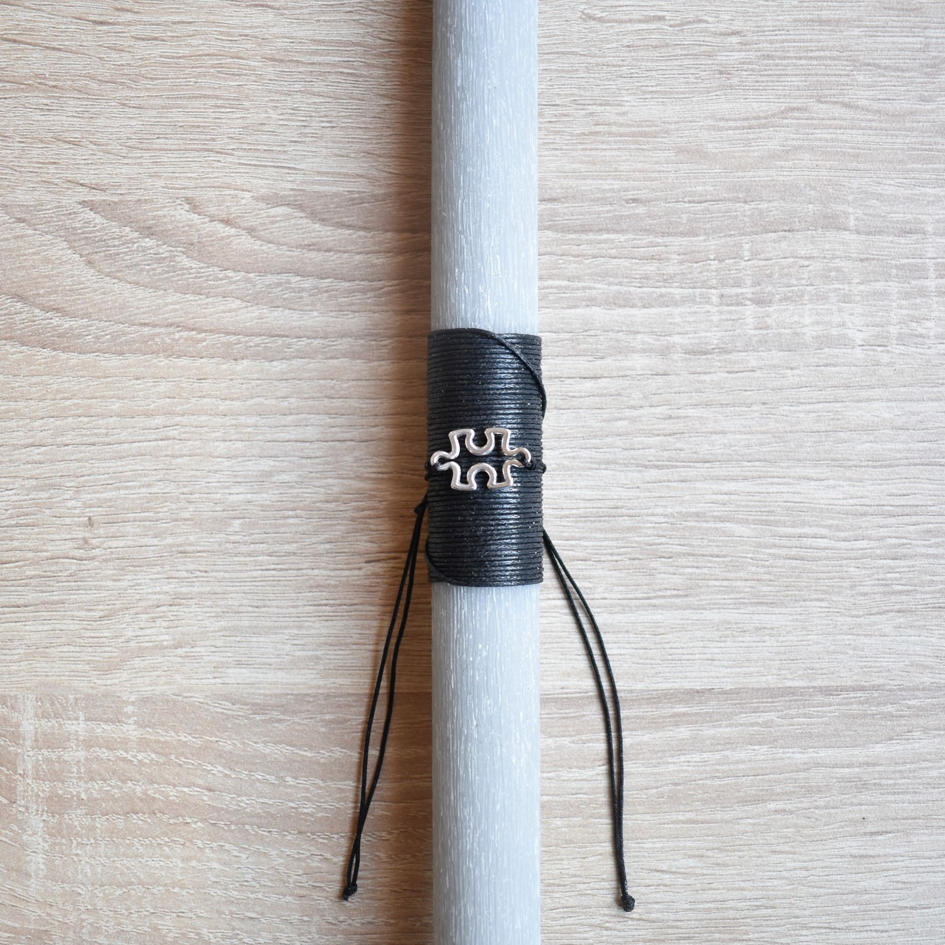 Χειροποίητη γκρι πασχαλινή λαμπάδα με μεταλλικό βραχιόλι παζλ, εμπνευσμένη από την έννοια της σύνδεσης, της ολοκλήρωσης και της προσωπικής ταυτότητας. Το παζλ αποτελεί αυτοτελές μεταλλικό βραχιόλι, λειτουργώντας ως σύμβολο που παραπέμπει στο «κομμάτι που συμπληρώνει το σύνολο», χωρίς να επιβαρύνει αισθητικά τη λαμπάδα.