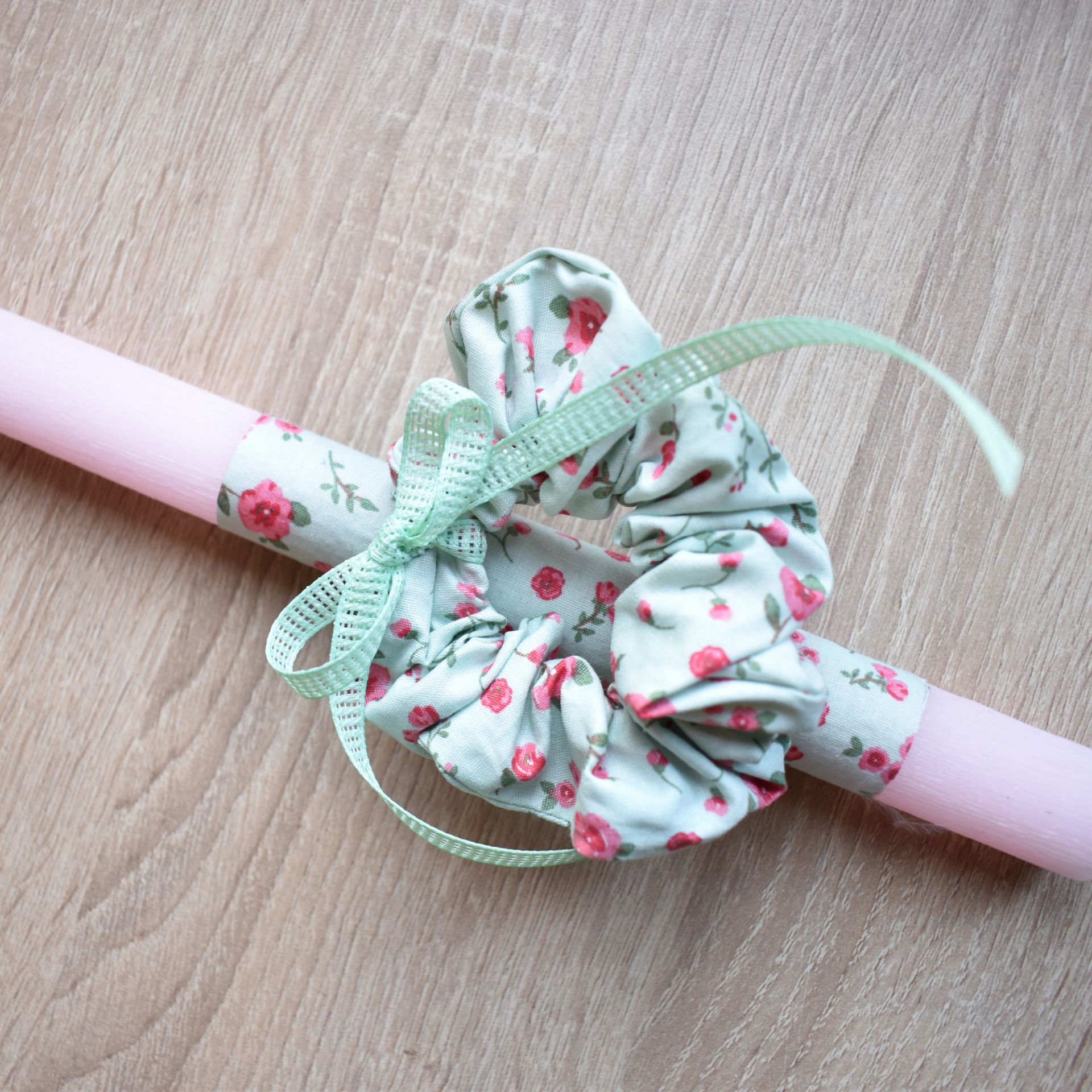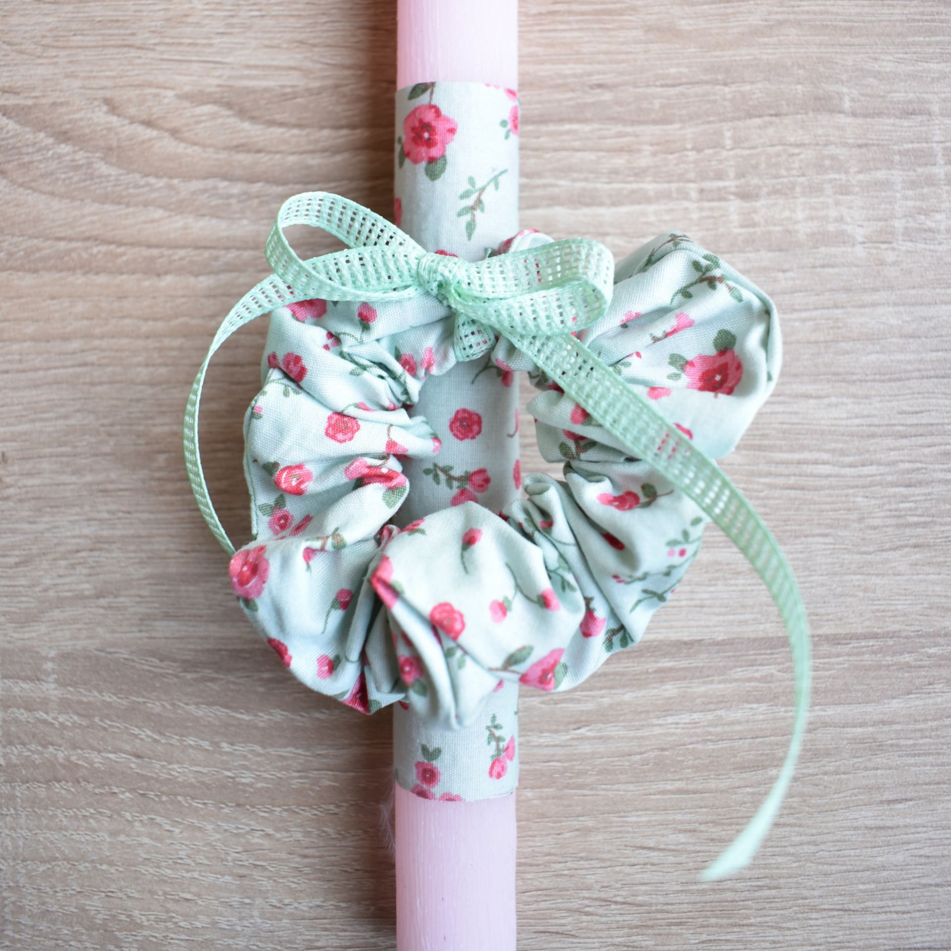 Λαμπάδα γυναικεία με πράσινο λαστιχάκι μαλλιών, πασχαλινή λαμπάδα με απλό και χρηστικό αξεσουάρ.