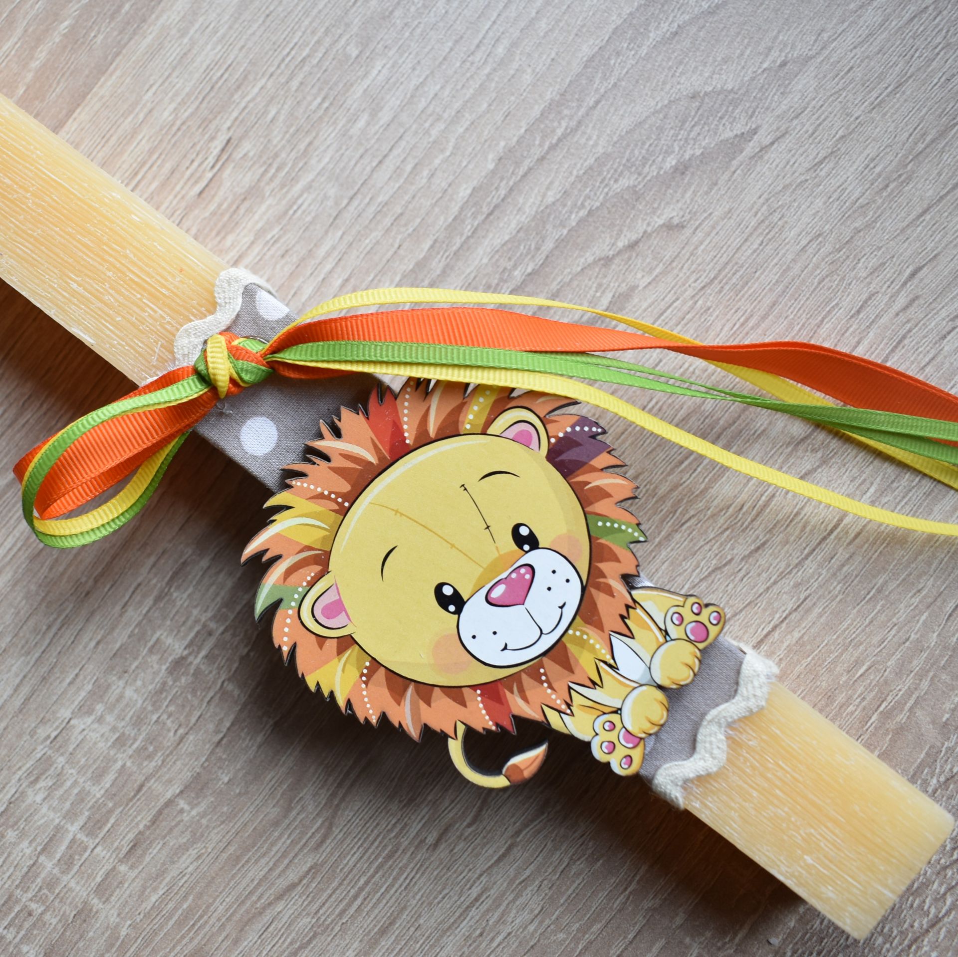 Αγορίστικη πασχαλινή λαμπάδα με ξύλινο λιοντάρι, ιδανική επιλογή για αγόρια που αγαπούν τα ζωάκια.