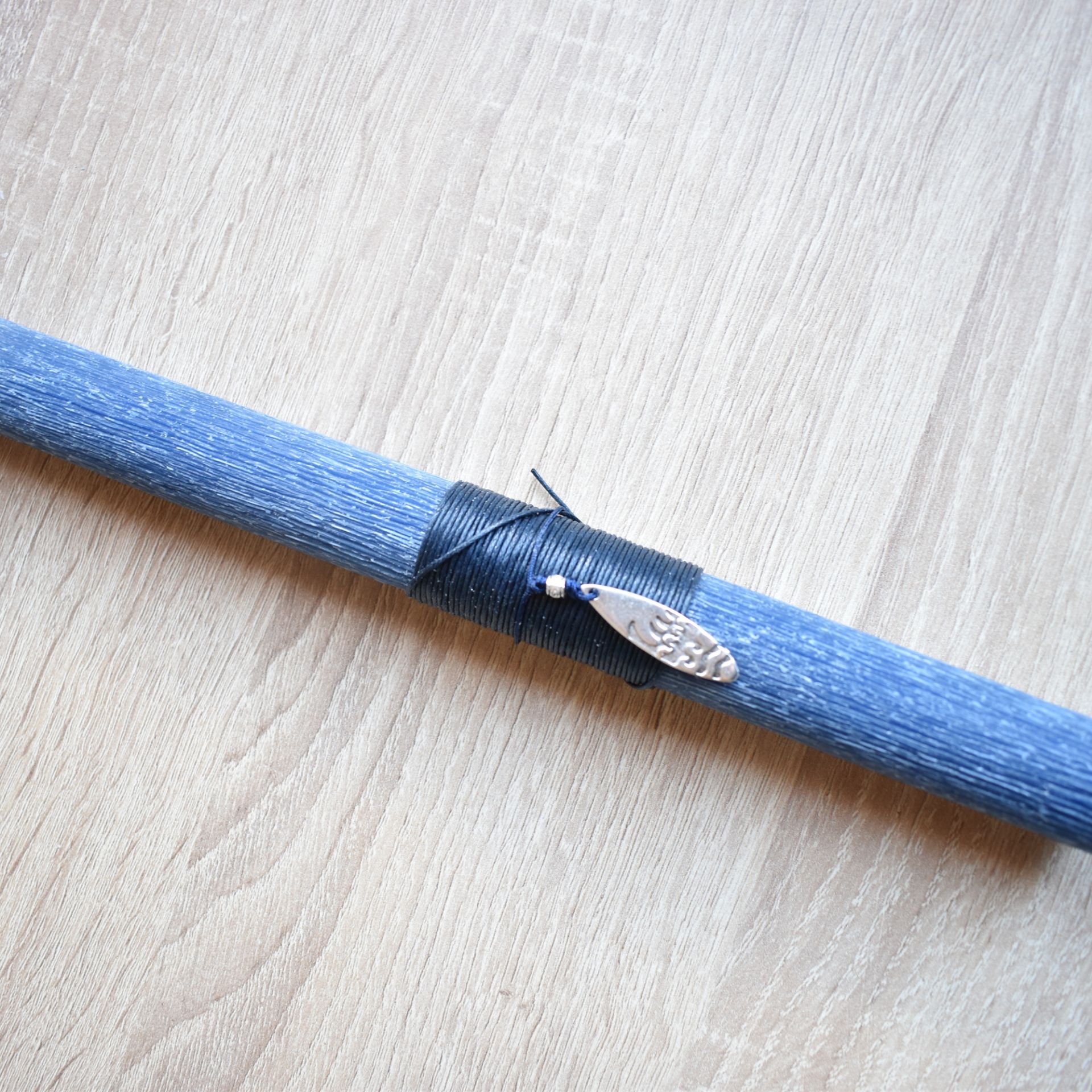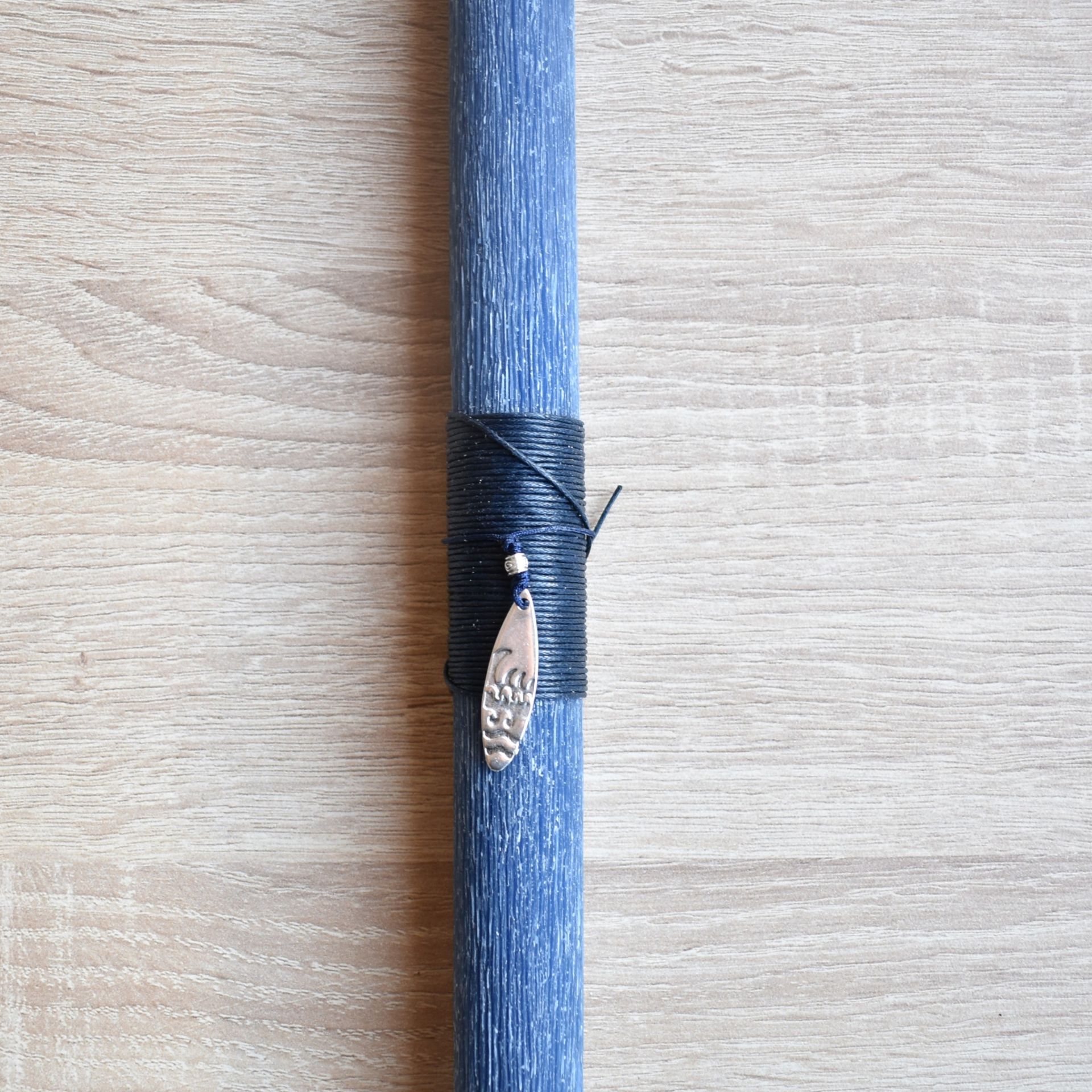 Χειροποίητη μπλε πασχαλινή λαμπάδα με κολιέ σε σχήμα σανίδας του σερφ, εμπνευσμένη από τη θάλασσα, την ελευθερία και τον χαλαρό τρόπο ζωής. Το κολιέ λειτουργεί ως διακριτικό αλλά αναγνωρίσιμο σύμβολο, προσθέτοντας καλοκαιρινό χαρακτήρα στη λαμπάδα χωρίς να αλλοιώνει τον λιτό σχεδιασμό της.