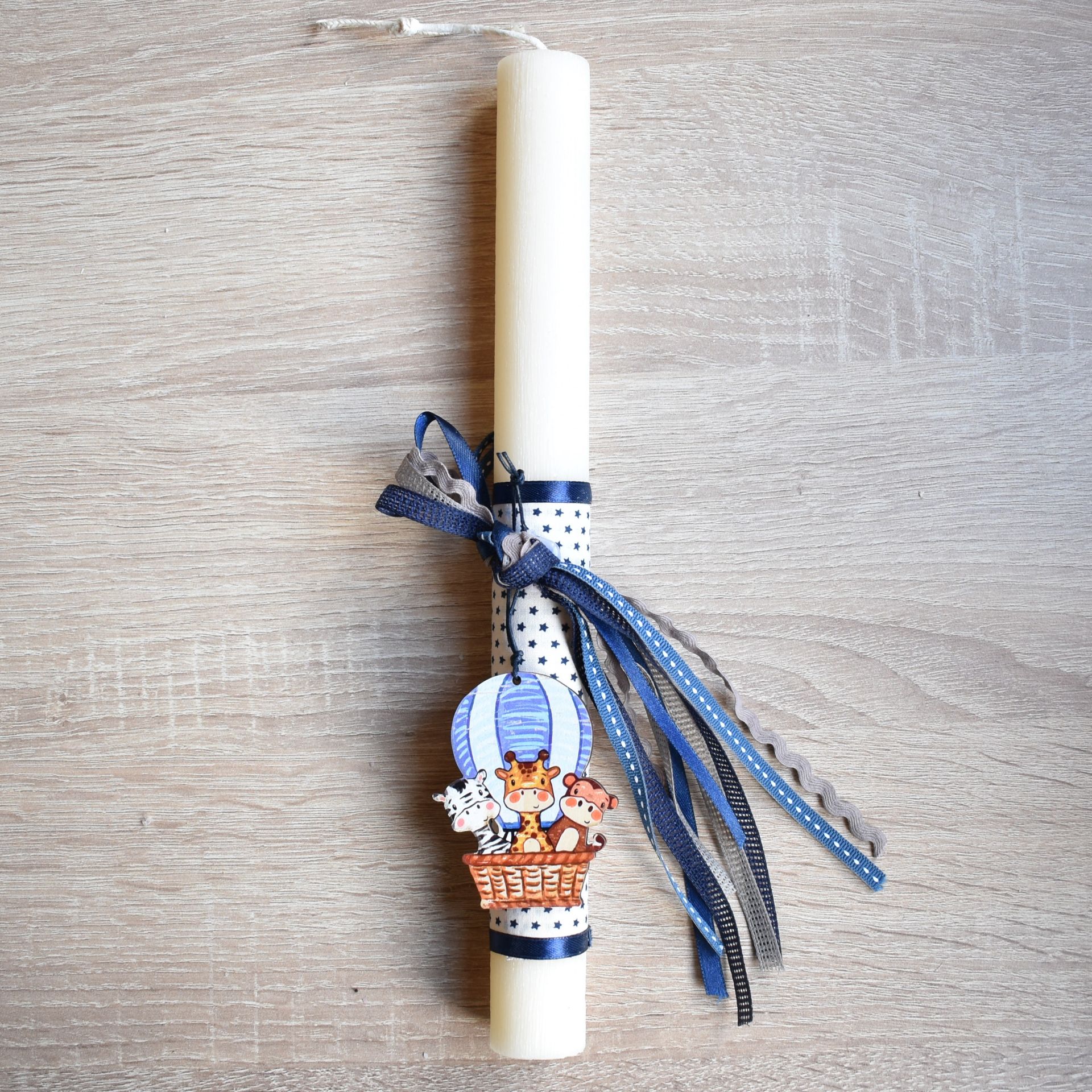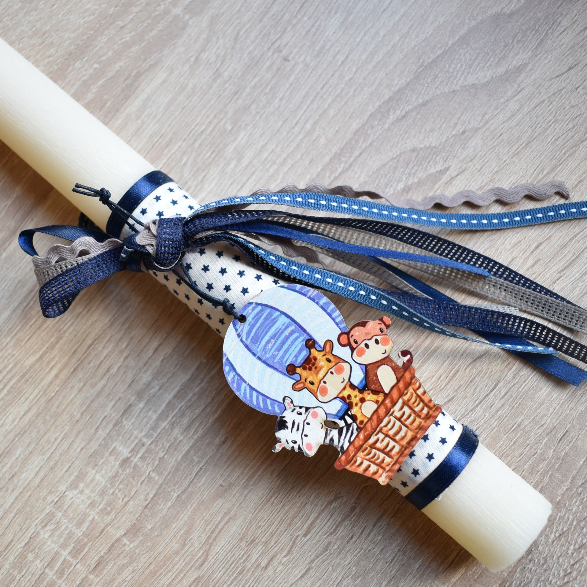 Λαμπάδα πασχαλινή αγόρι με ξύλινα ζωάκια της ζούγκλας σε αερόστατο, μια χαρούμενη παιδική επιλογή για το Πάσχα.