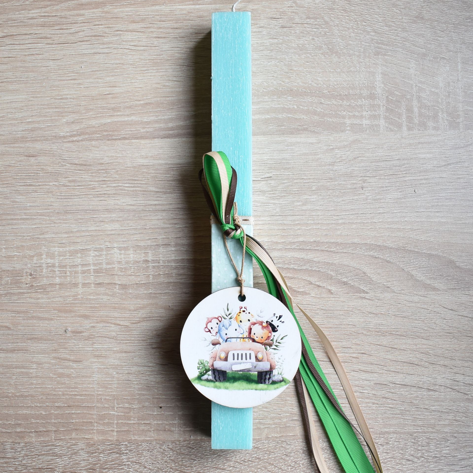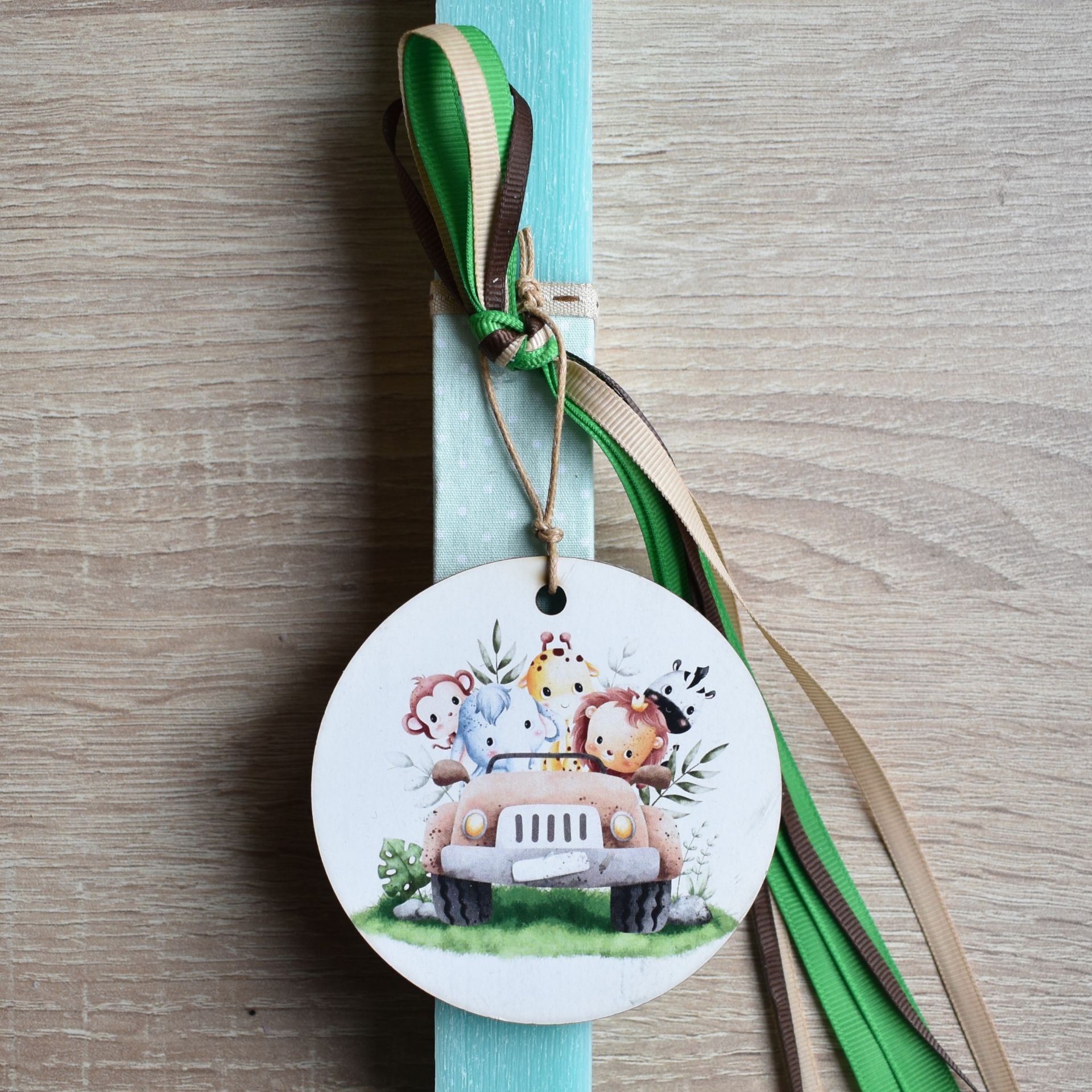 Λαμπάδα για αγόρι διακοσμημένη με ξύλινα ζωάκια της ζούγκλας