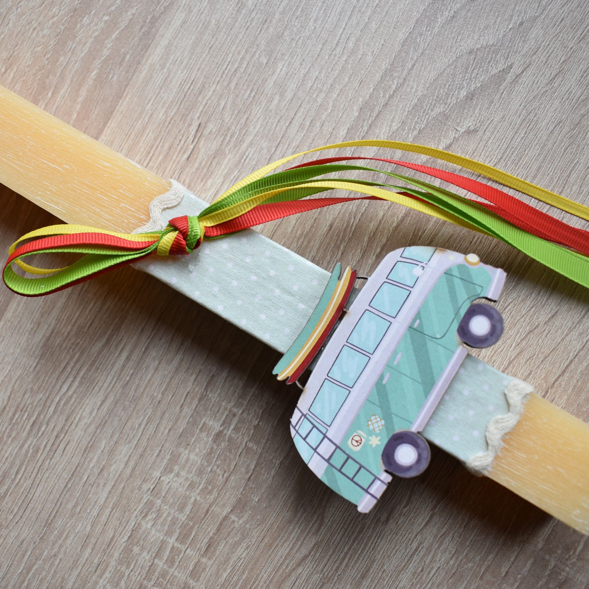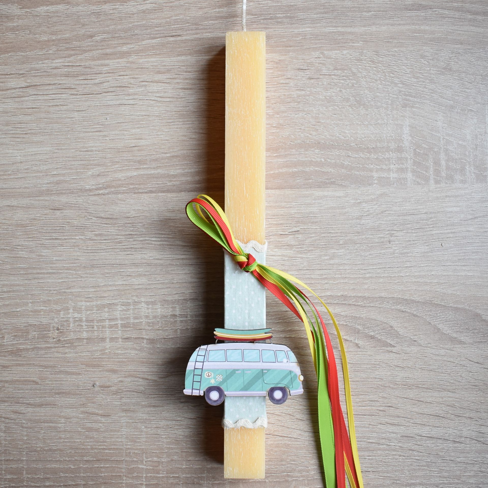 Λαμπάδα πασχαλινή αγόρι με ξύλινο βανάκι, ιδανική παιδική επιλογή για αγόρια που αγαπούν τα ταξίδια και τα οχήματα.