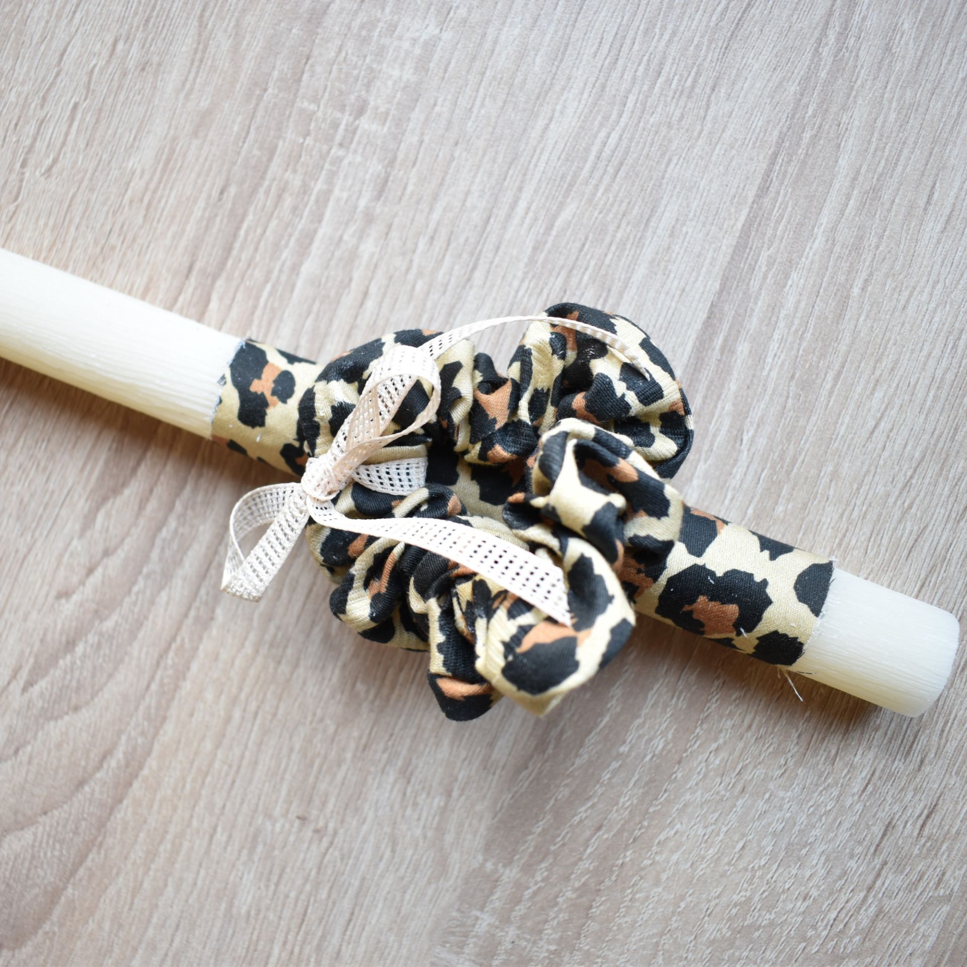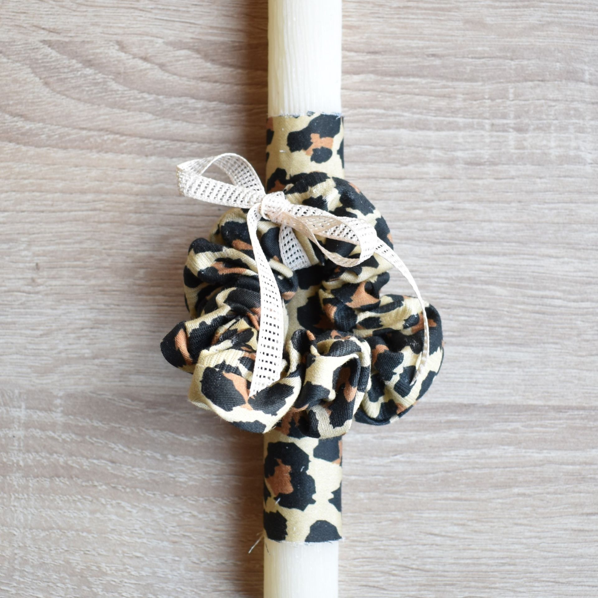 Λαμπάδες για γυναίκα με λαστιχάκι animal print, πασχαλινή λαμπάδα με μοντέρνο αξεσουάρ μαλλιών.
