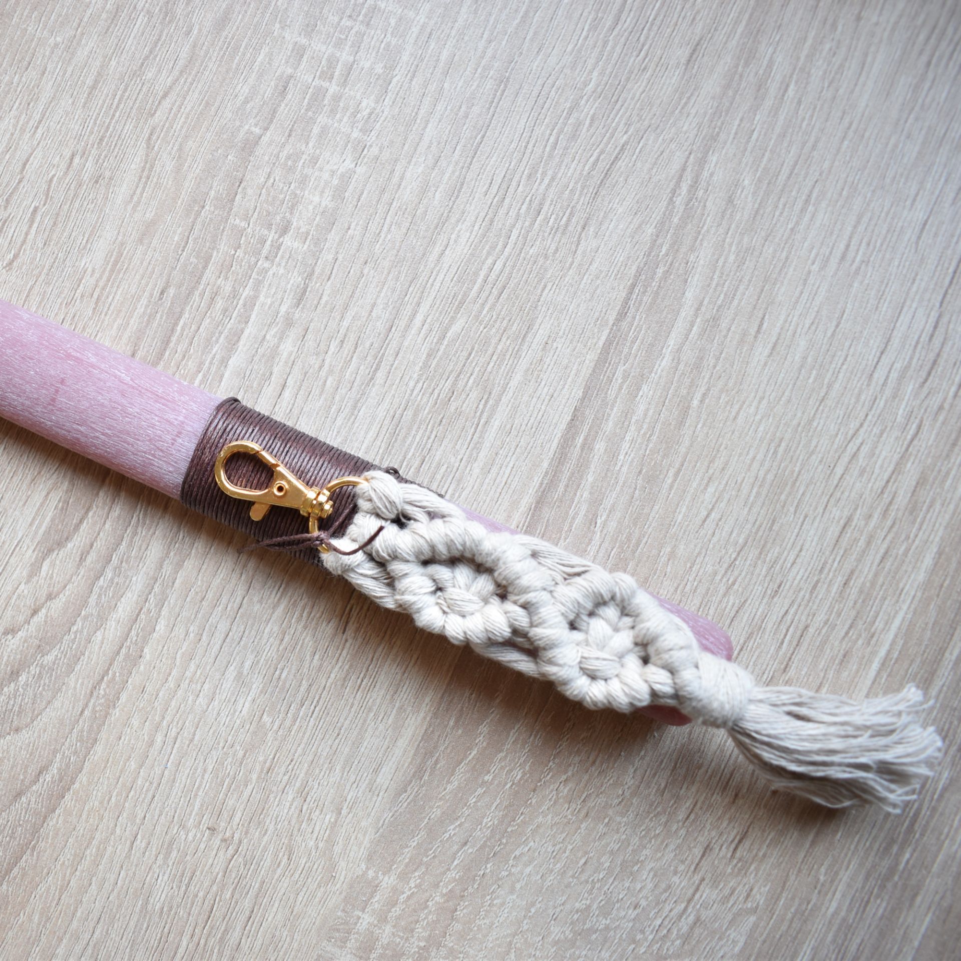 Το μπεζ μπρελόκ μακραμέ είναι δεμένο προσεκτικά πάνω στη λαμπάδα και ολοκληρώνεται με φούντα, προσθέτοντας μια φυσική και γήινη αισθητική. Μετά το Πάσχα, το μπρελόκ μπορεί να χρησιμοποιηθεί καθημερινά σε κλειδιά, τσάντα ή σακίδιο, δίνοντας στη λαμπάδα πρακτική αξία και διάρκεια στον χρόνο.