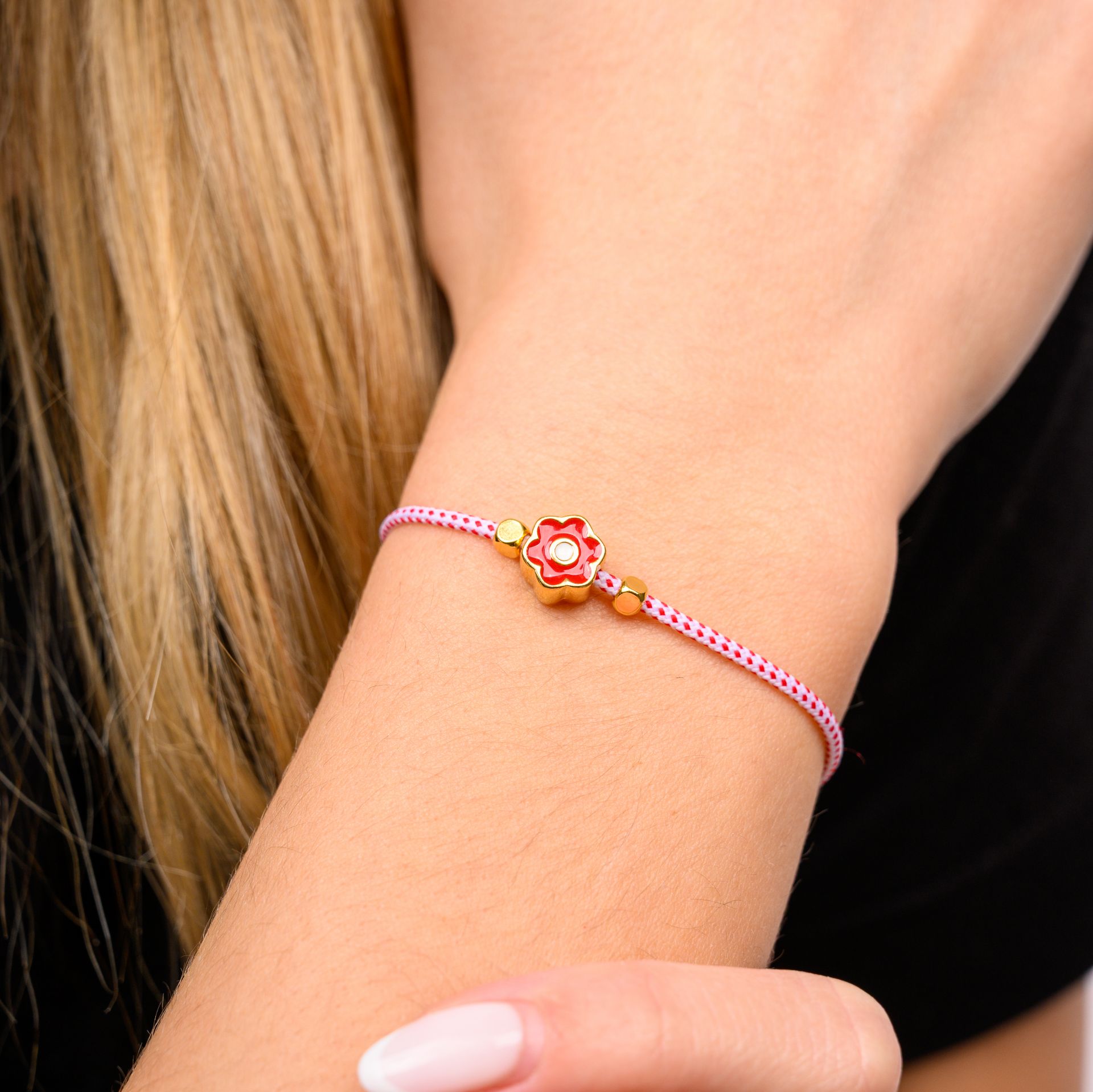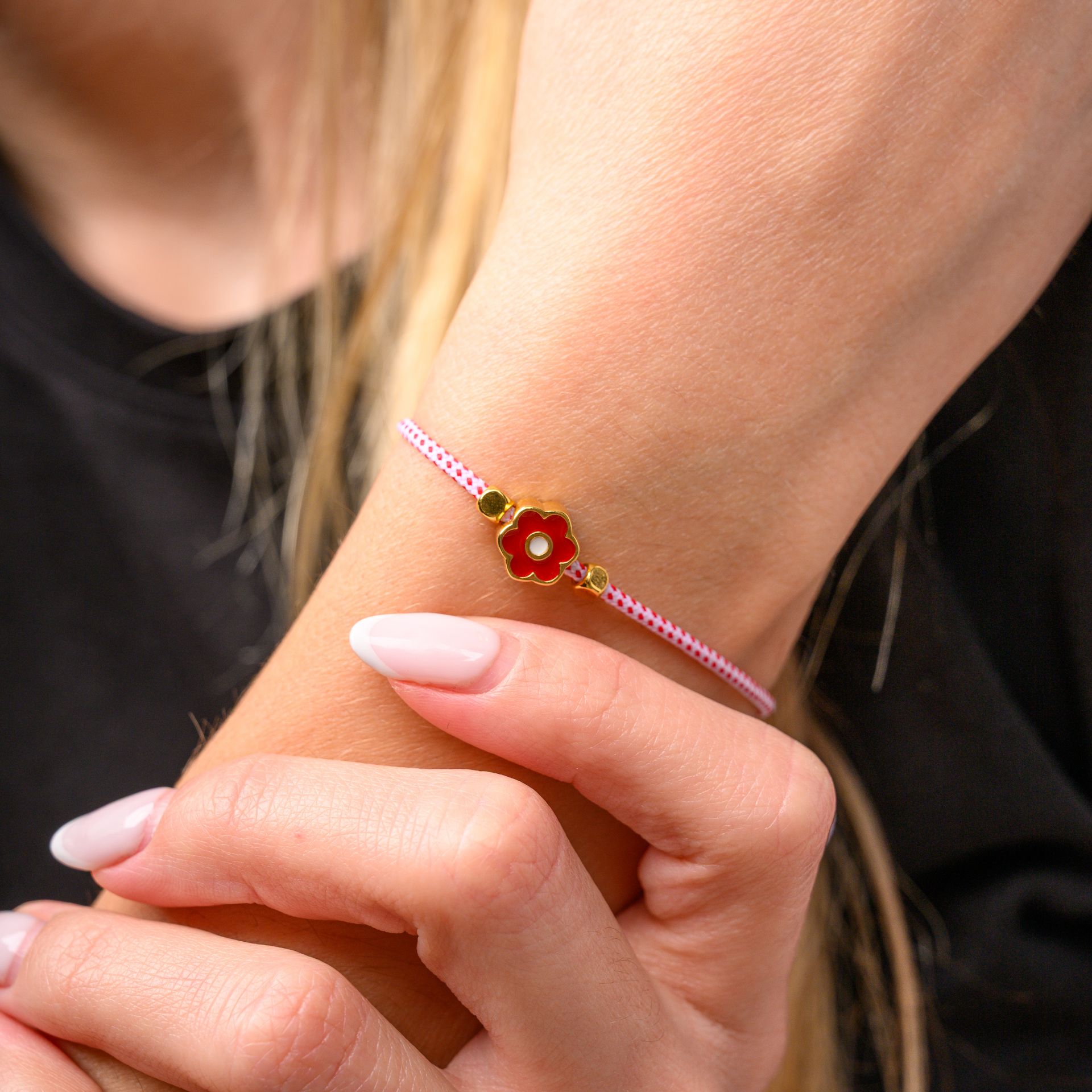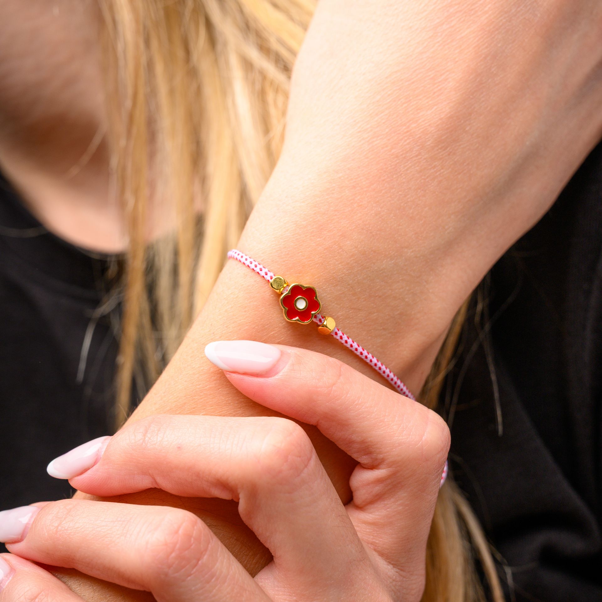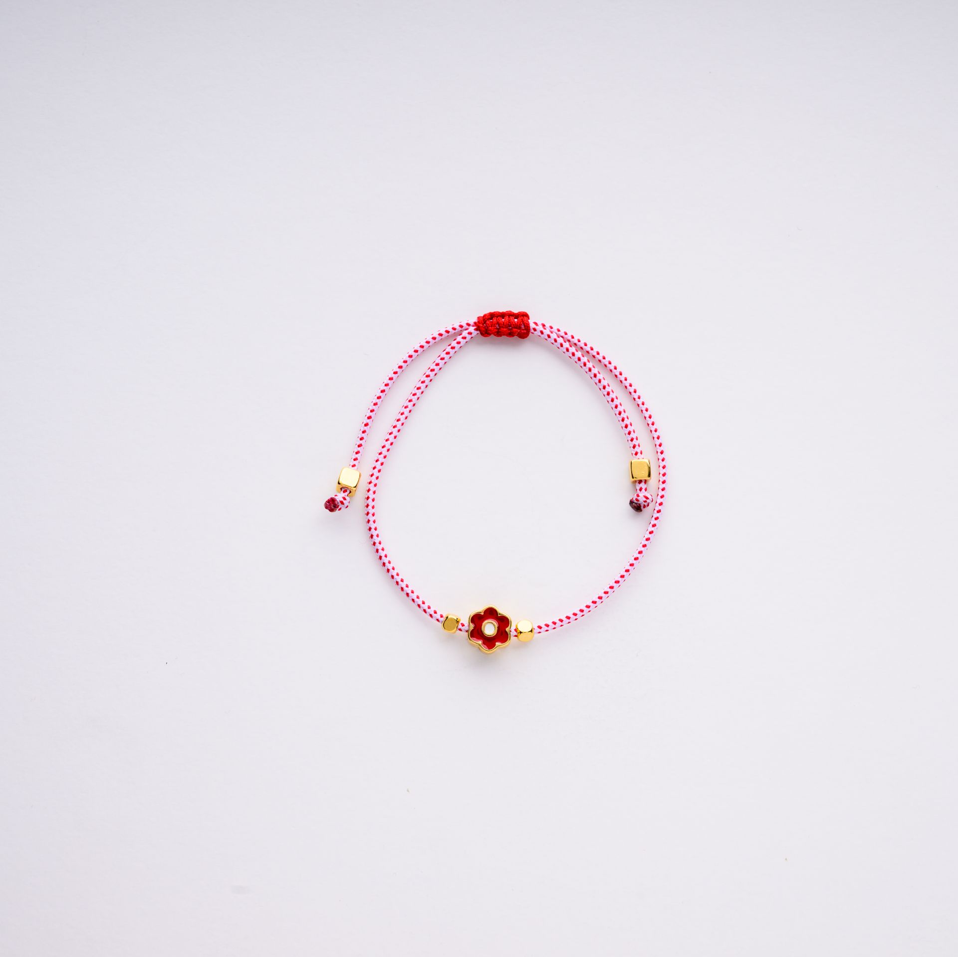 Χειροποίητο μαρτάκι με κόκκινο λουλούδι, κατασκευασμένο από κόκκινο και άσπρο κορδόνι, σχεδιασμένο για απλή και άνετη καθημερινή χρήση κατά τον μήνα του Μαρτίου. Το λουλούδι προσθέτει μια διακριτική χρωματική λεπτομέρεια, διατηρώντας το βραχιόλι ελαφρύ και ευχάριστο στο χέρι.