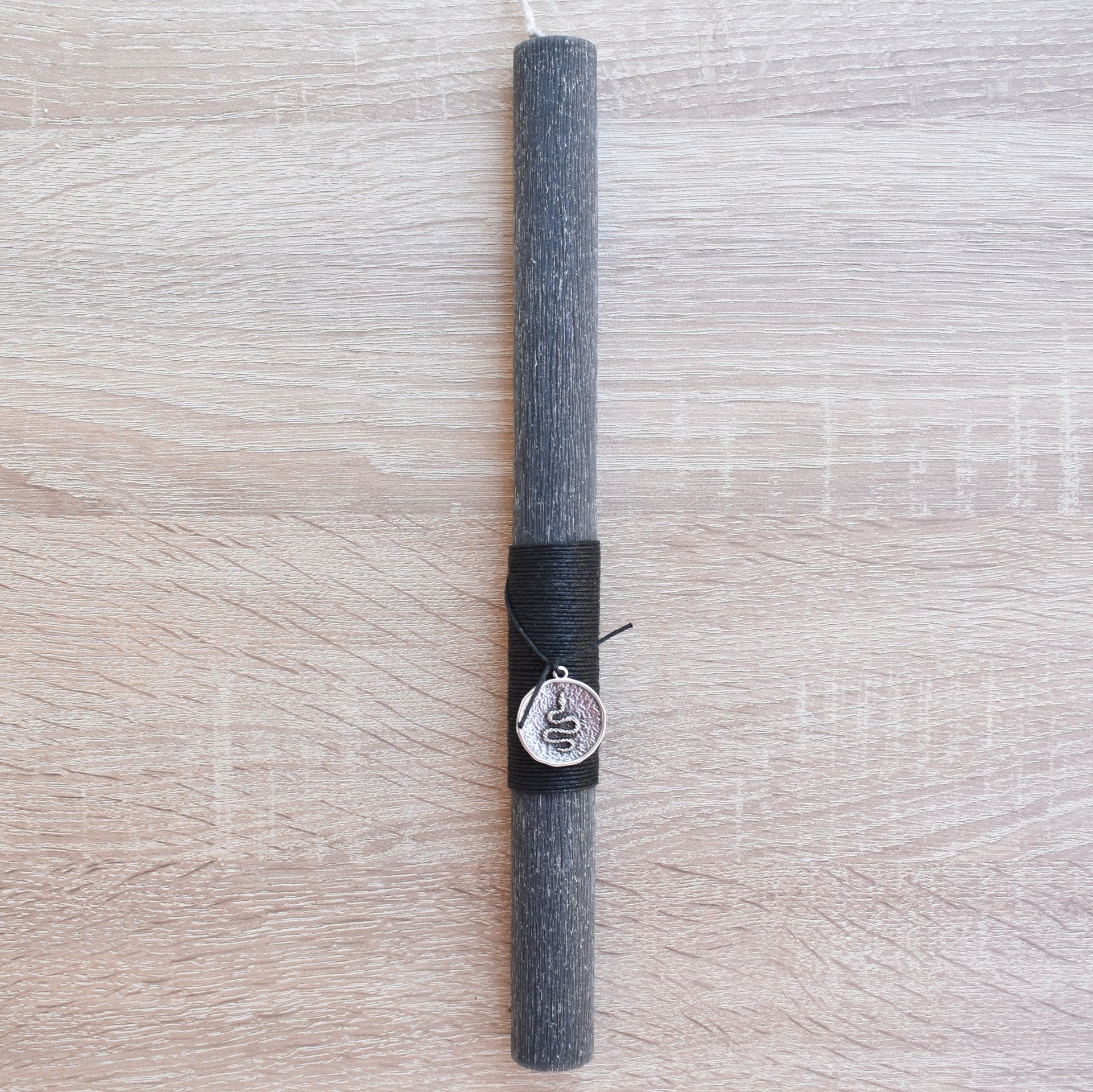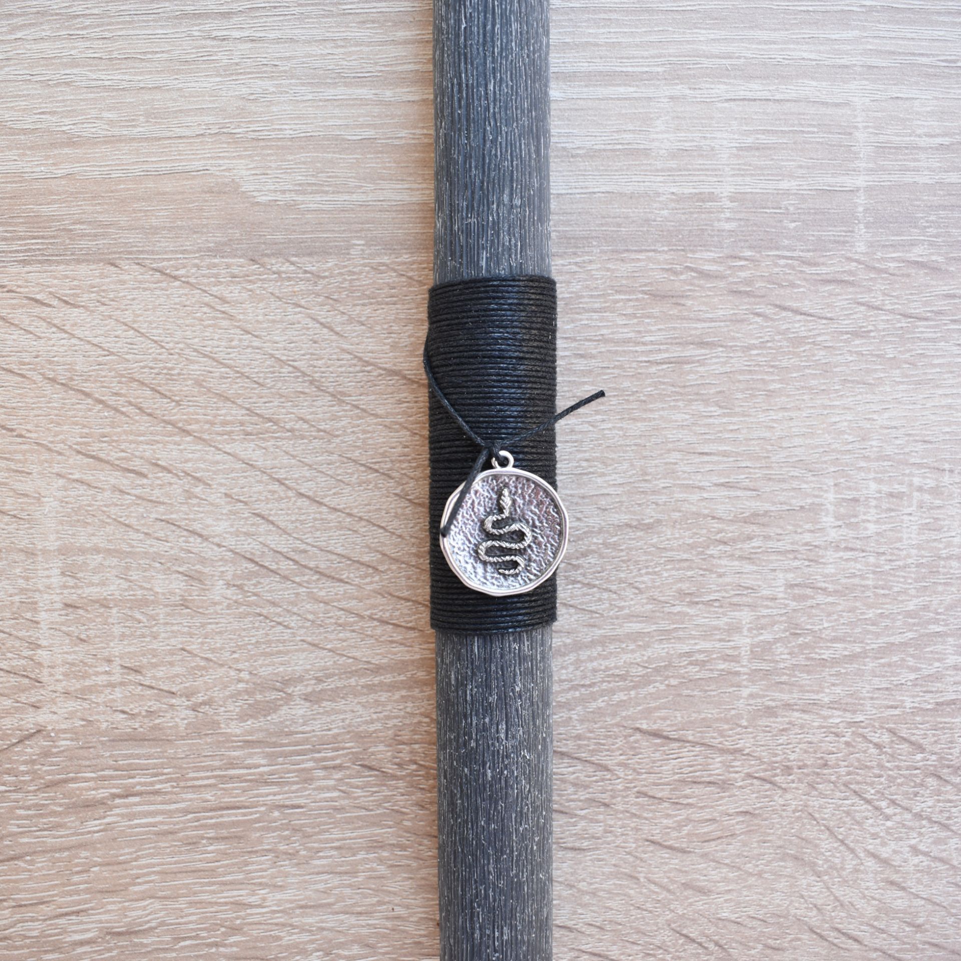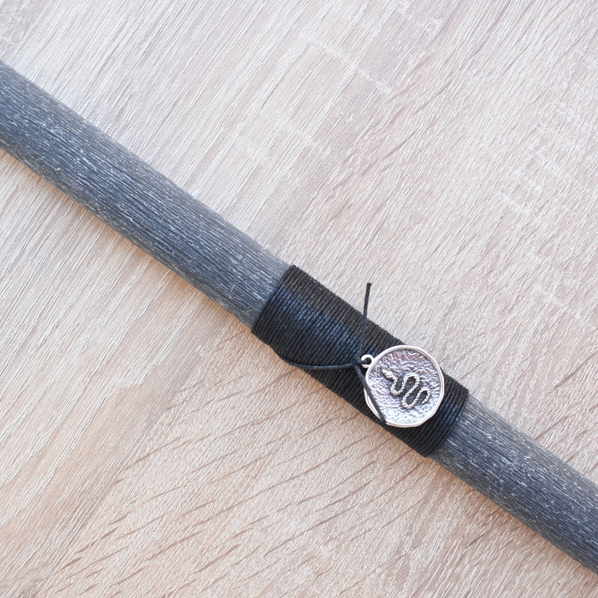 Πασχαλινή λαμπάδα μαύρη με μεταλλικό φίδι, εμπνευσμένη από τον συμβολισμό της μεταμόρφωσης, της δύναμης και της εσωτερικής ενέργειας. Το φίδι αποδίδεται ως διακριτική μεταλλική λεπτομέρεια που προσθέτει χαρακτήρα και βάθος, χωρίς να αλλοιώνει τον λιτό σχεδιασμό της λαμπάδας.