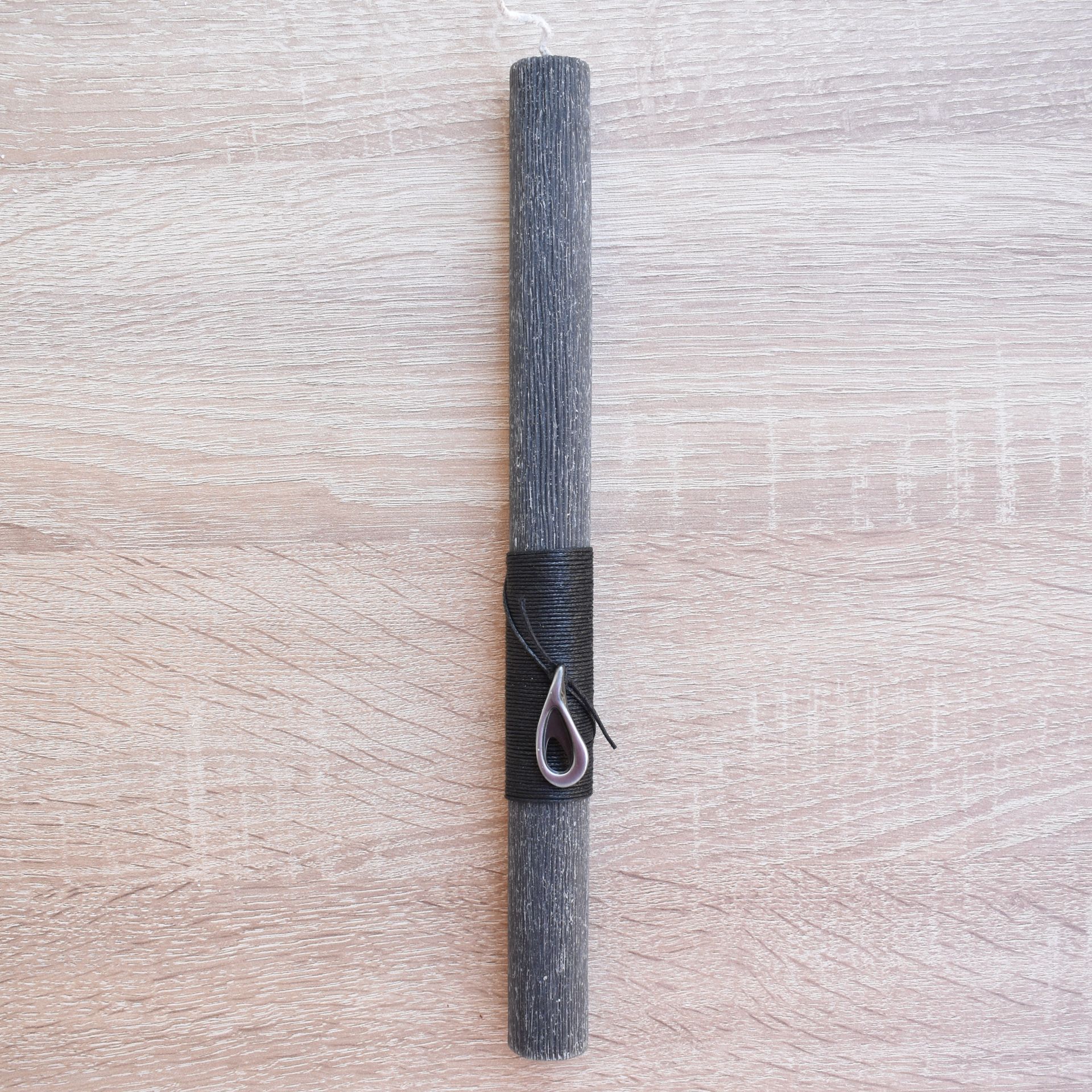 Πασχαλινή λαμπάδα μαύρη με μεταλλική σταγόνα, σχεδιασμένη για όσους επιλέγουν καθαρές γραμμές και διακριτικό συμβολισμό. Η μεταλλική σταγόνα λειτουργεί ως ήρεμο αλλά ουσιαστικό στοιχείο, προσθέτοντας βάθος στο σχέδιο χωρίς να το φορτώνει οπτικά.