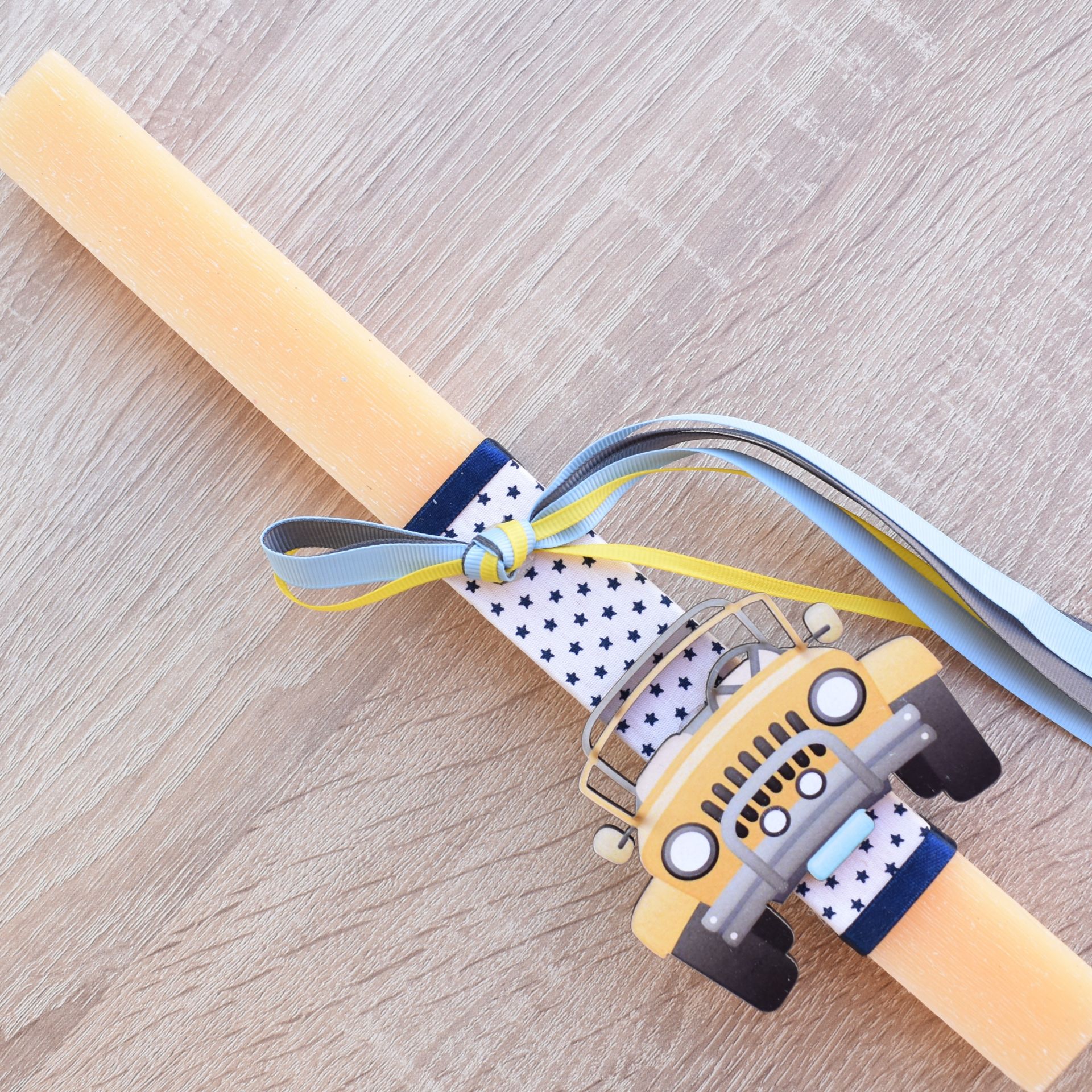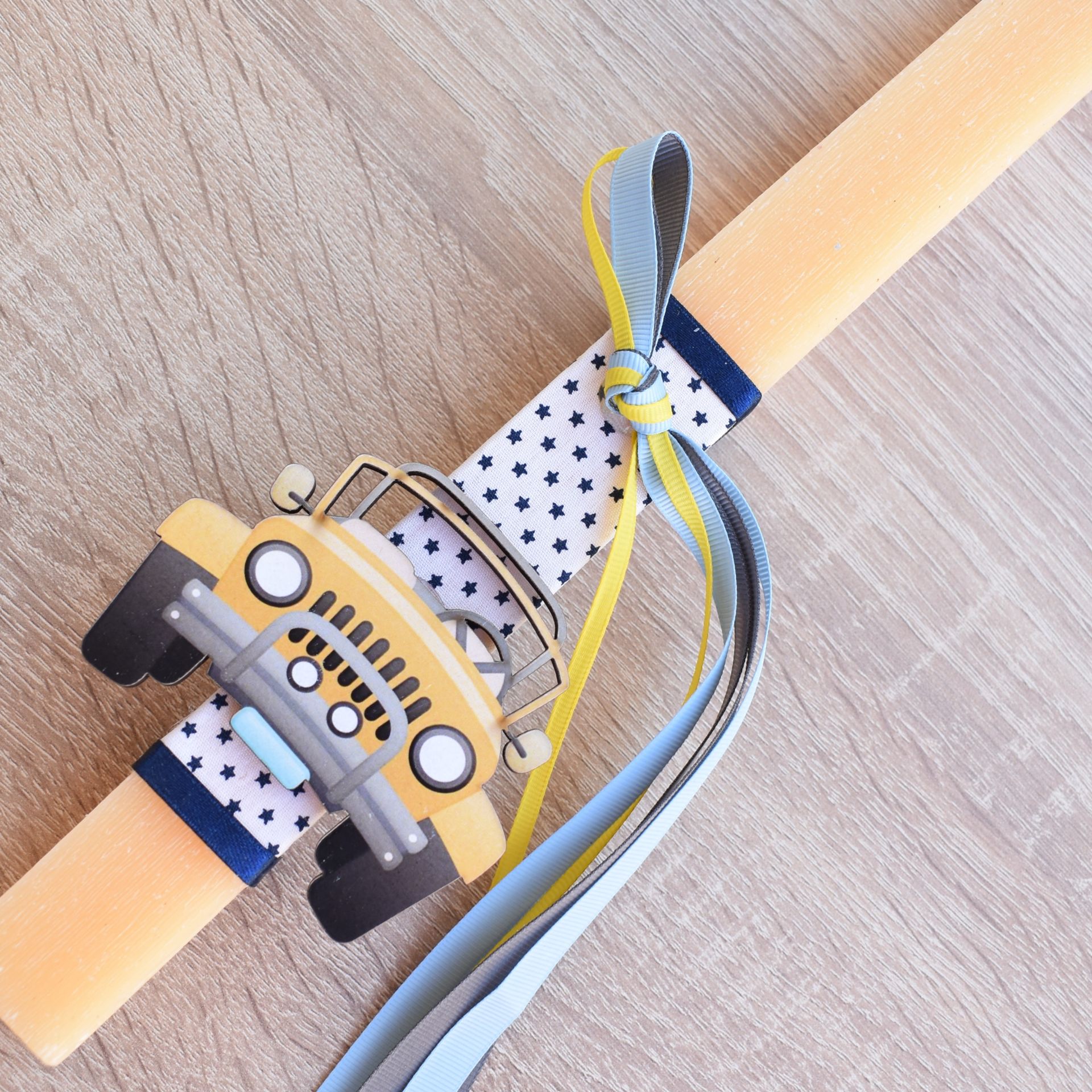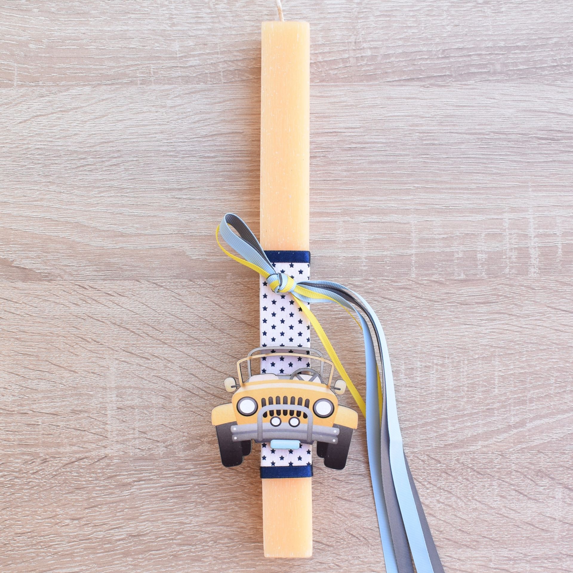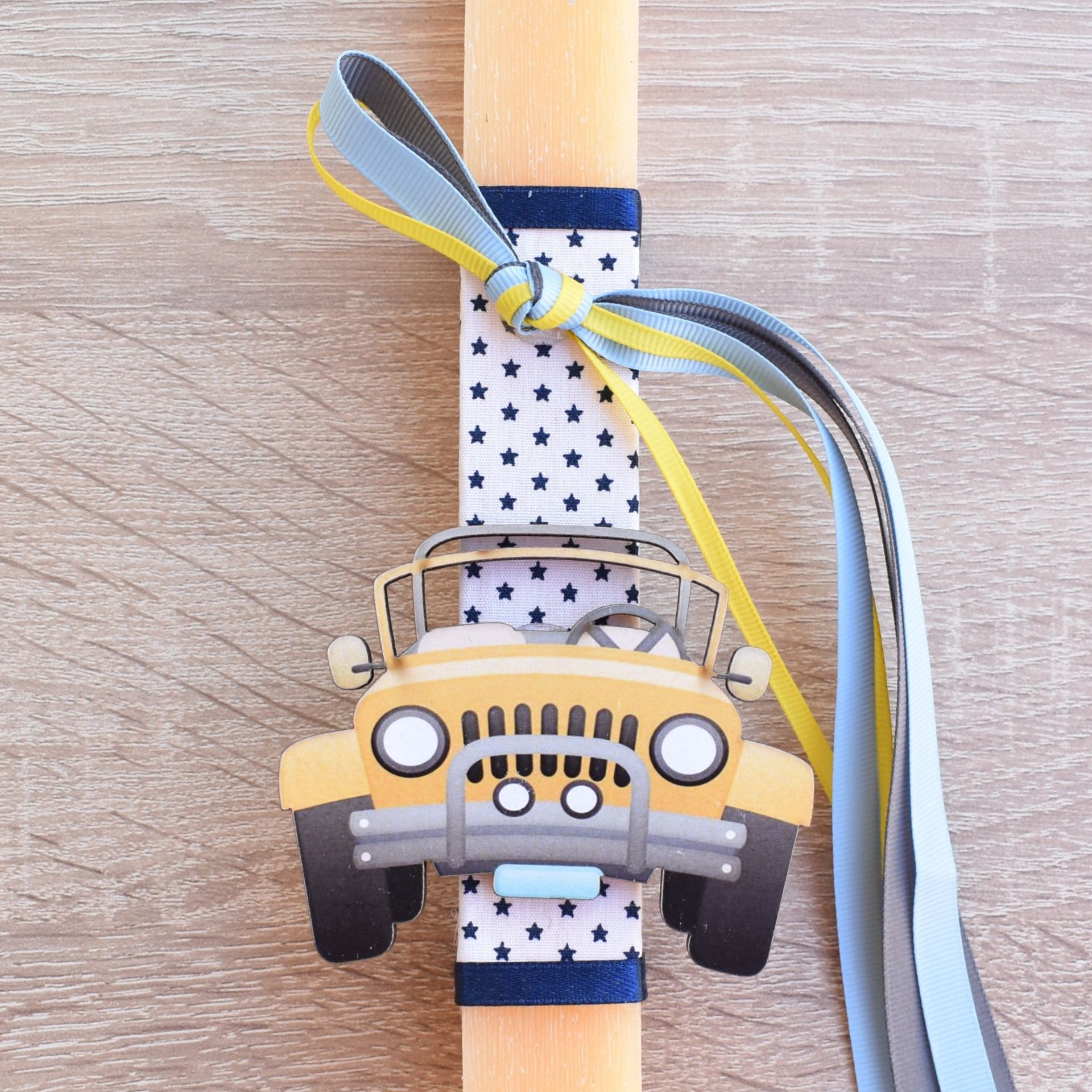 Αγορίστικη πασχαλινή λαμπάδα με ξύλινο αυτοκίνητο, ιδανική επιλογή για αγόρια που αγαπούν τα οχήματα και το παιχνίδι.