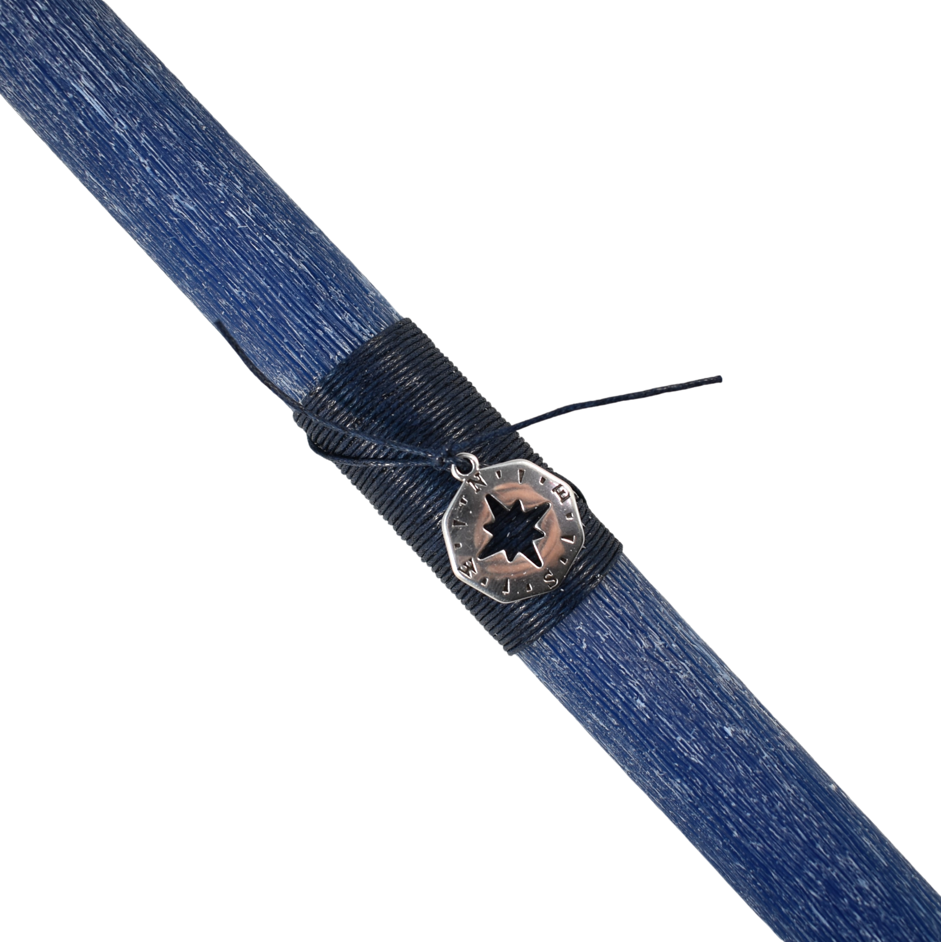 Το μπλε χρώμα παραπέμπει στη θάλασσα, το ταξίδι και την εσωτερική ηρεμία, καθιστώντας τη λαμπάδα ιδανική επιλογή για άντρες και εφήβους που αναζητούν πασχαλινές λαμπάδες αντρικές με διαχρονικό χαρακτήρα. Το μεταλλικό στοιχείο ξεχωρίζει διακριτικά πάνω στο κερί και λειτουργεί ως σύμβολο προσανατολισμού και συνέπειας.