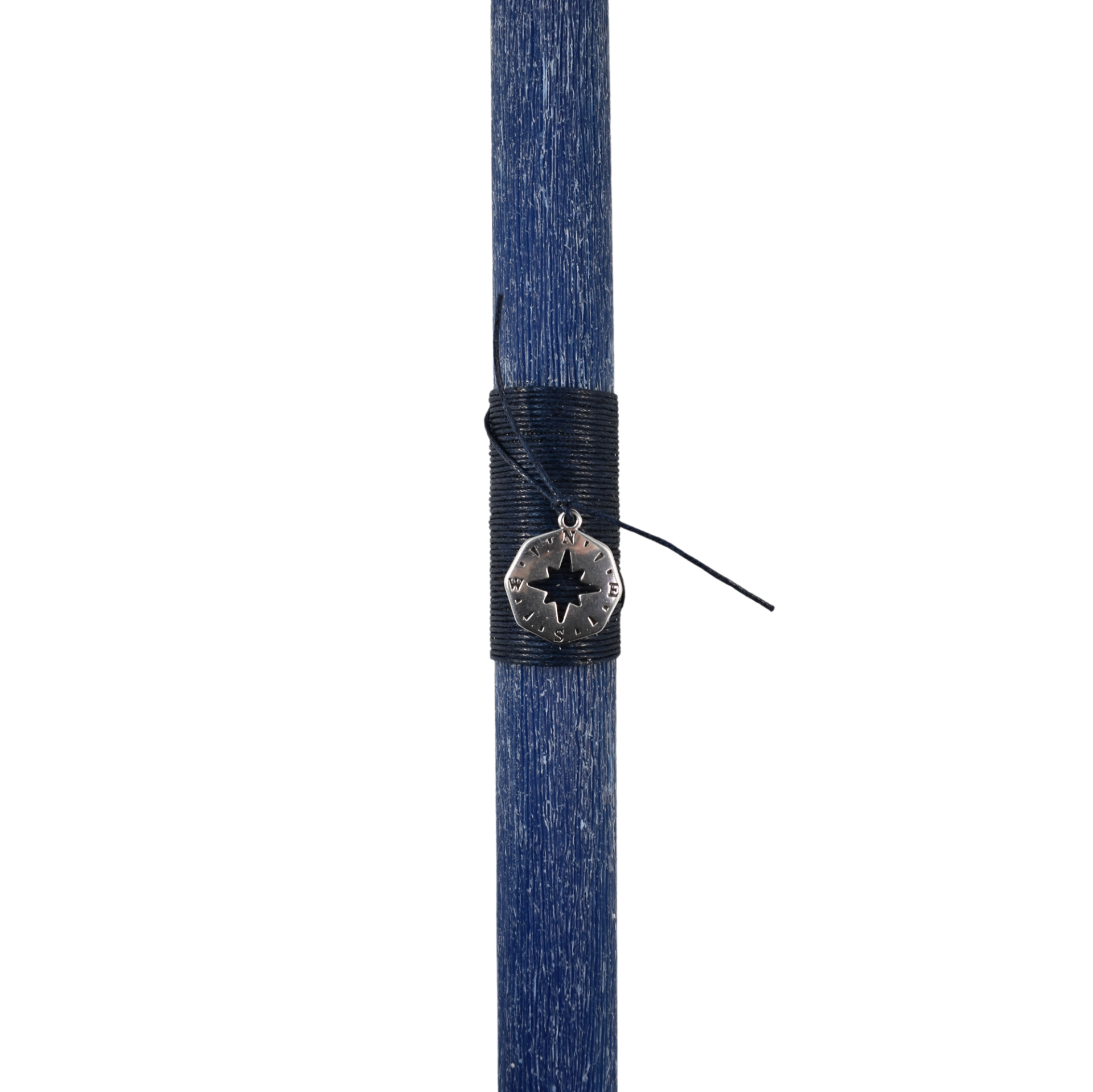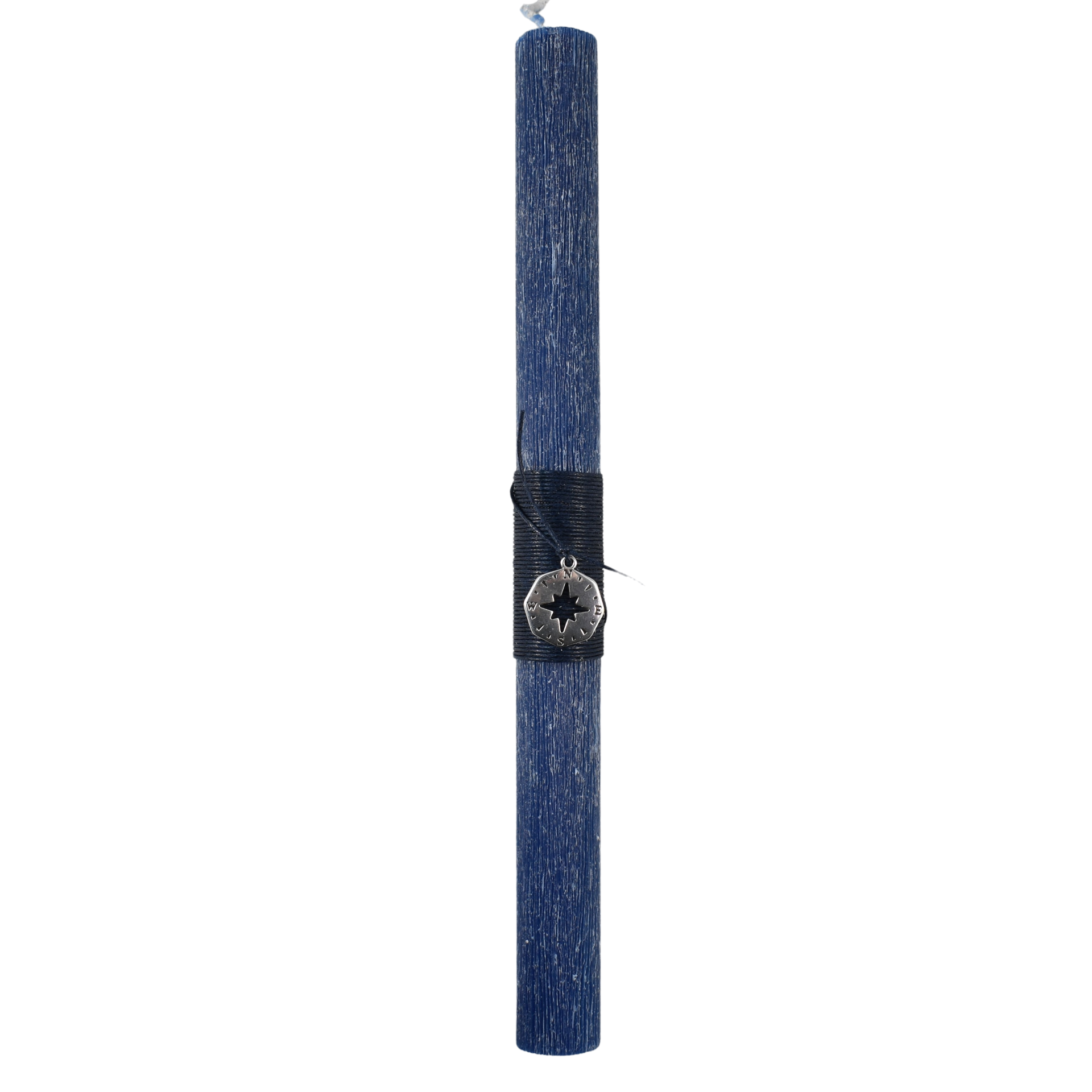 Χειροποίητη μπλε πασχαλινή λαμπάδα με μεταλλική πυξίδα, εμπνευσμένη από την έννοια της κατεύθυνσης, της σταθερότητας και της προσωπικής πορείας. Η πυξίδα αποδίδεται ως καθαρό μεταλλικό στοιχείο που προσθέτει ουσιαστικό νόημα στη λαμπάδα, χωρίς να αλλοιώνει τον ισορροπημένο και λιτό σχεδιασμό της.