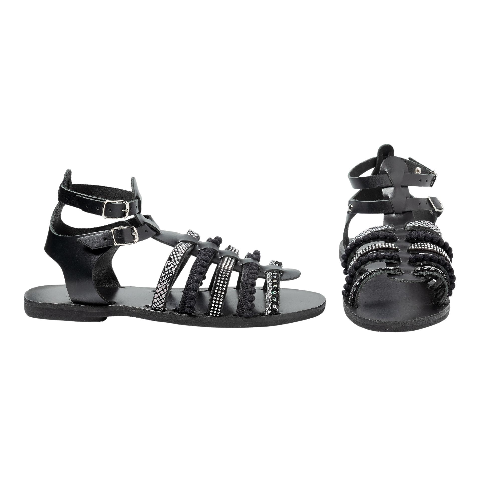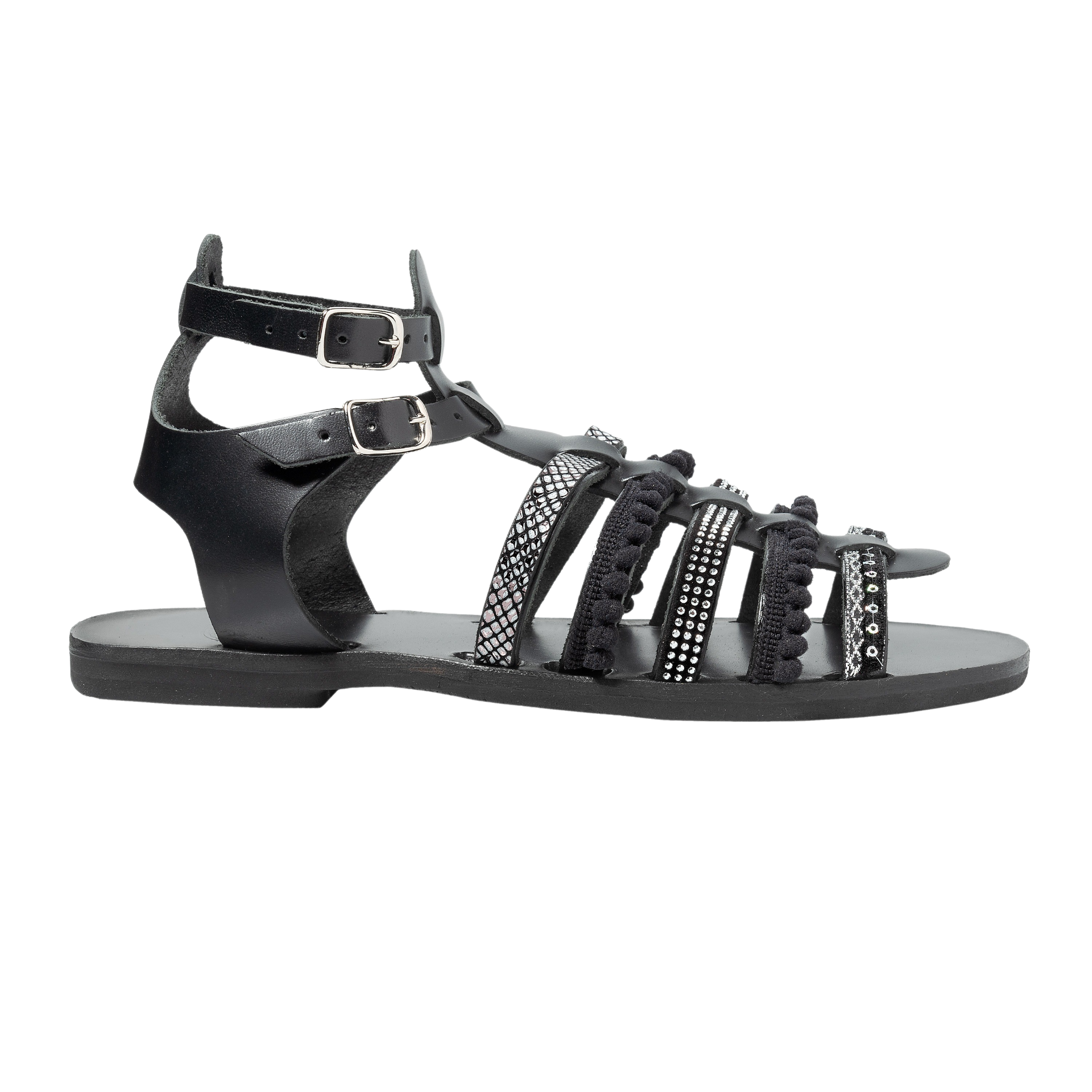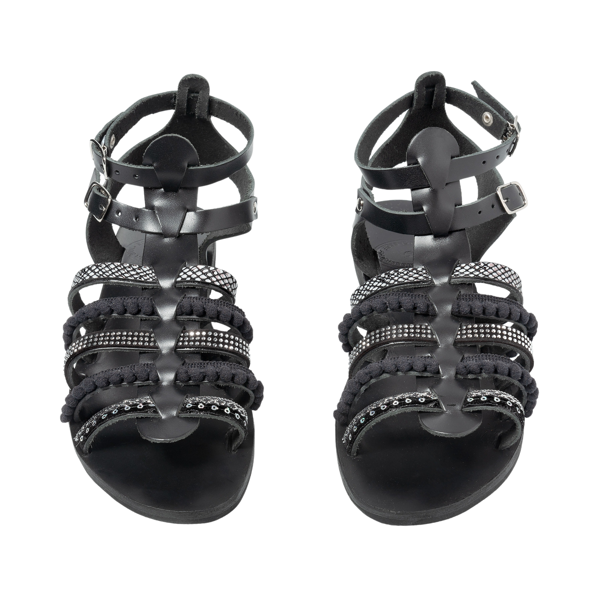 A black sandal with double buckle straps around the ankle and several upper straps adorned with different textures and embellishments.