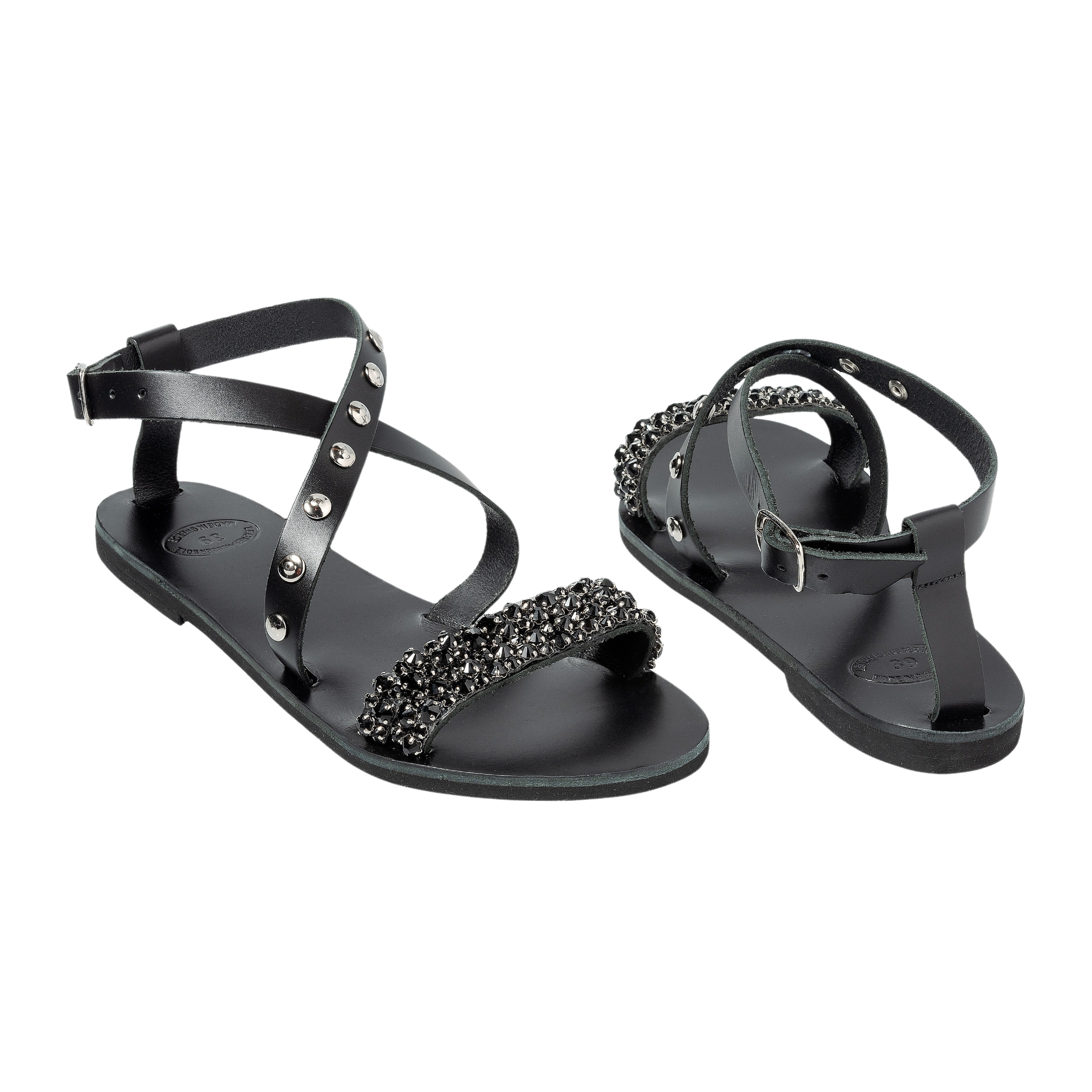 A black sandal with a buckle ankle strap and two upper straps, one of which is decorated with beads or small embellishments.