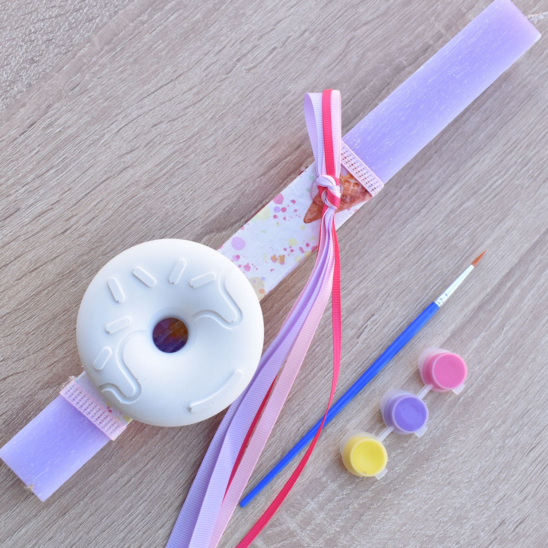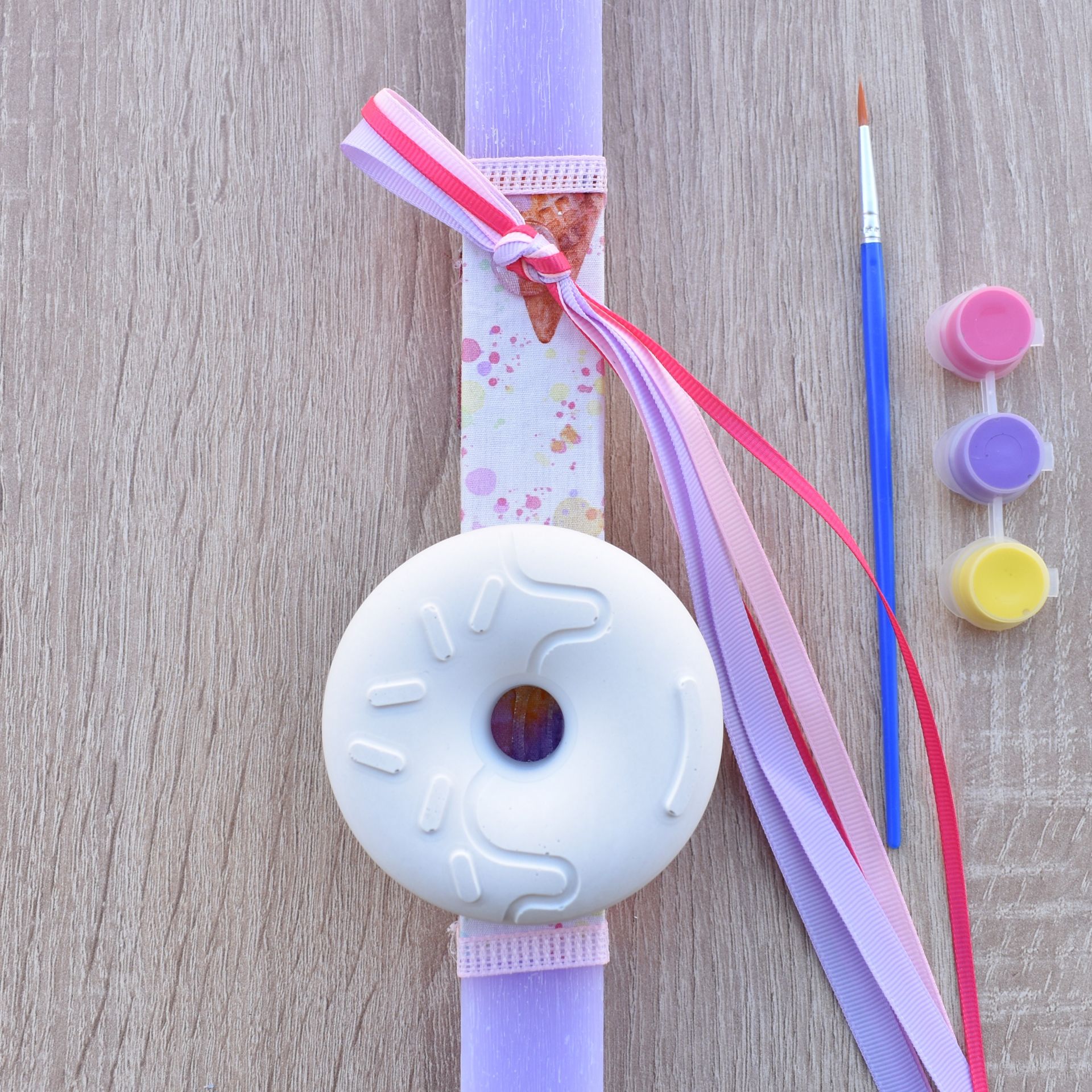 This girls’ Greek Easter candle with donut theme combines the traditional Orthodox Easter candle with a fun creative activity. The Easter candle for girls includes a plaster donut decoration, along with a brush and paints, allowing the child to color it in her own unique style.