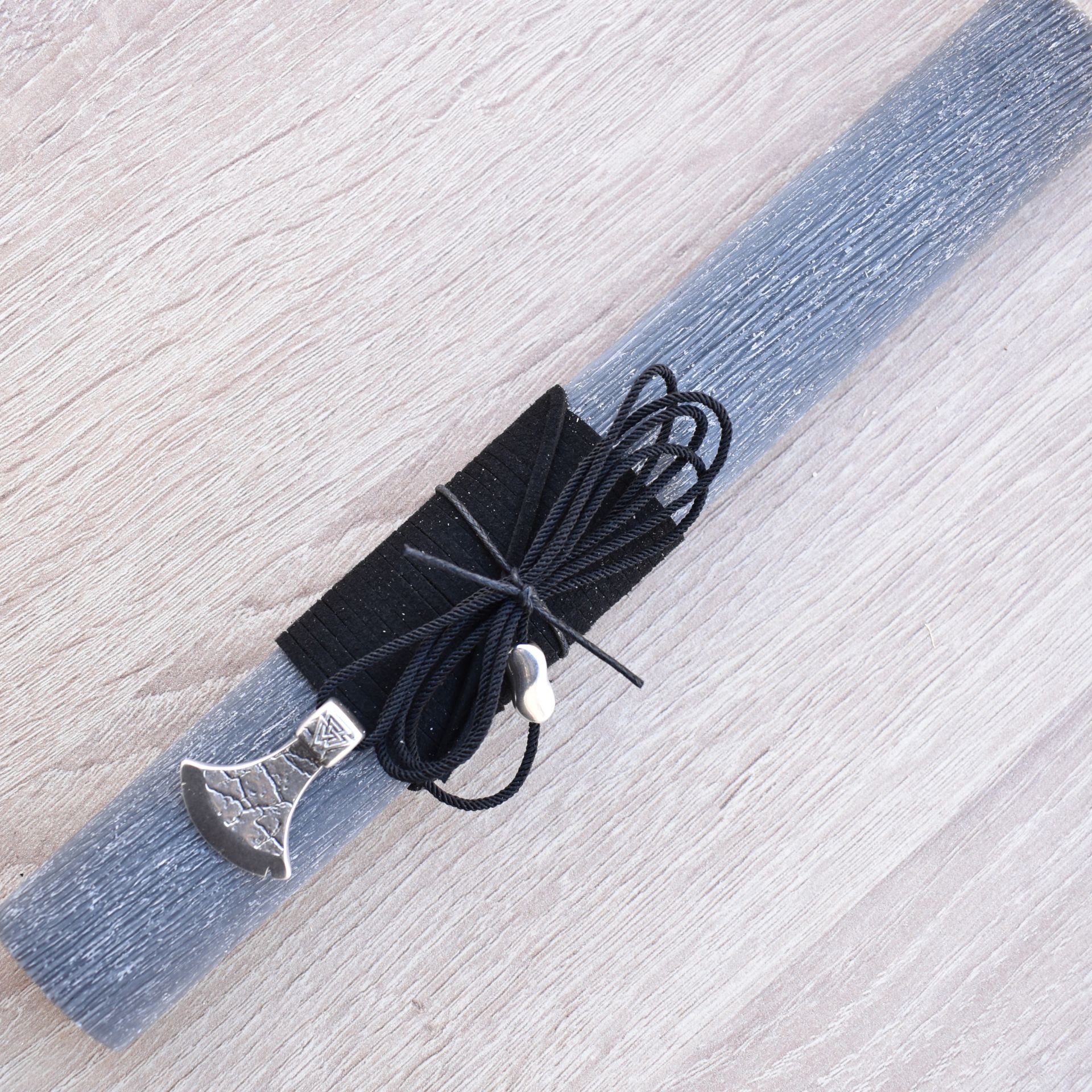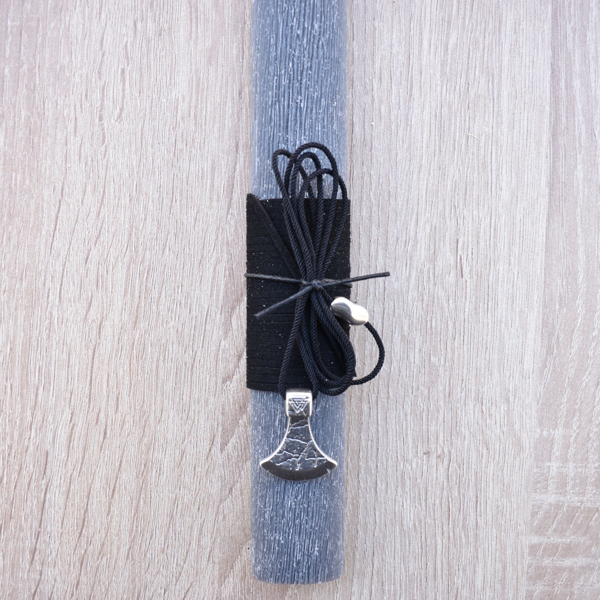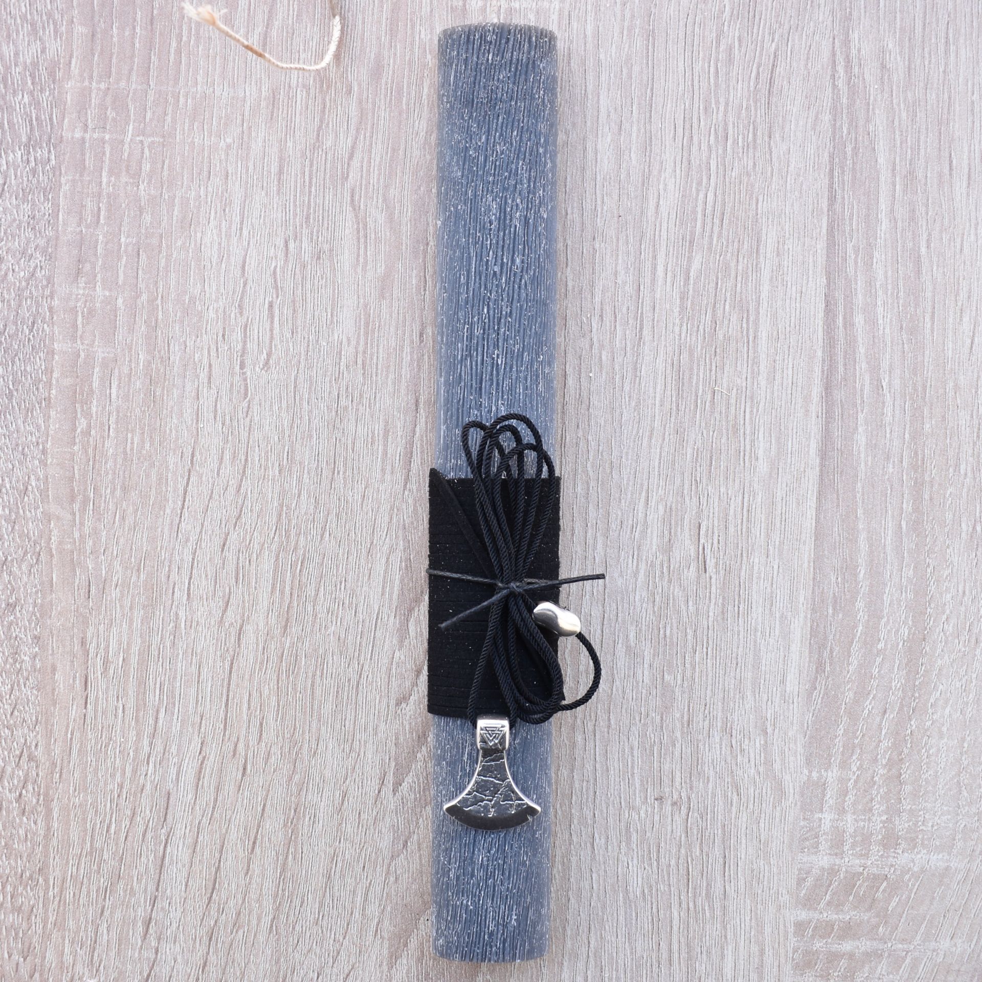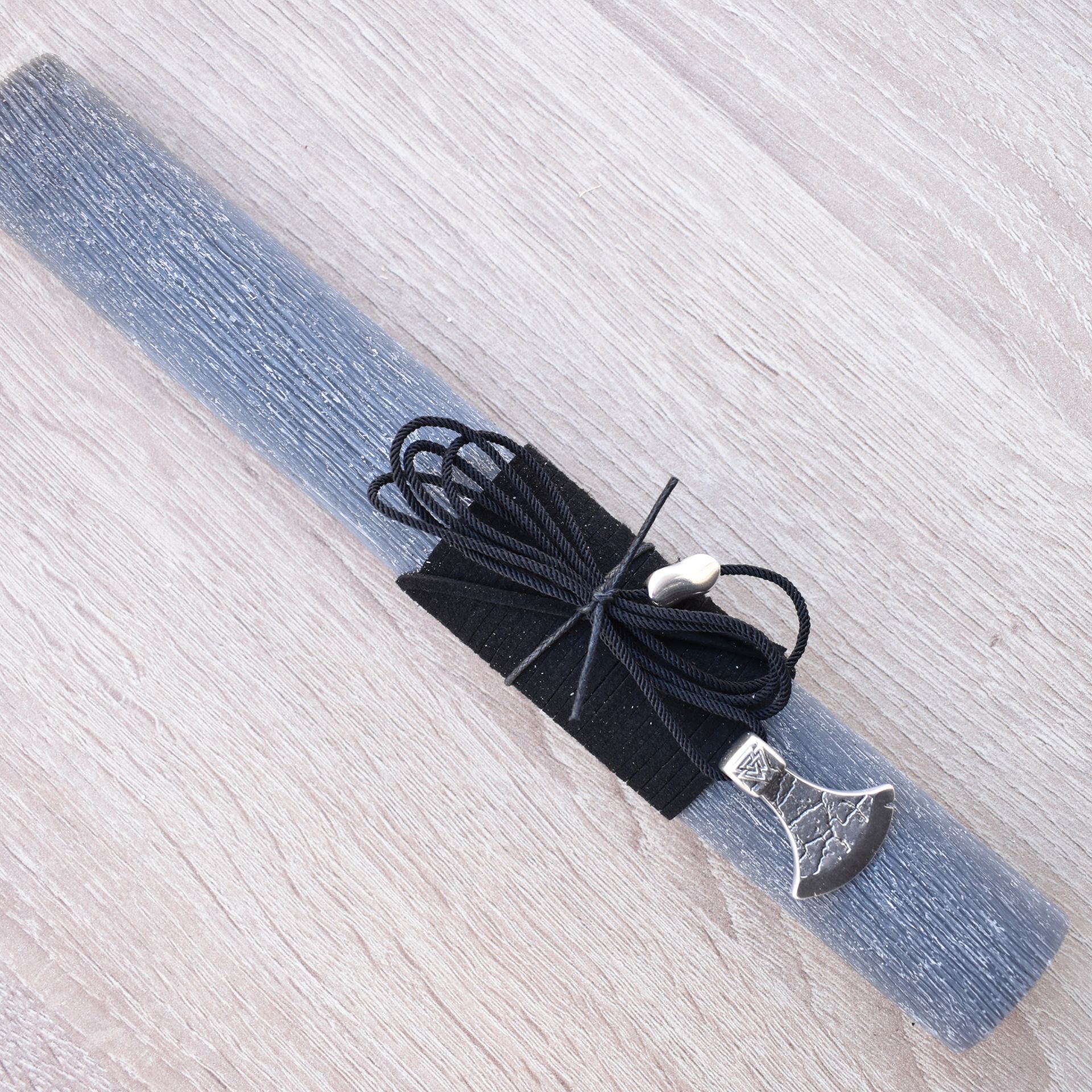 Easter candle decorated with a neclace with a metallic axe.