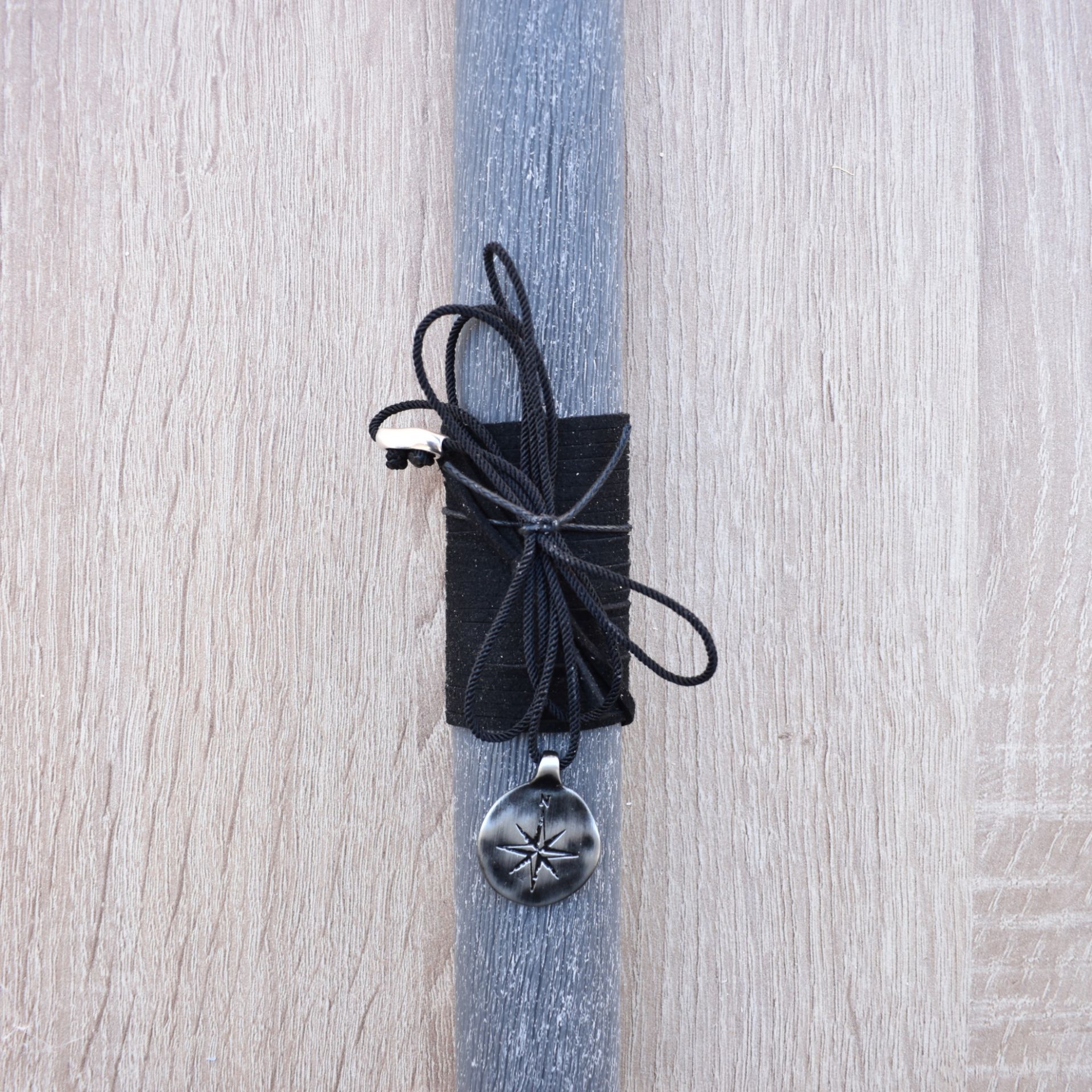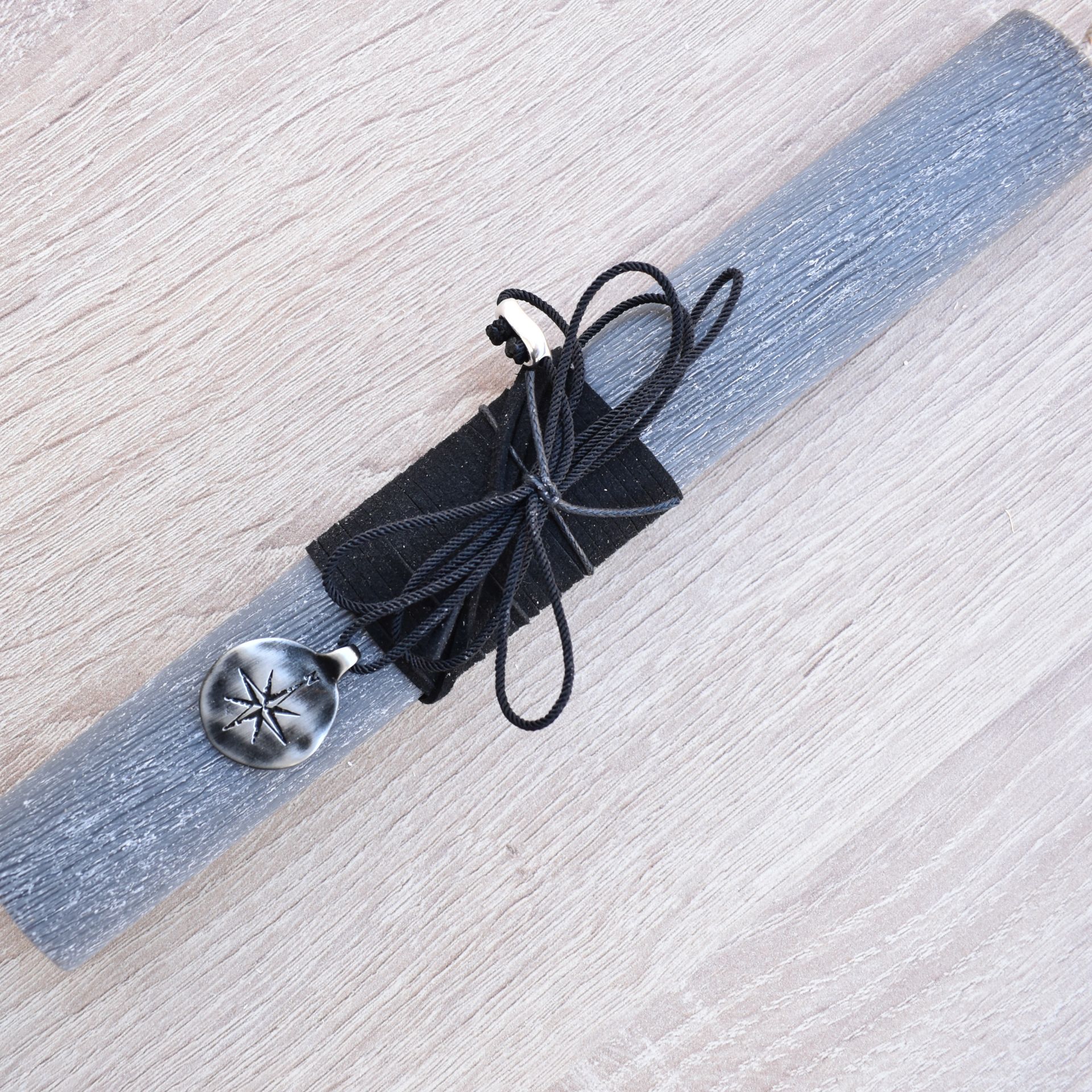 Easter candle decorated with a neclace with a metallic compass