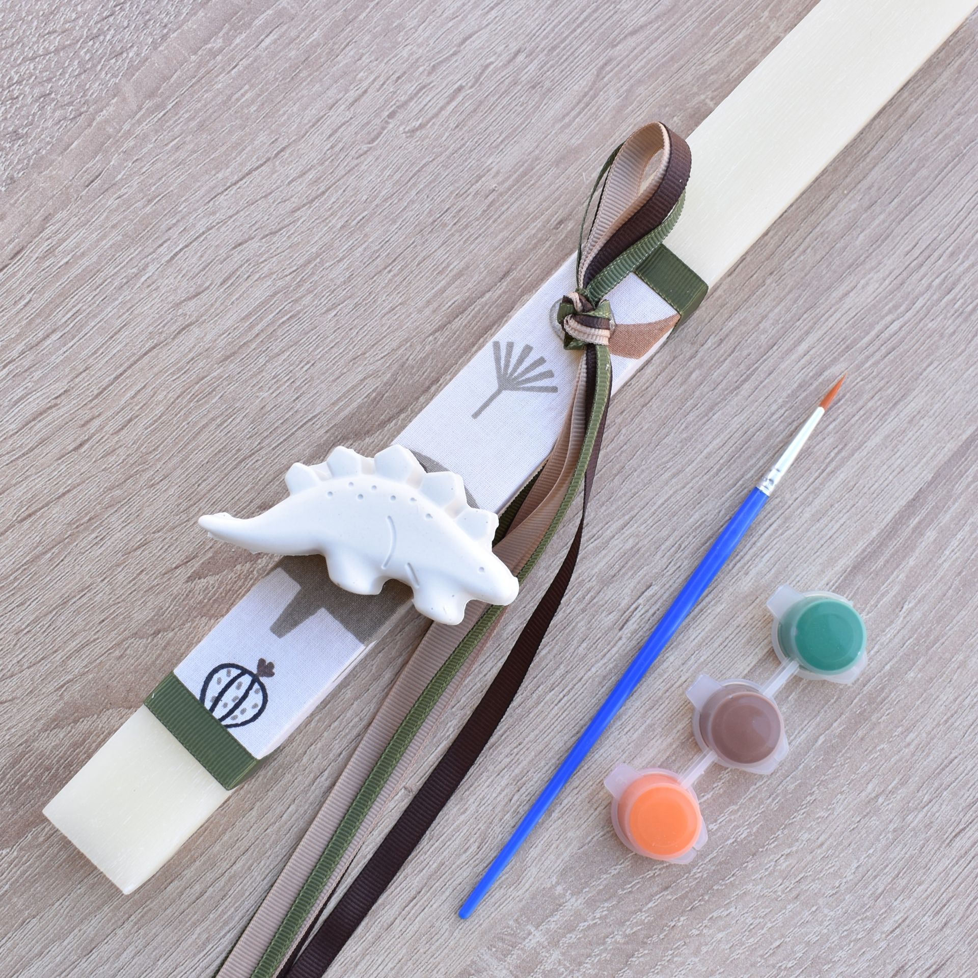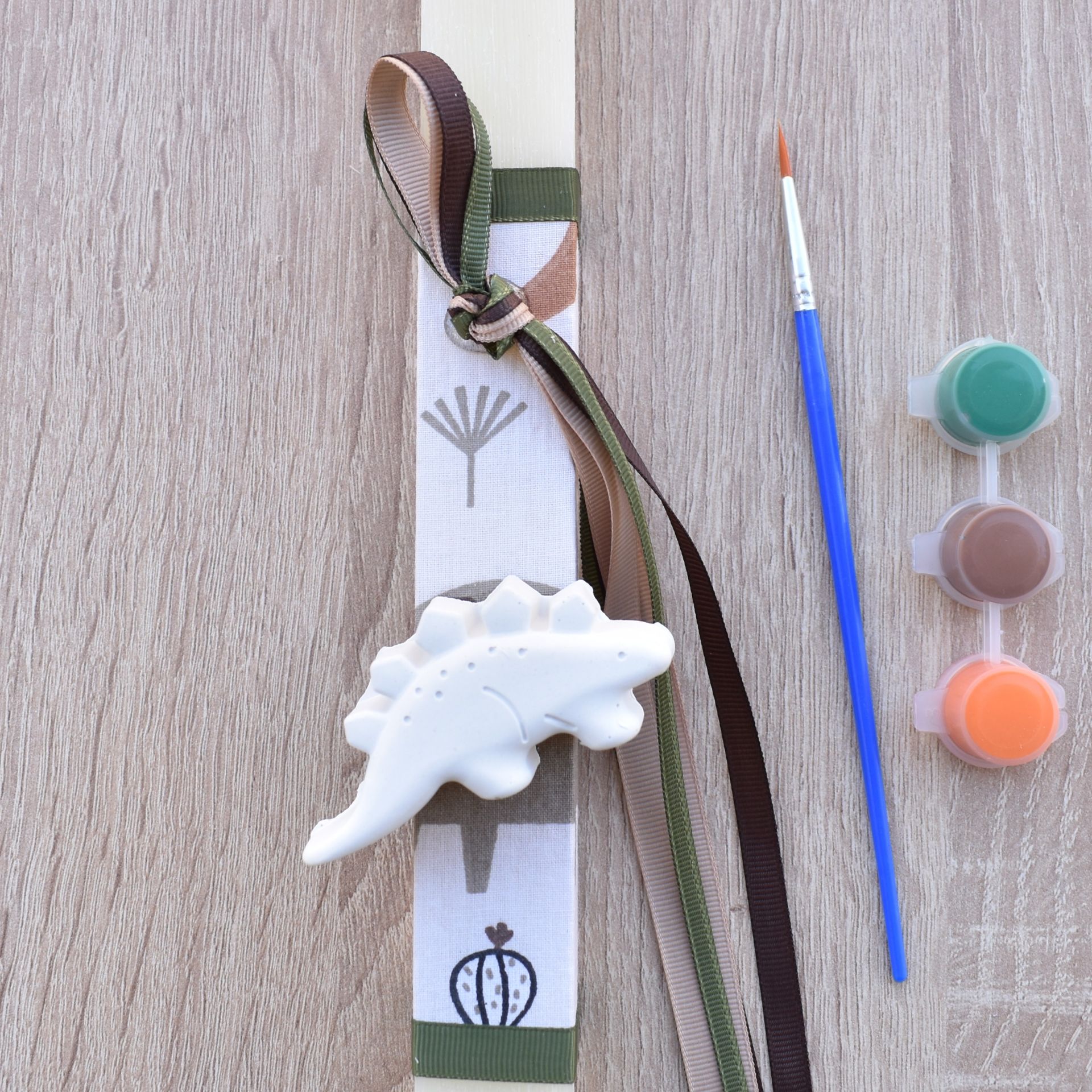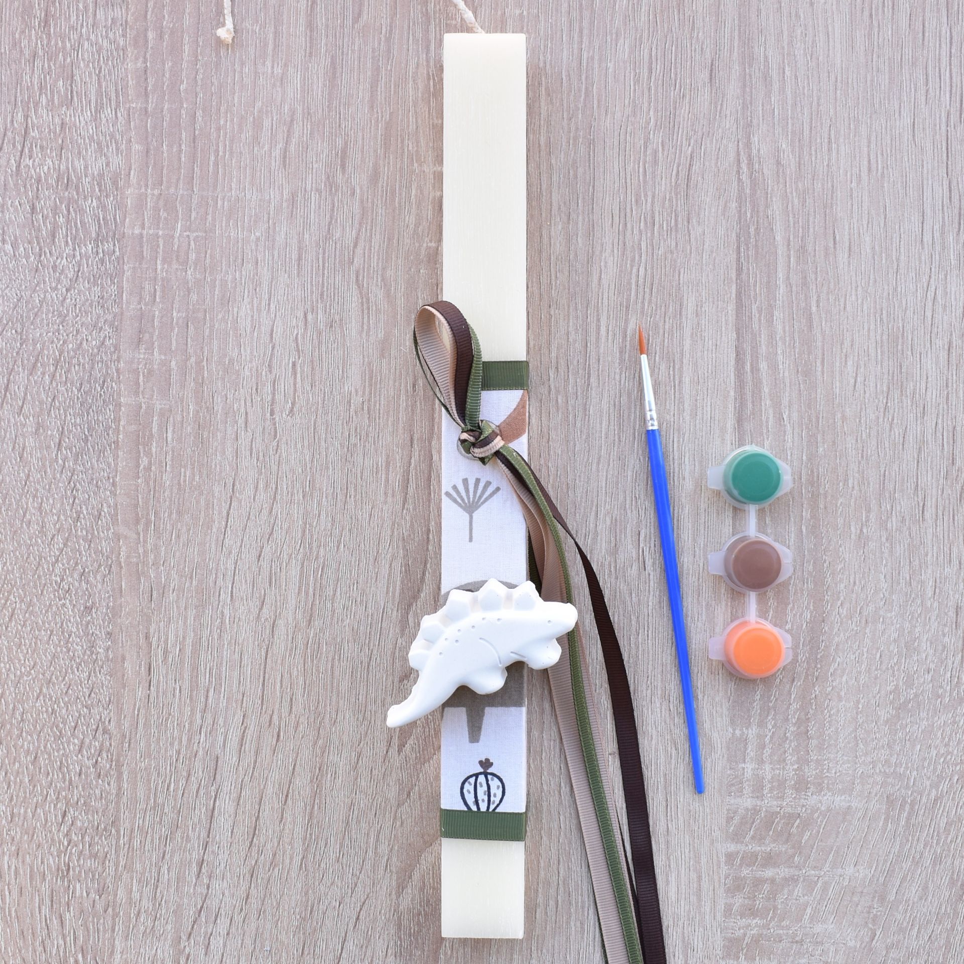 This boys’ Greek Easter candle with dinosaur theme combines the traditional Orthodox Easter candle with an exciting creative activity. The Easter candle for boys includes a plaster dinosaur decoration, along with a brush and paints, allowing the child to color it in his own unique way.