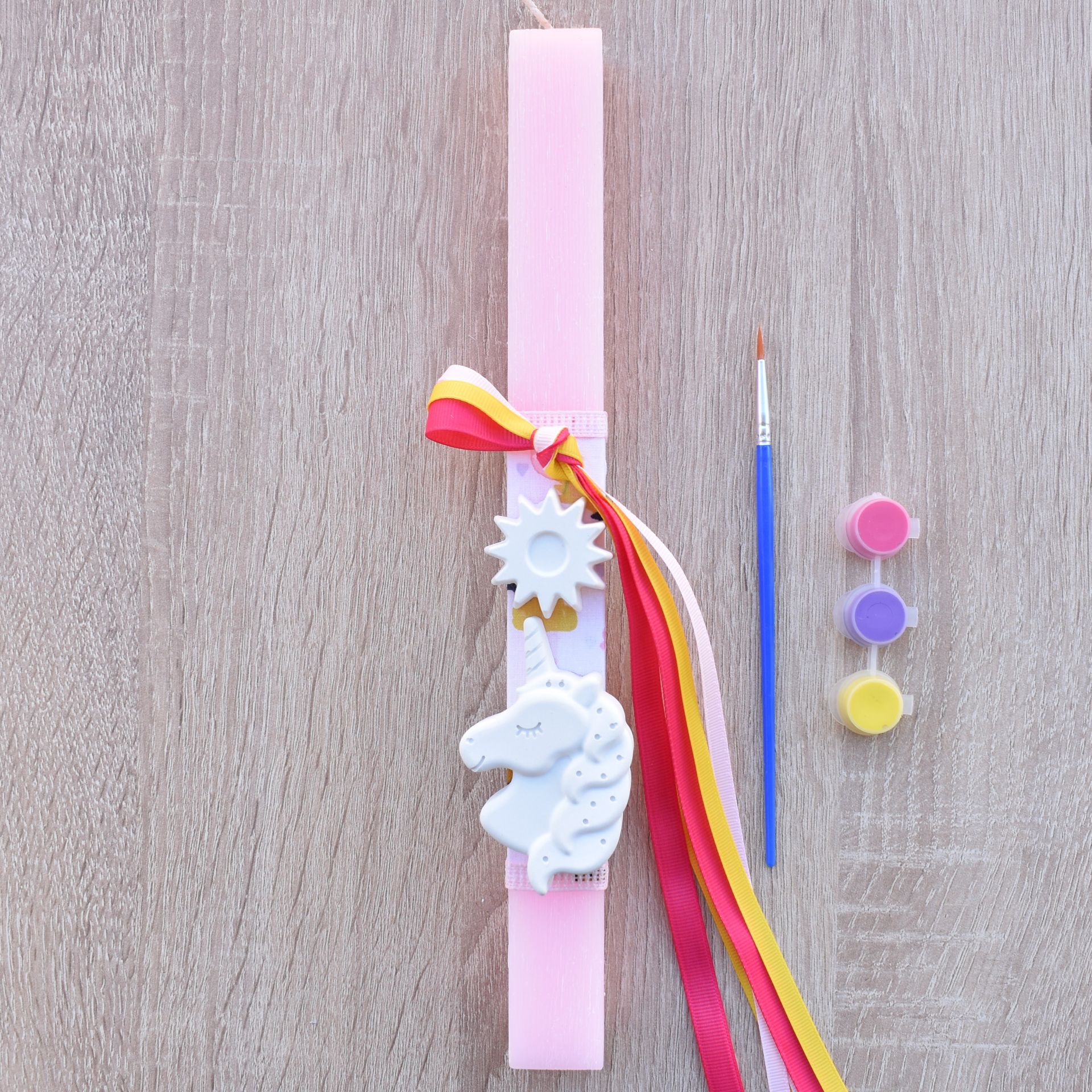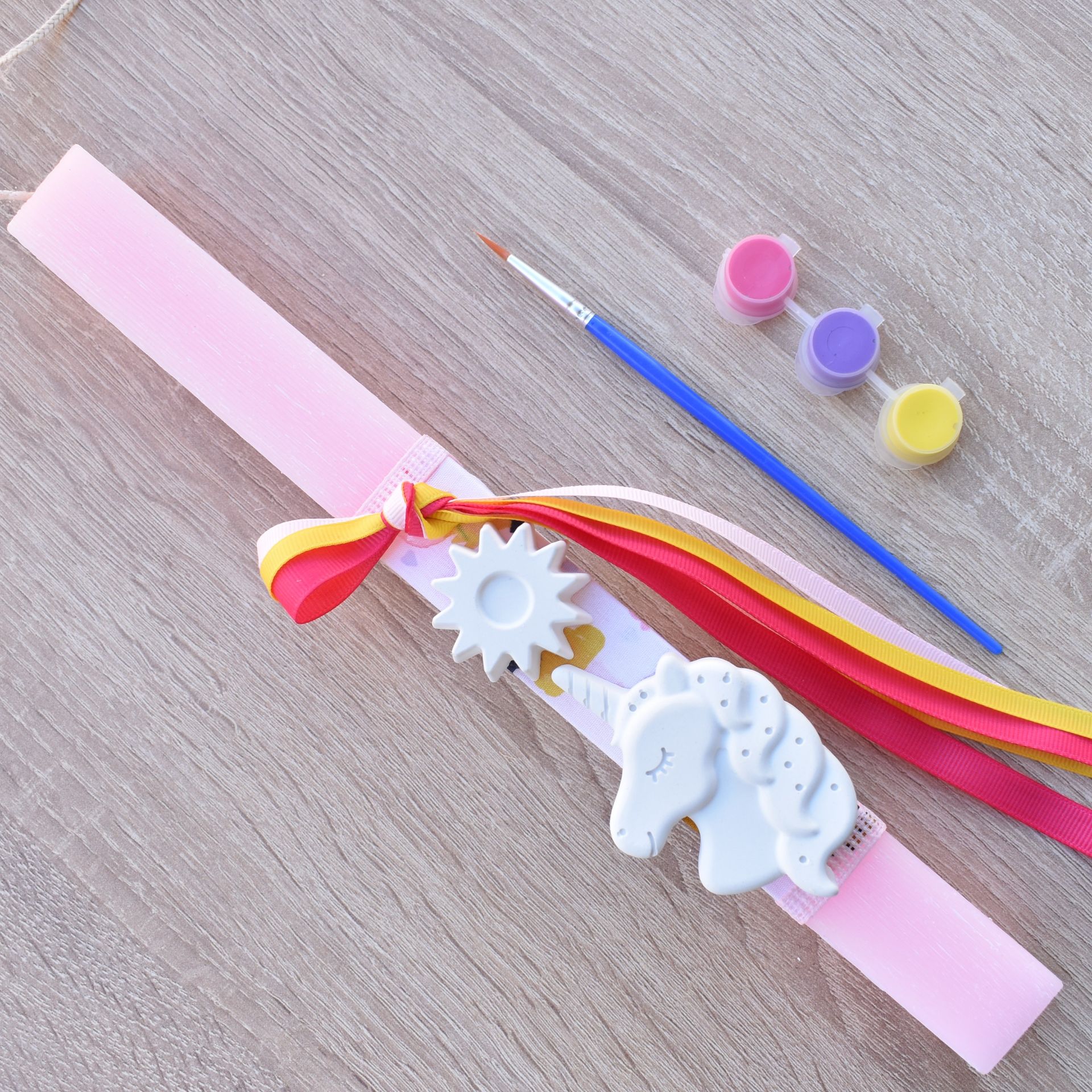 This girls’ Easter lambatha with unicorn combines the traditional Orthodox Easter candle with a fun creative activity. The candle includes a plaster unicorn decoration, along with a brush and paints, so the girl can color it in her own unique way.