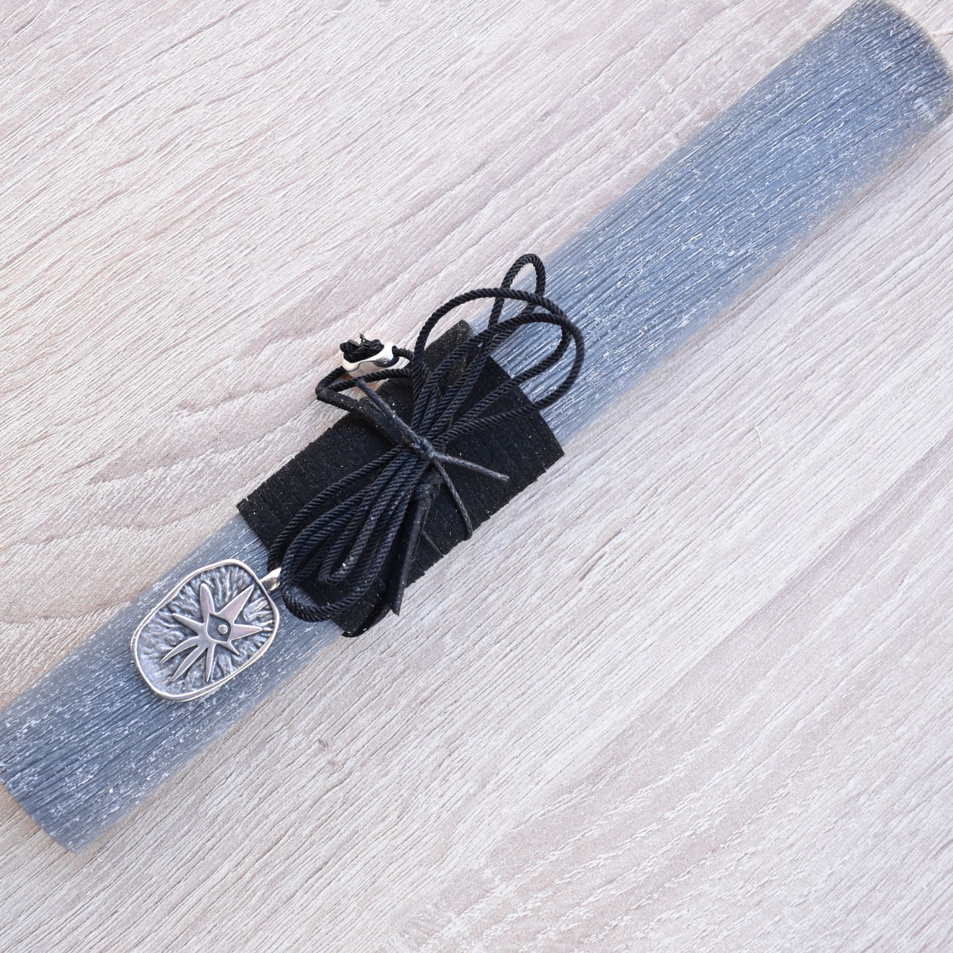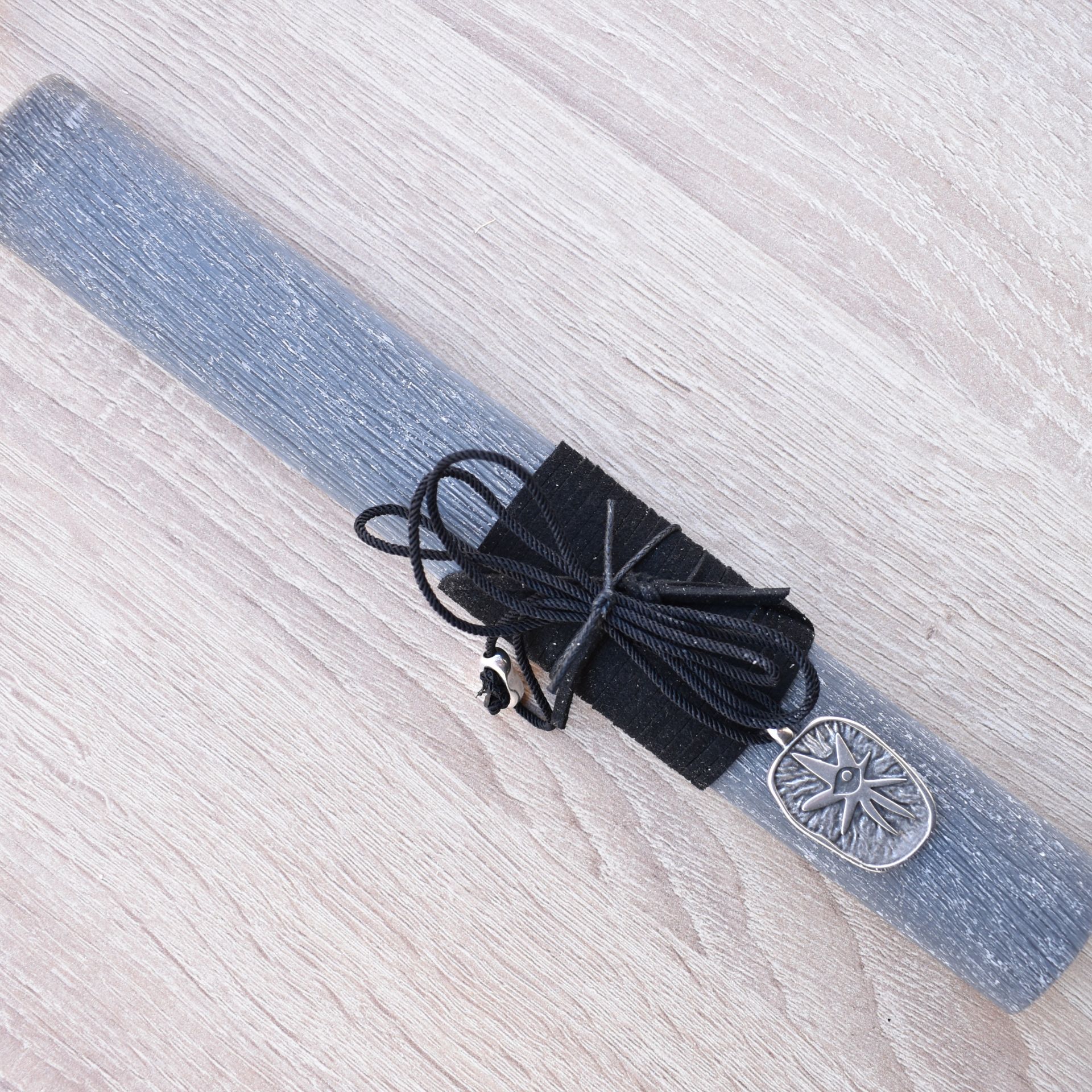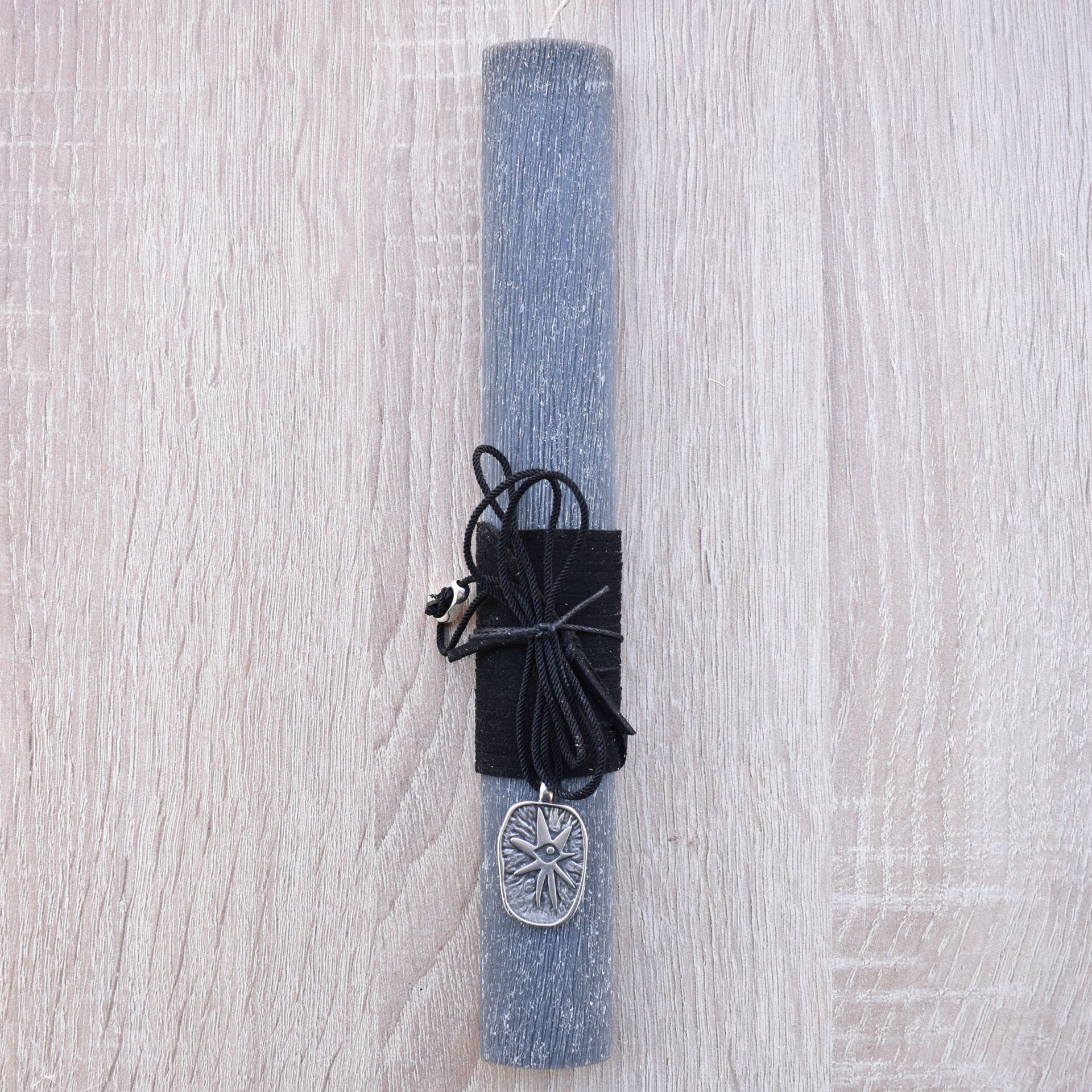 Easter candle decorated with a neclace with a metallic evil eye.
