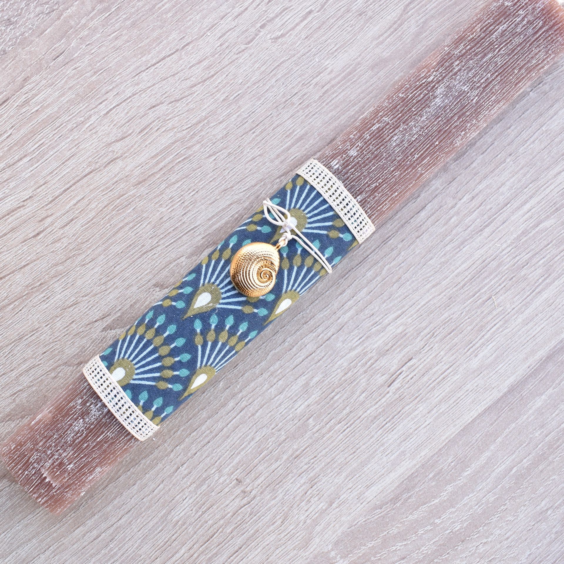 Easter candle decorated with a metallic seashell