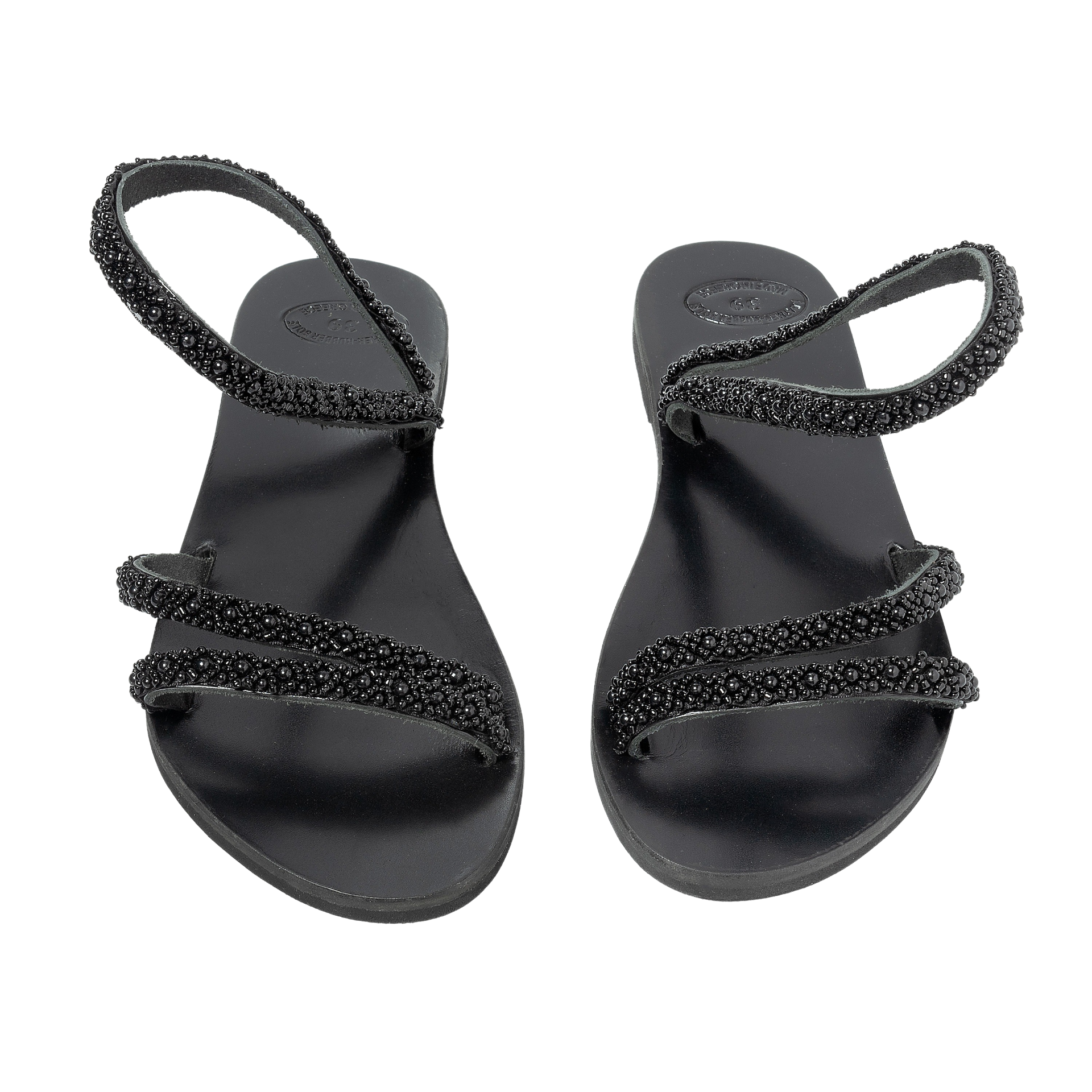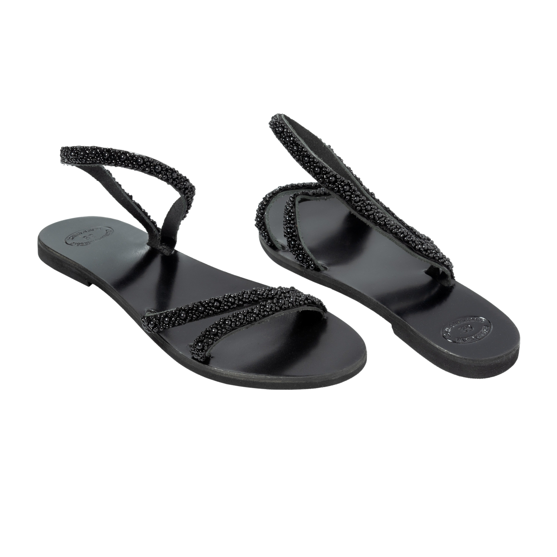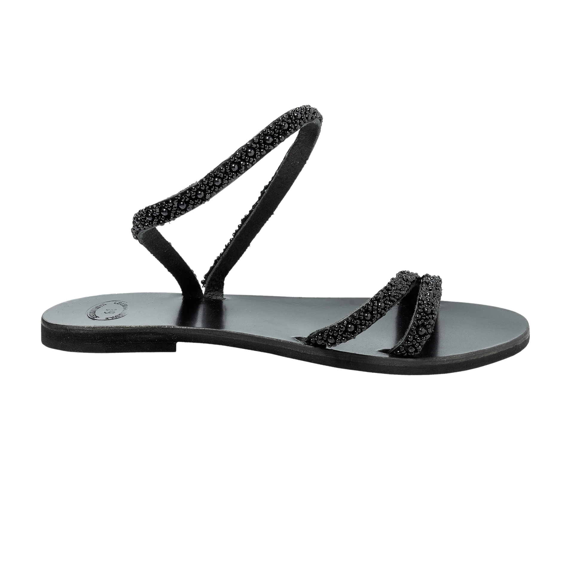 A black sandal with a single looped strap around the ankle and two thin upper straps, embellished with small decorative elements.