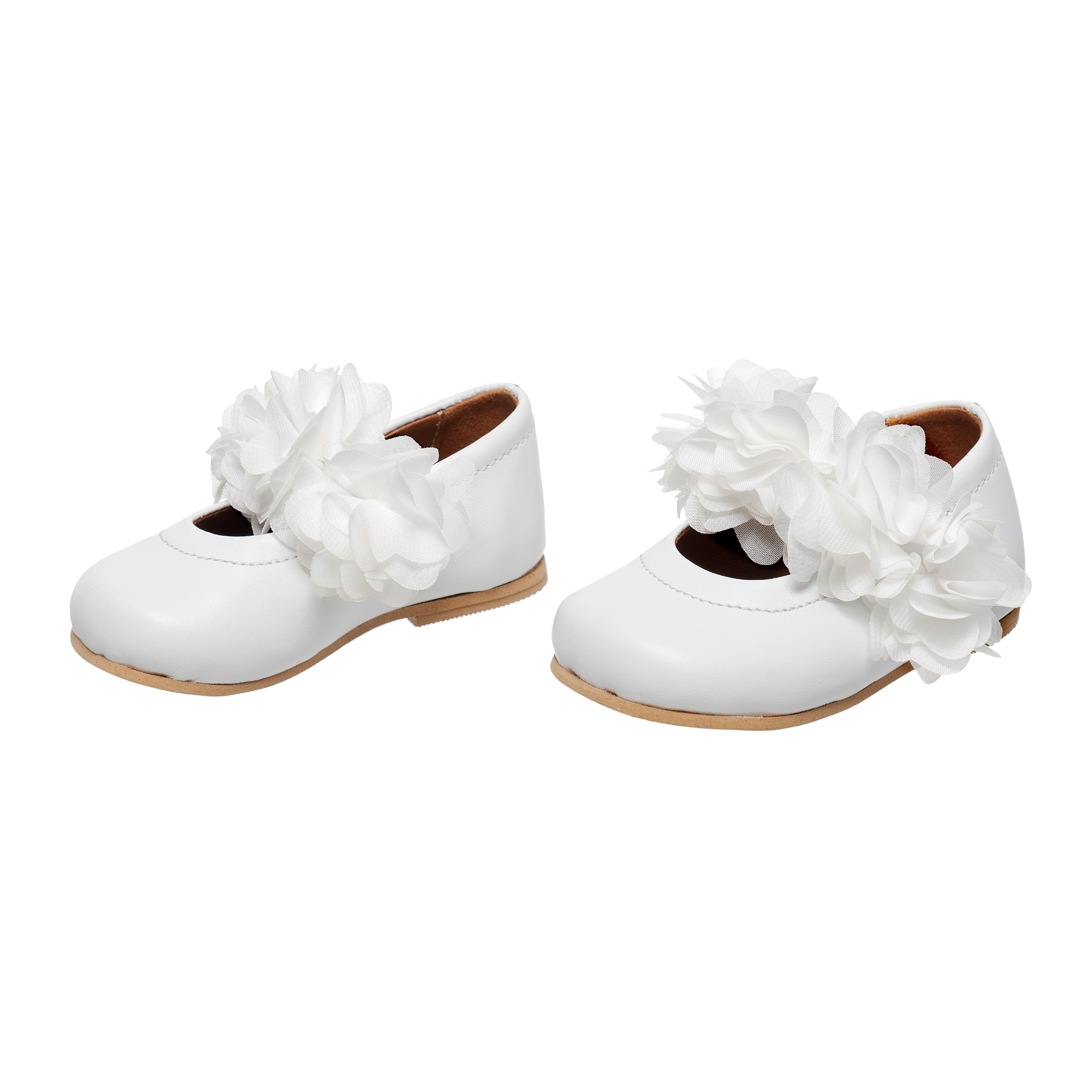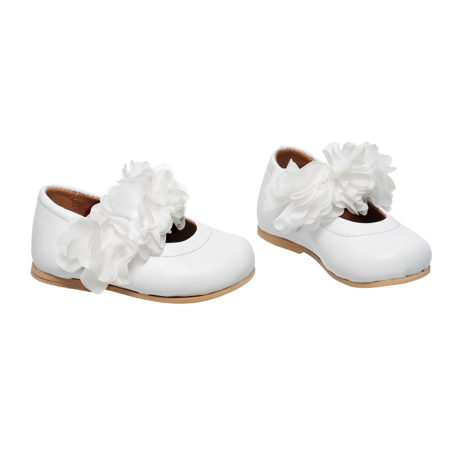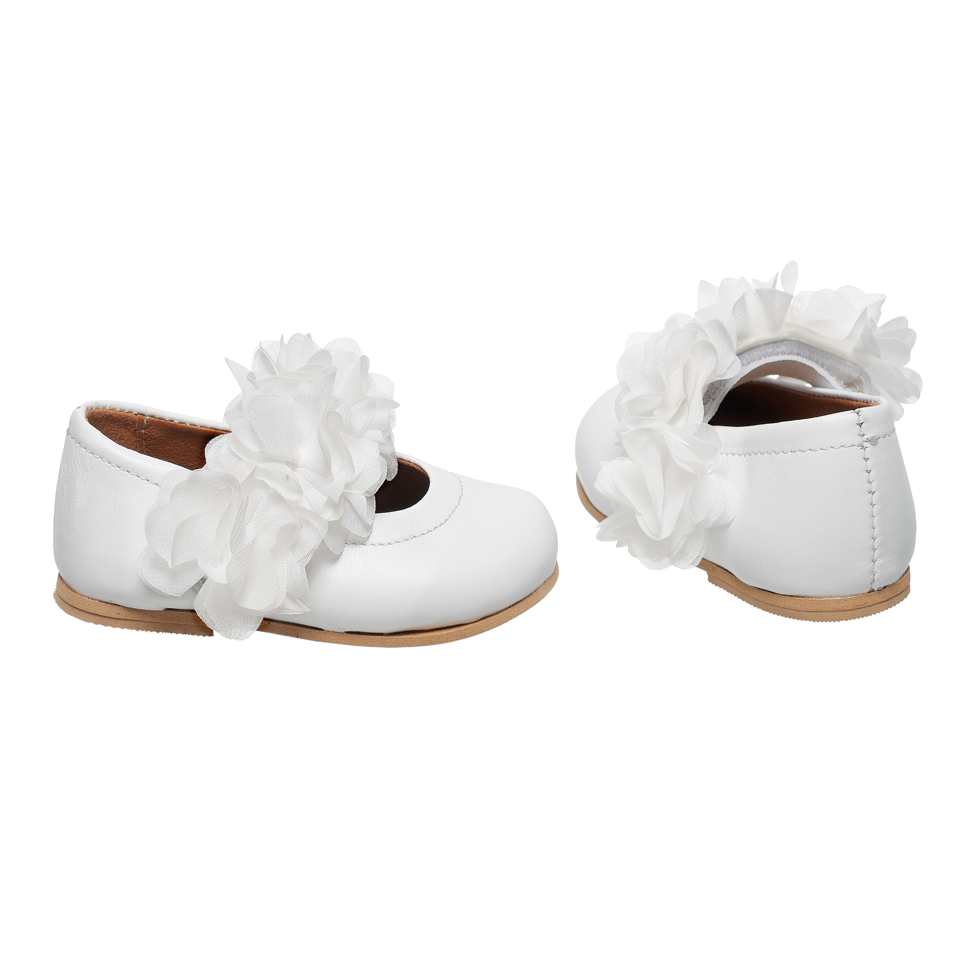 Handcrafted in Athens, Greece, these ballerina shoes for kids feature genuine leather uppers adorned with delicate fabric flowers in white. They boast genuine leather insoles for comfort and durability, while the anti-slip rubber sole ensures stability and safety.