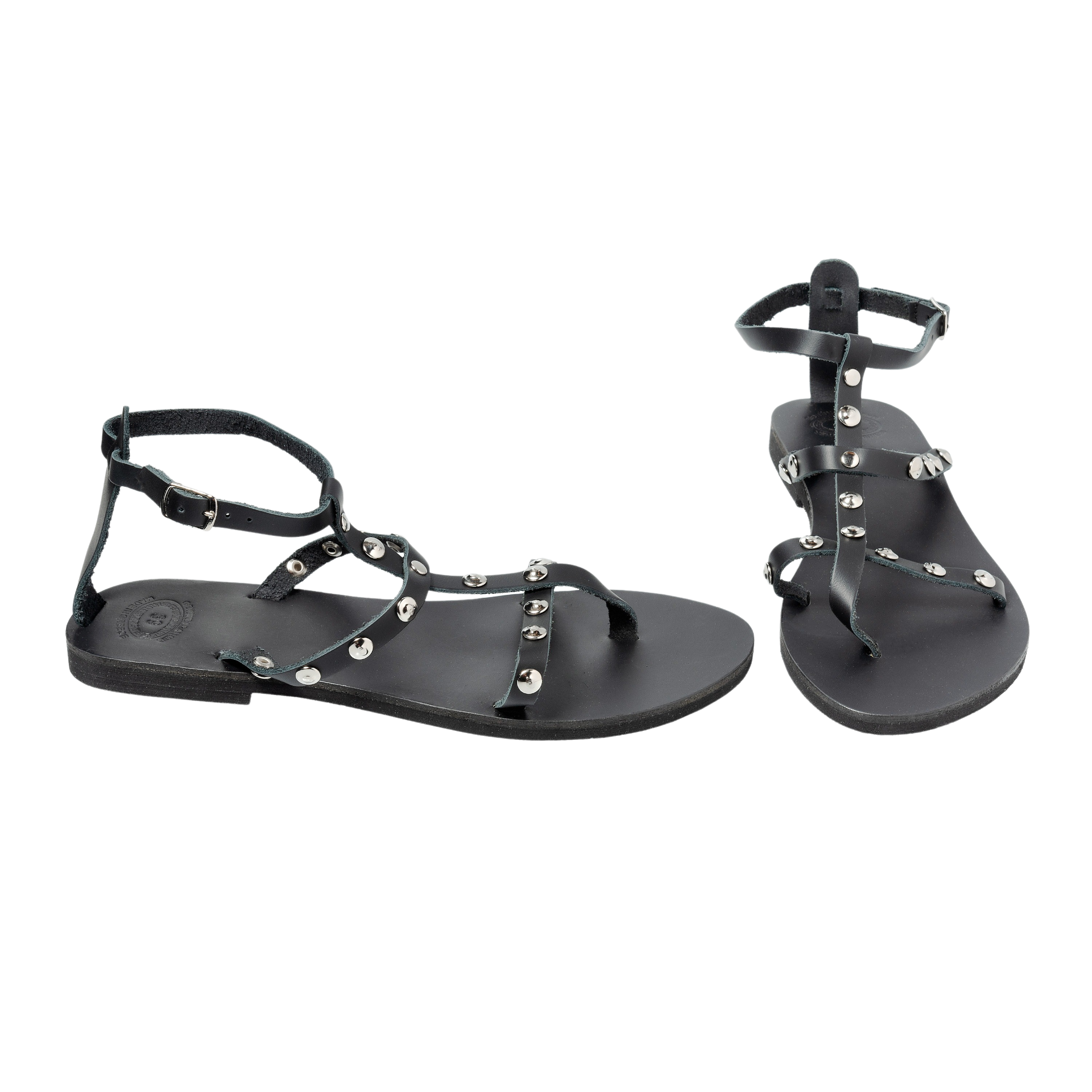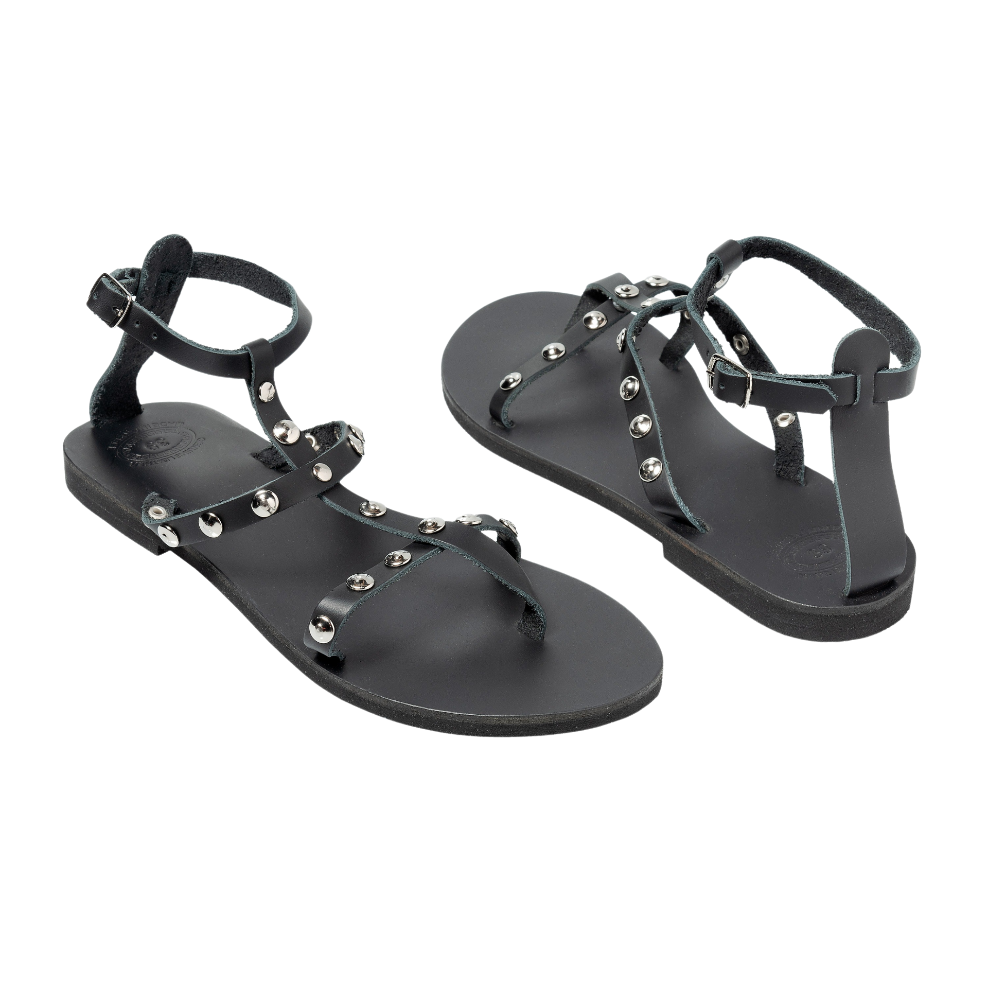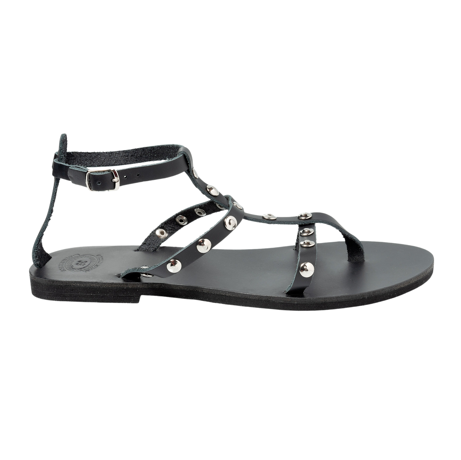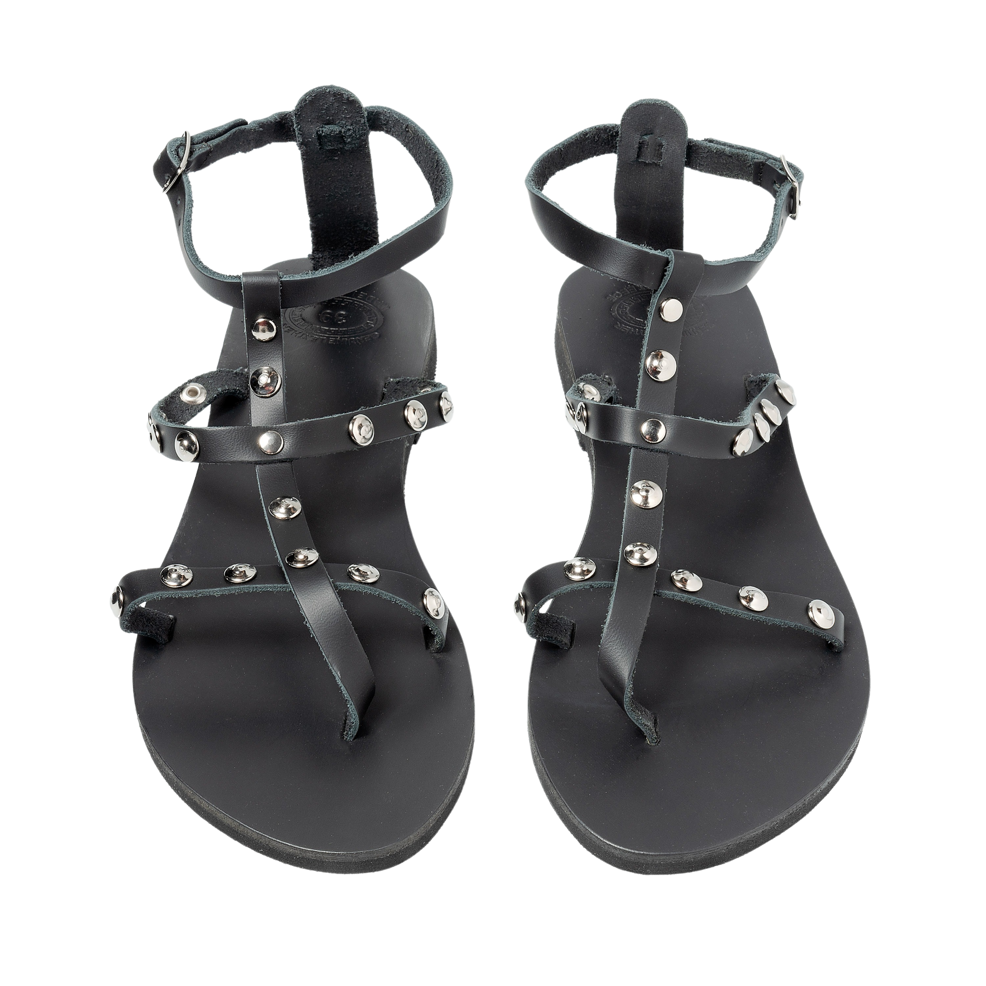 A black sandal featuring multiple thin straps, including one around the ankle and several on the upper foot, with metallic studs as embellishments.